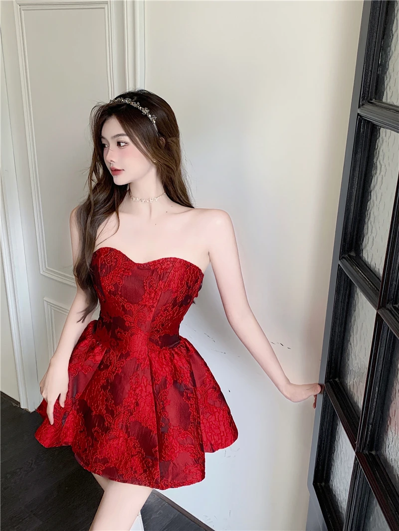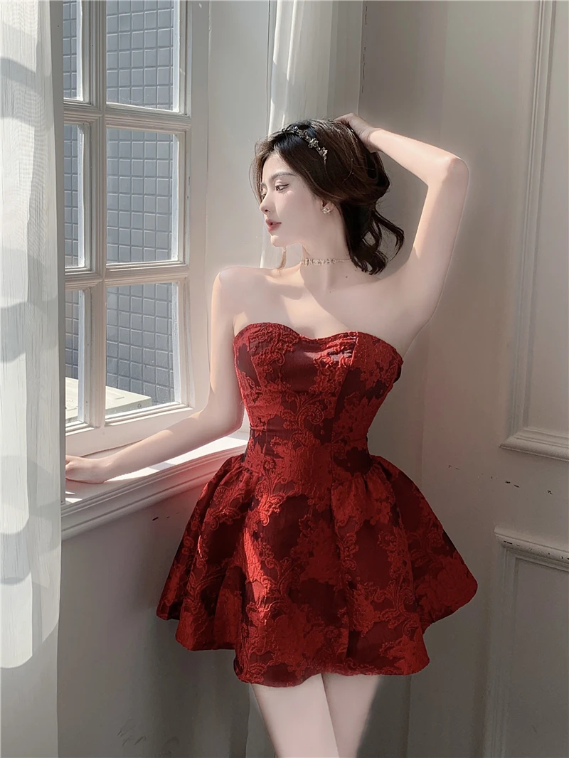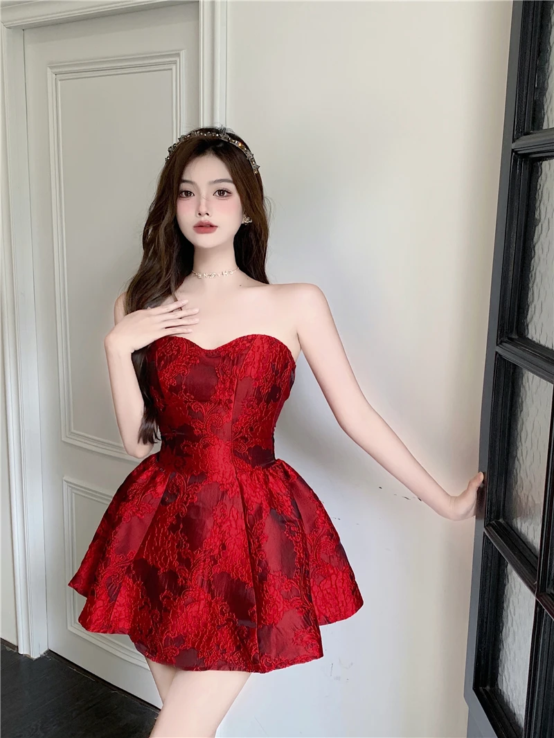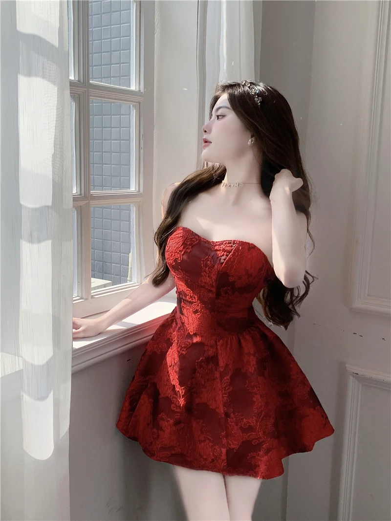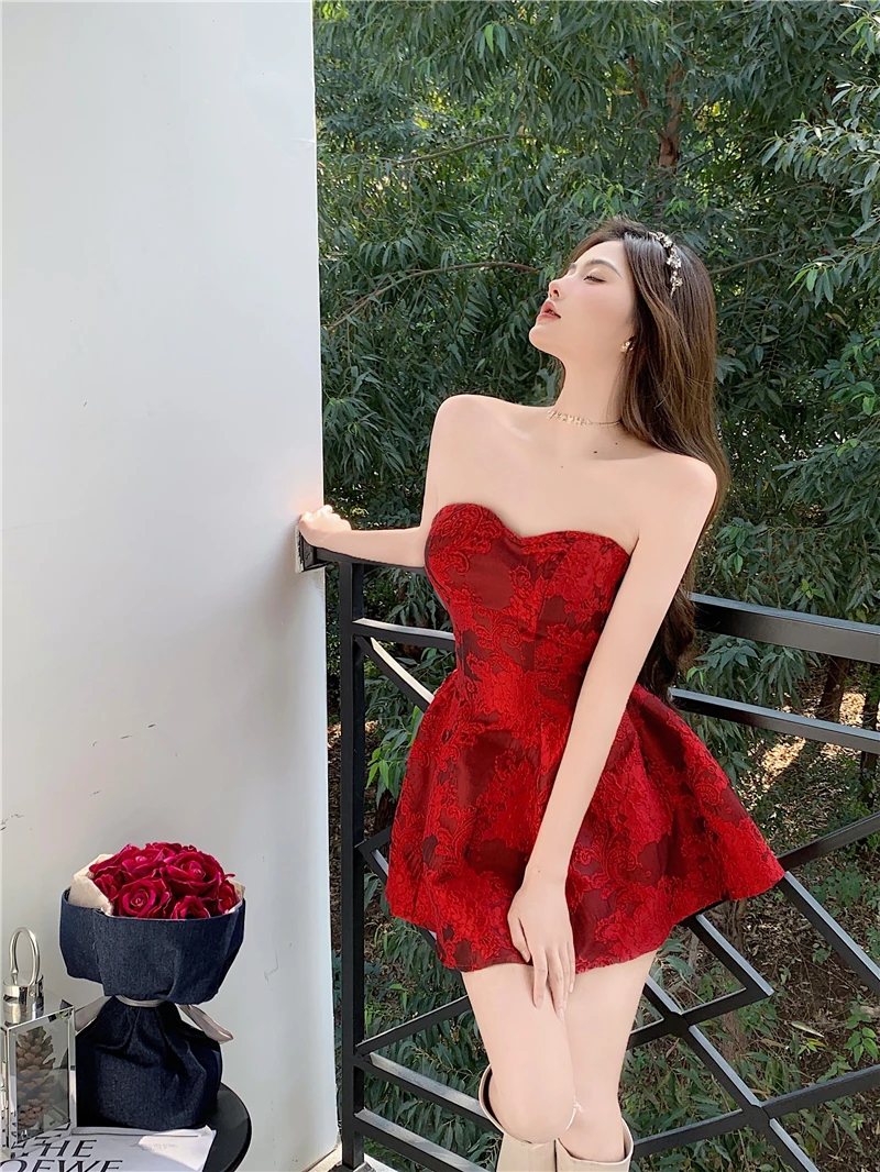 MQTIME - Chinese New Year Red Print Design Sensual Puffy Dr Sexy mid Waist ort Skirt without Sve One oulder A-Line Dr