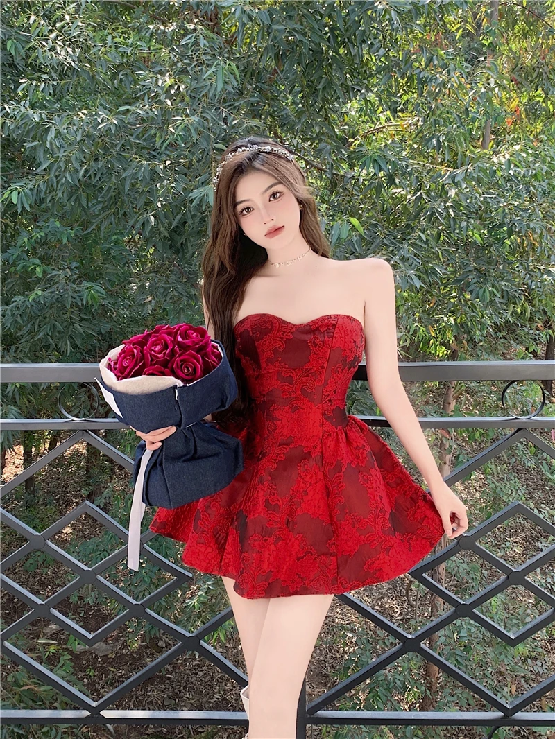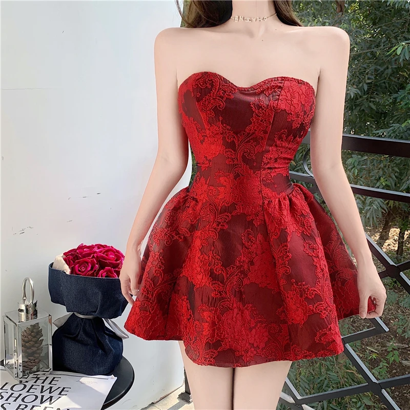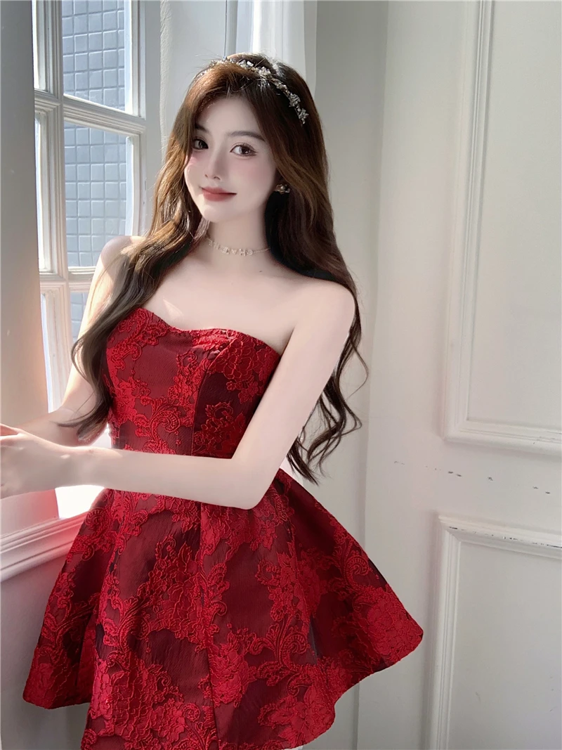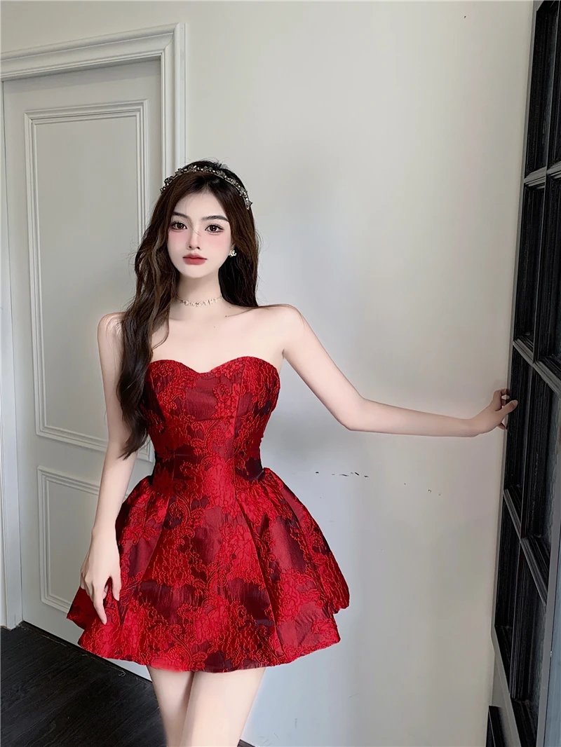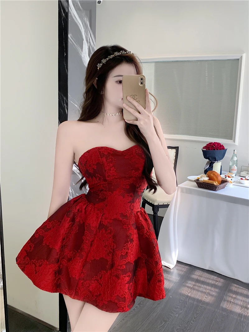 MQTIME - Chinese New Year Red Print Design Sensual Puffy Dr Sexy mid Waist ort Skirt without Sve One oulder A-Line Dr