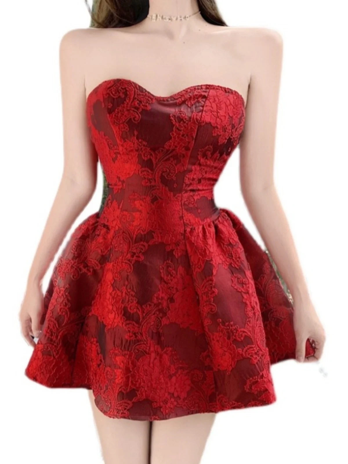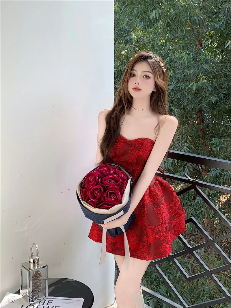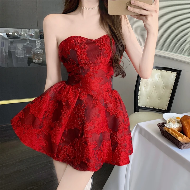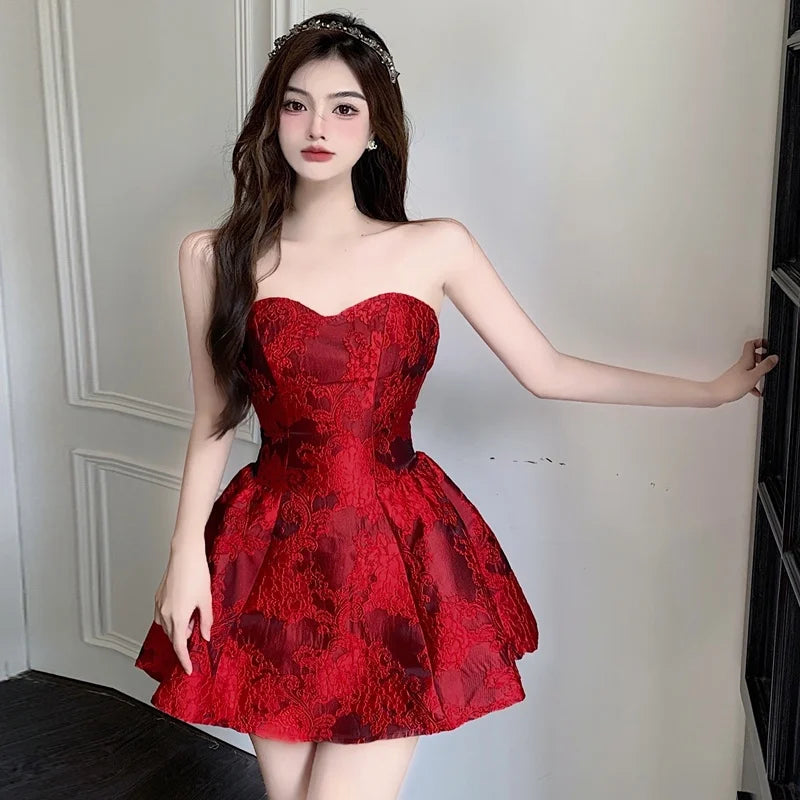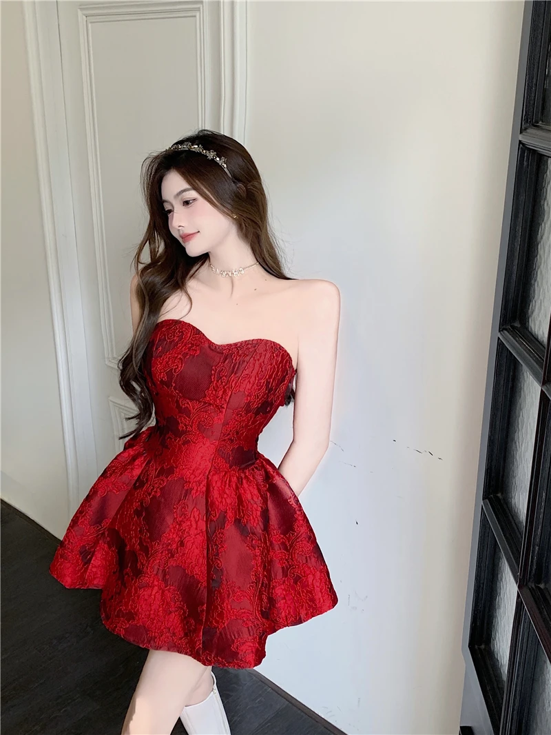 MQTIME - Chinese New Year Red Print Design Sensual Puffy Dr Sexy mid Waist ort Skirt without Sve One oulder A-Line Dr