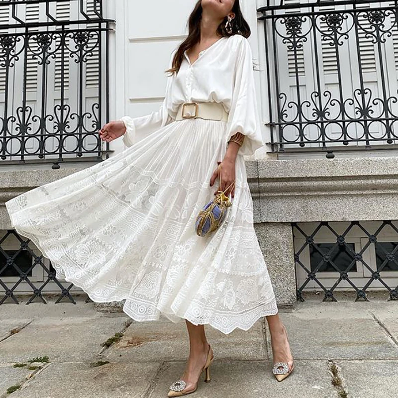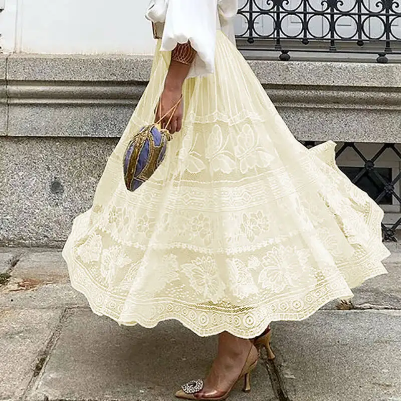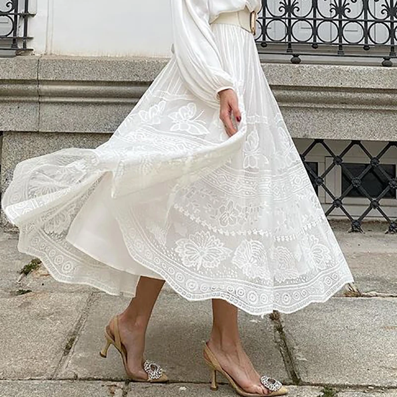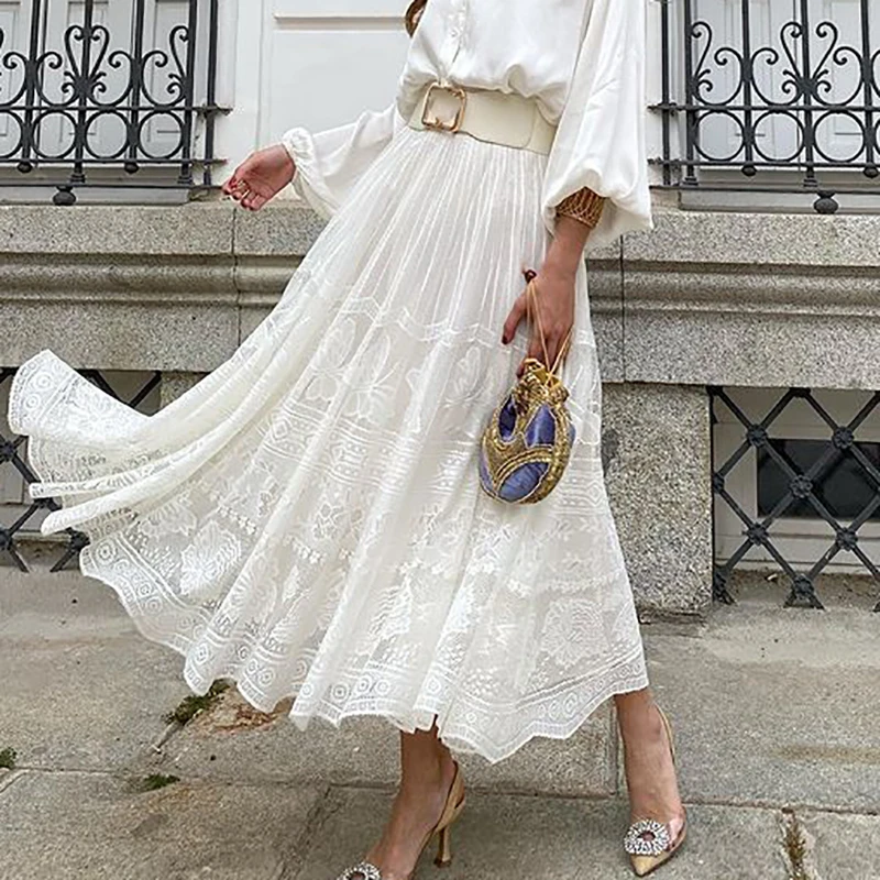 MQTIME - Club Lady Lace-Mesh Pleated A-Line Skirt Elegant White Hem Loose Jacquard Skirt for Women 2024 Spring High Waist Long Skirts