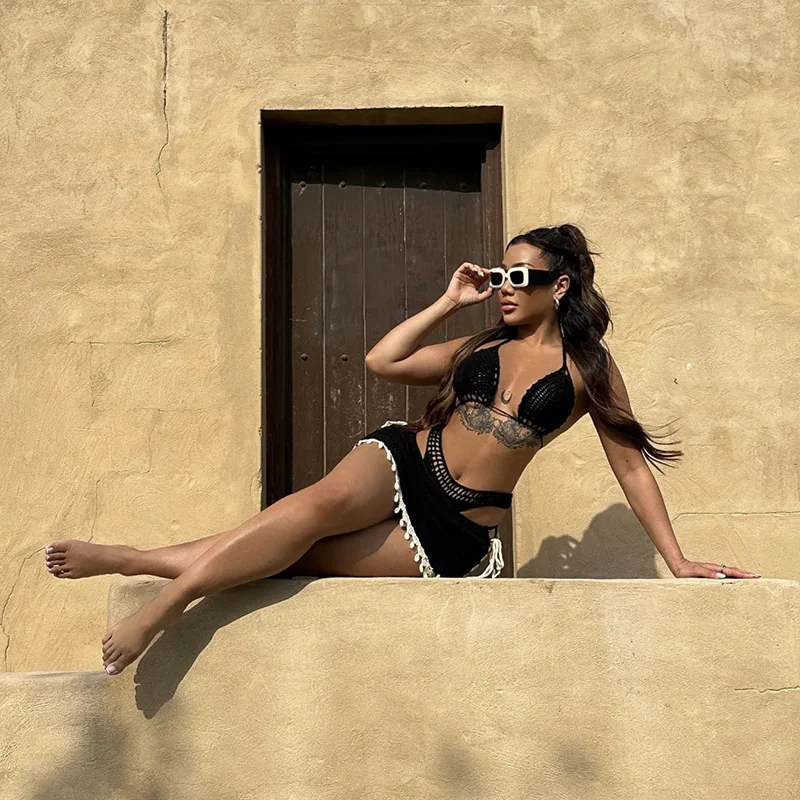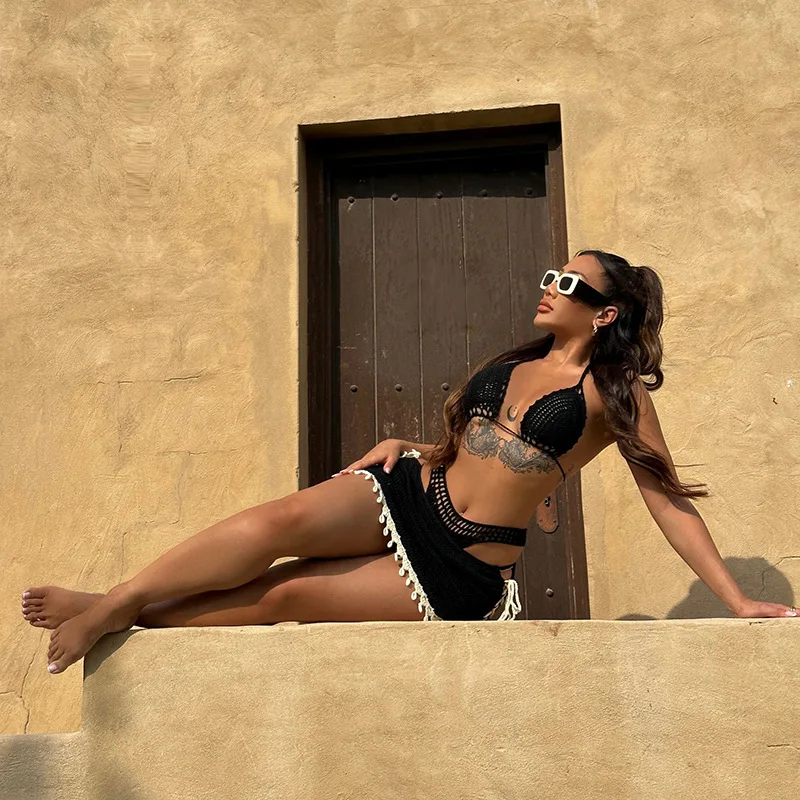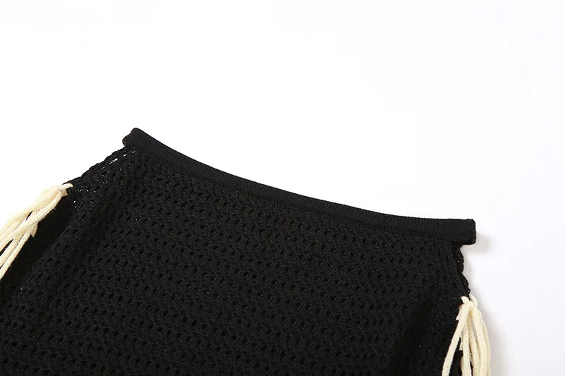 MQTIME  -  Crochet Knitted 2 Piece Dress Sets Women Sexy Hollow Out Lace Up Bra Top Tassel Bandage Mini Skirts Summer Beach Clothing Suits