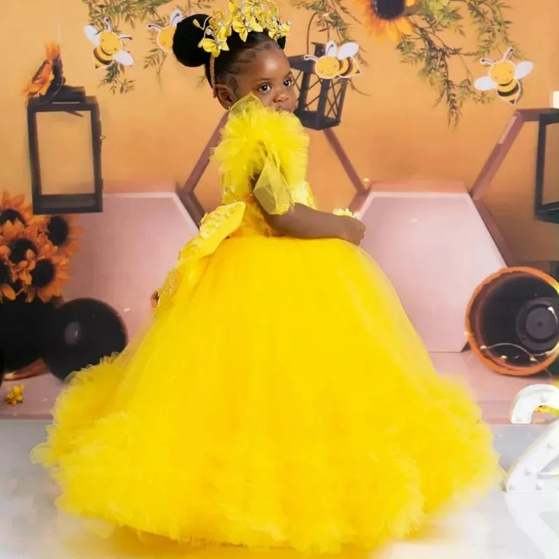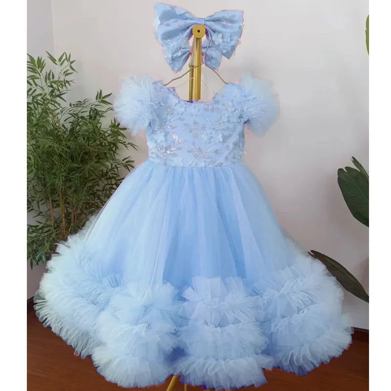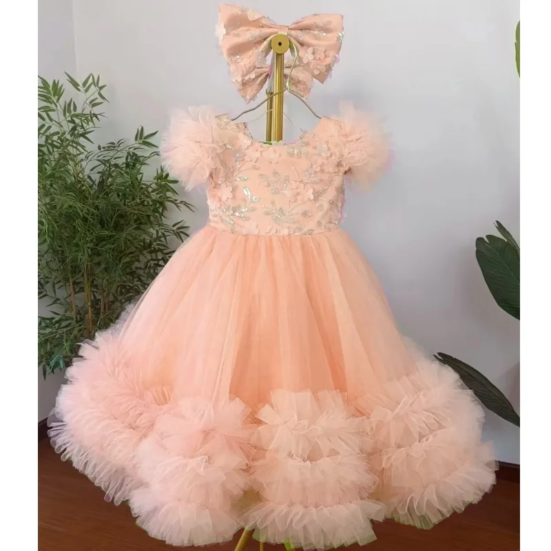 MQTIME - Customized Blush Flower Girl Dresses Tulle Flory Aplliques With Bow Short Sleeve For Wedding Birthday Prom Holy Communion Gowns