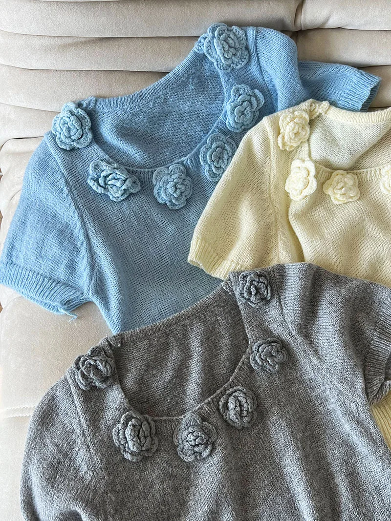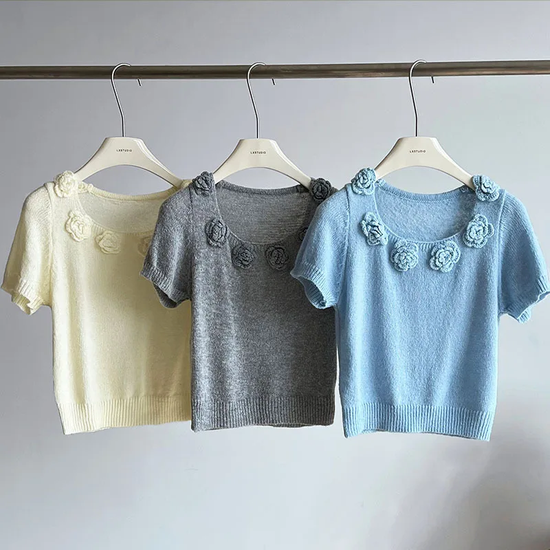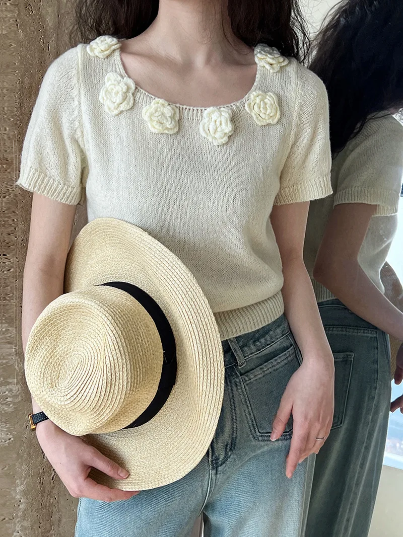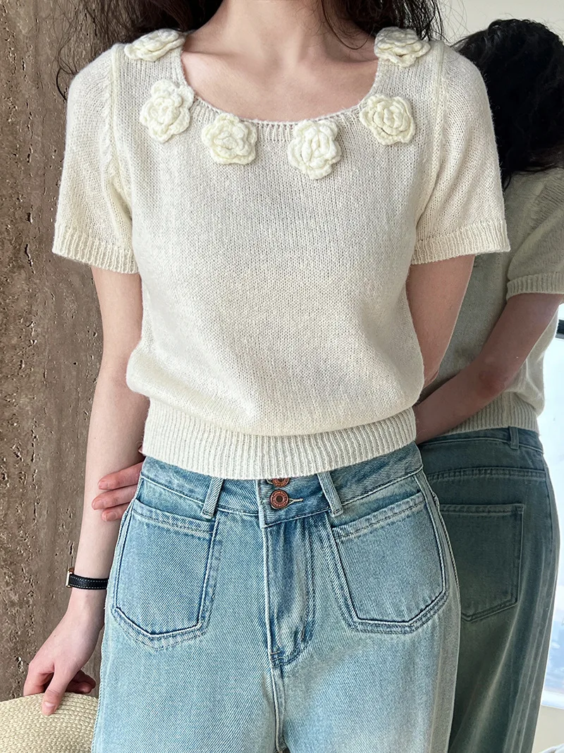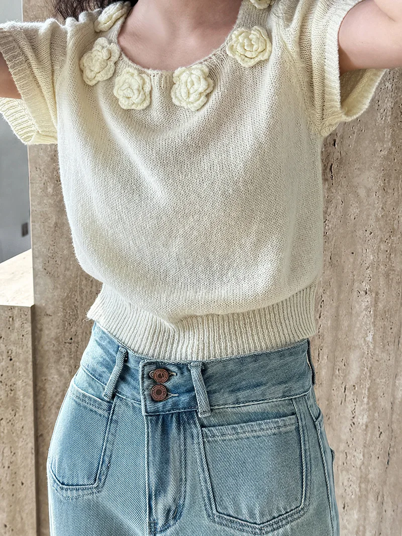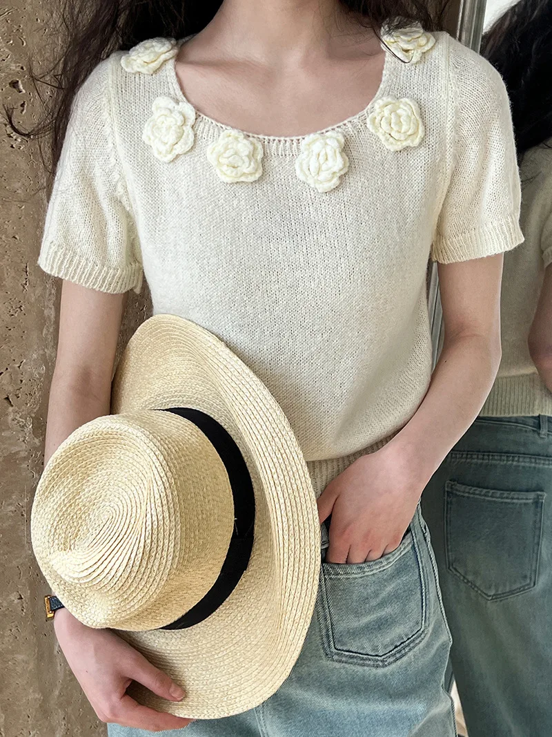 MQTIME - Cute 3d Hook Flower Short Sleeve Sweater Round Neck Knitwear for Women's 2024 Spring/summer