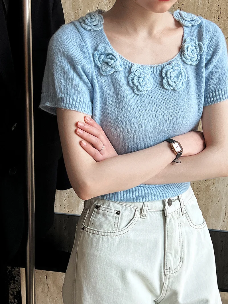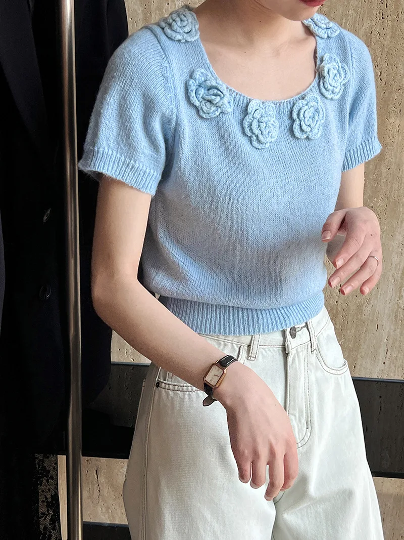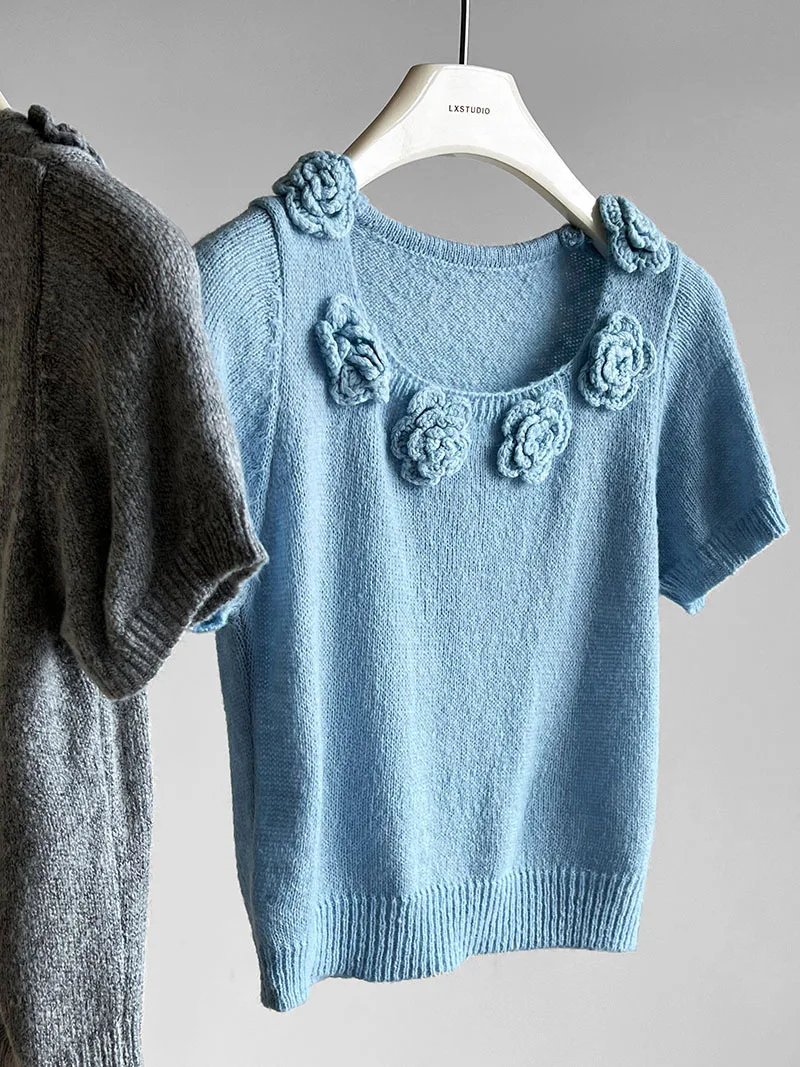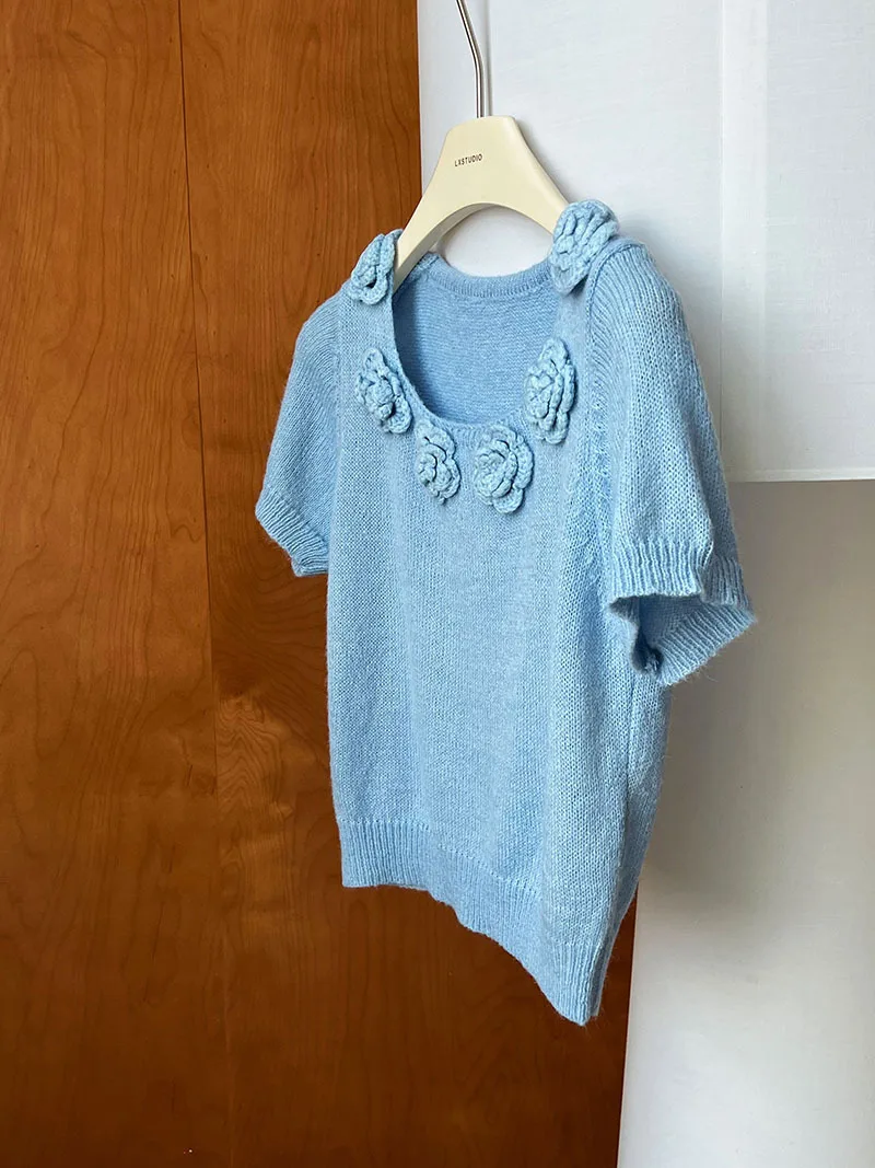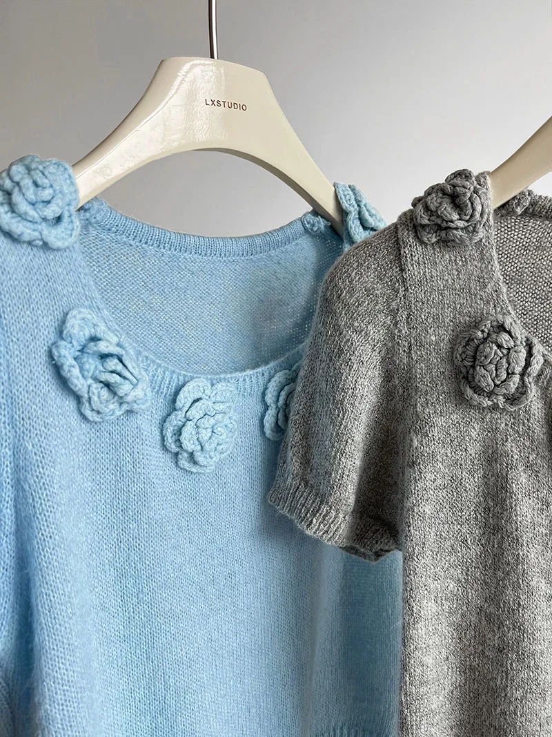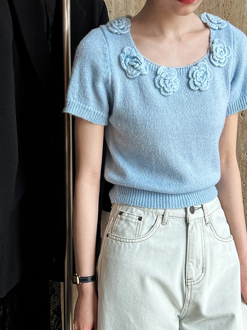 MQTIME - Cute 3d Hook Flower Short Sleeve Sweater Round Neck Knitwear for Women's 2024 Spring/summer