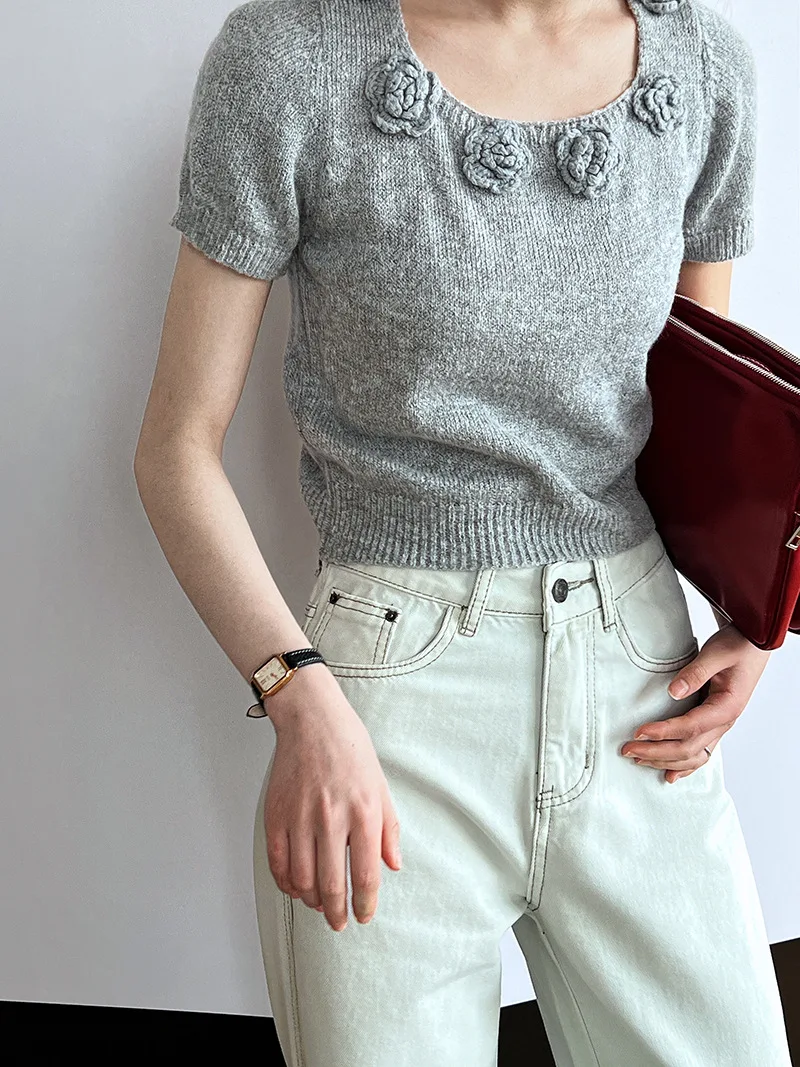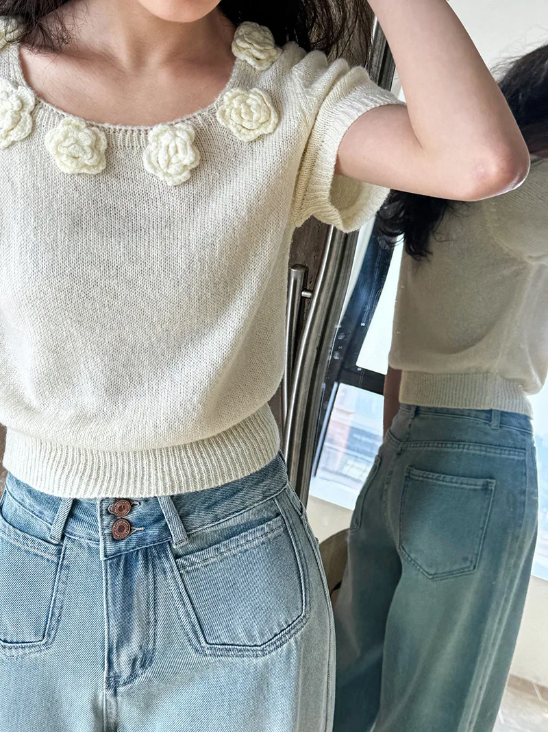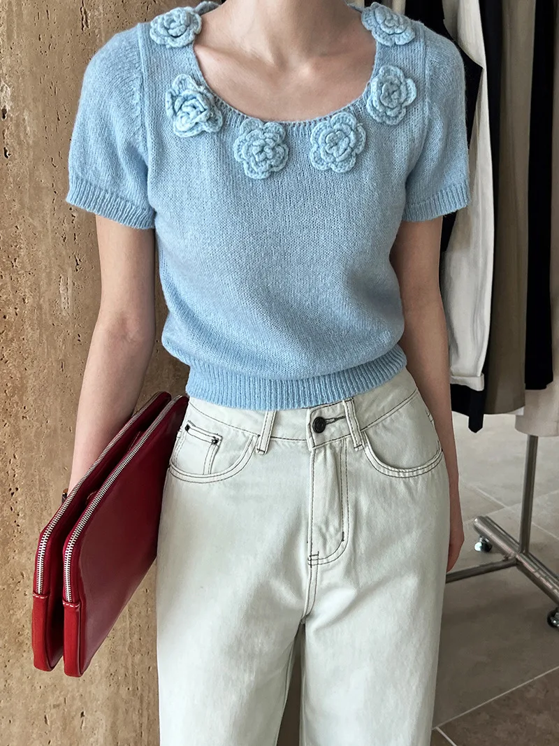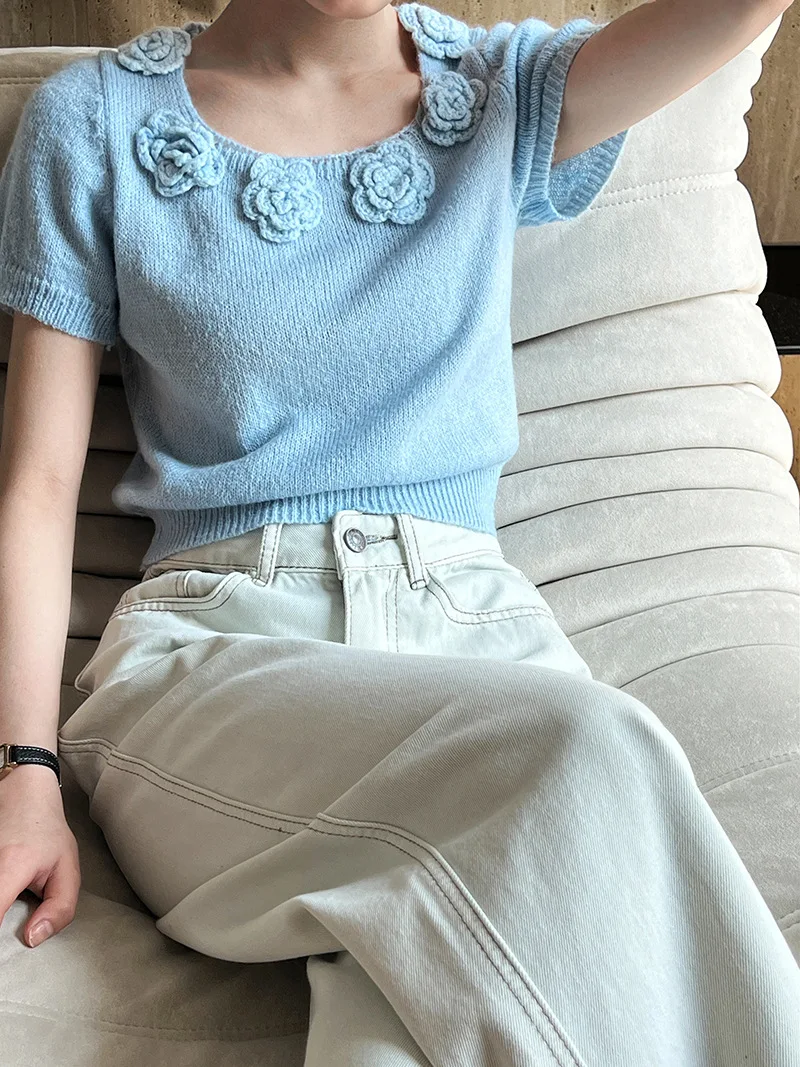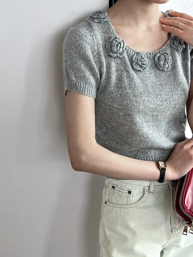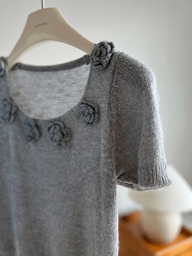 MQTIME - Cute 3d Hook Flower Short Sleeve Sweater Round Neck Knitwear for Women's 2024 Spring/summer