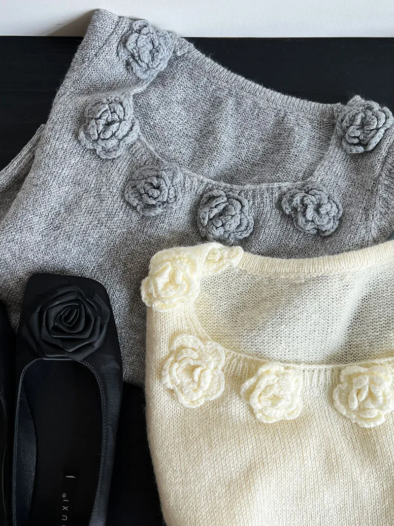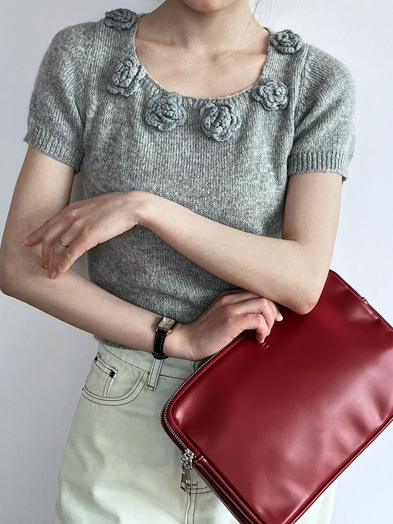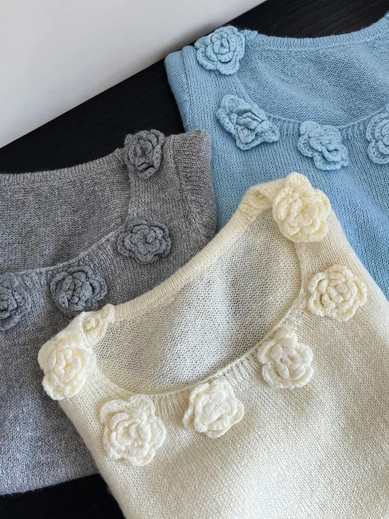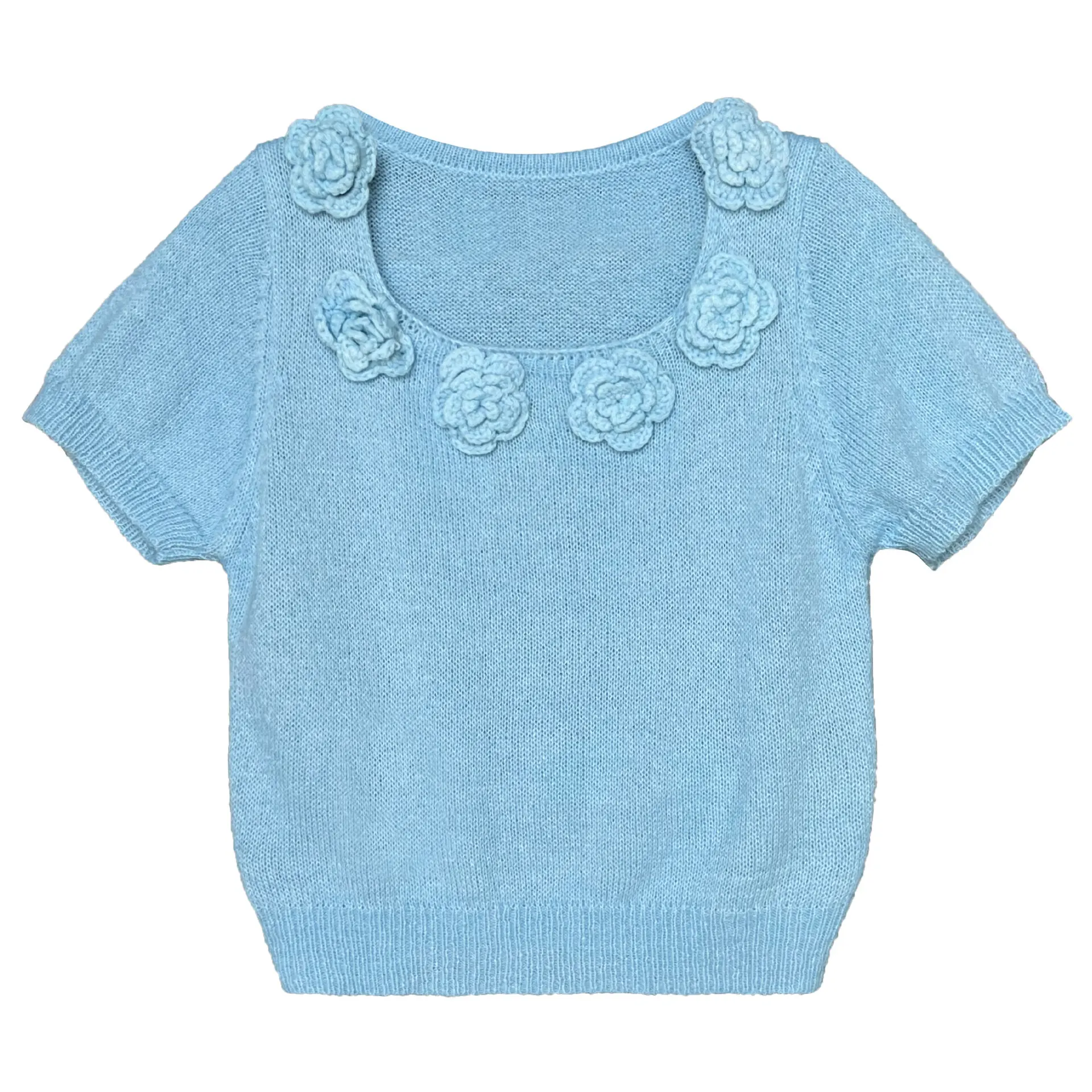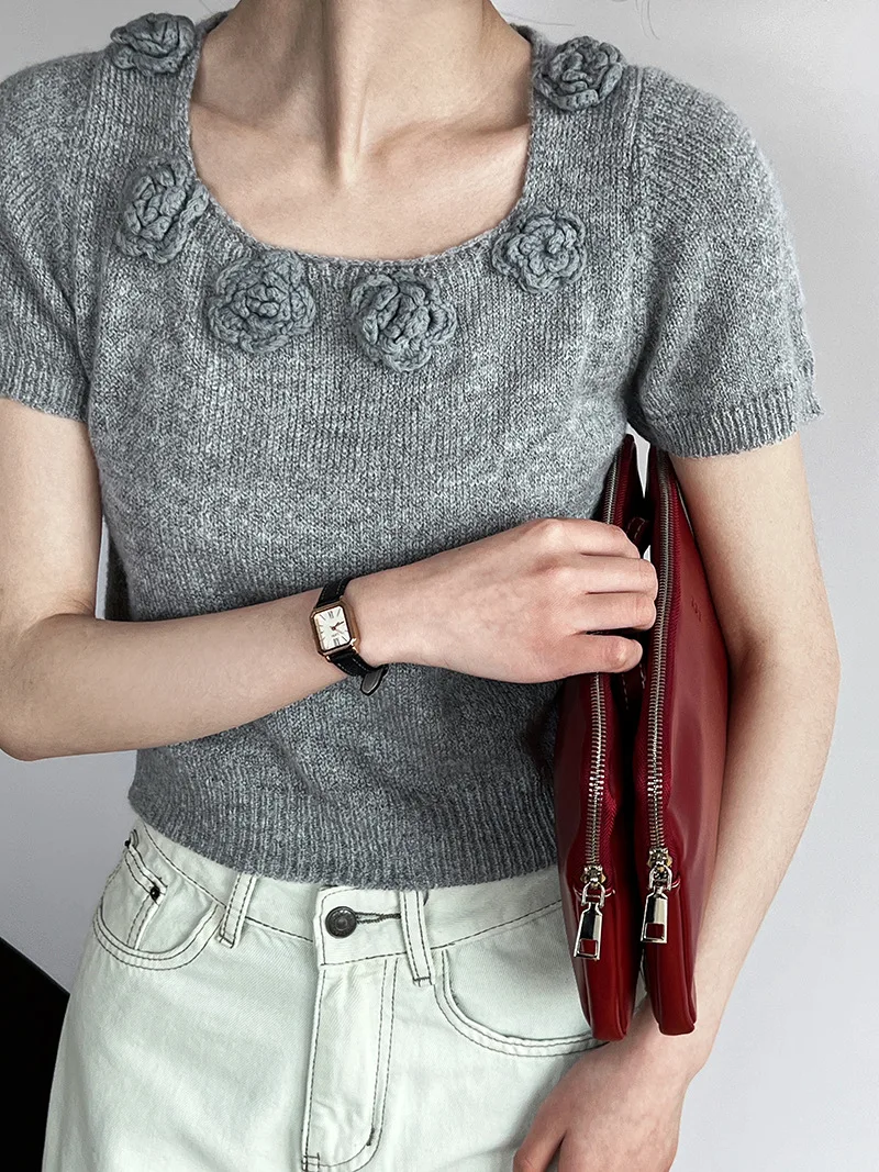 MQTIME - Cute 3d Hook Flower Short Sleeve Sweater Round Neck Knitwear for Women's 2024 Spring/summer