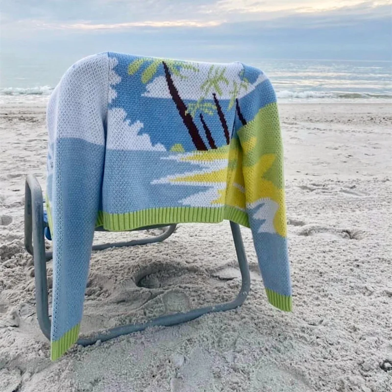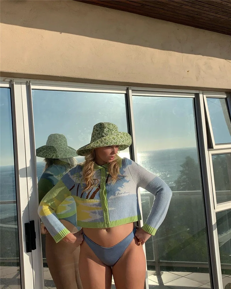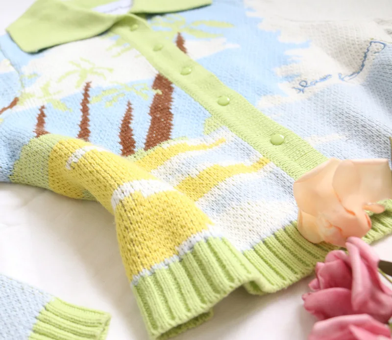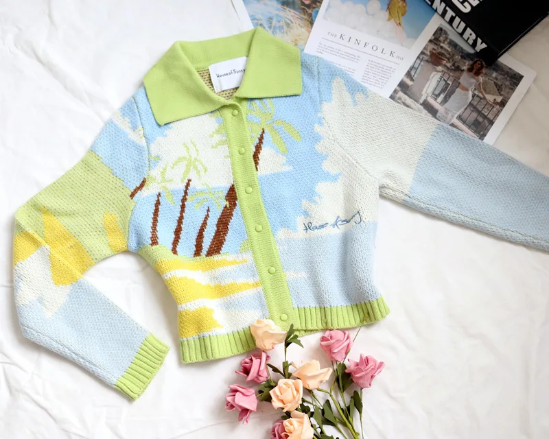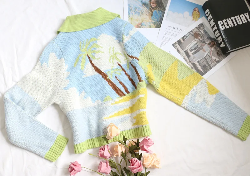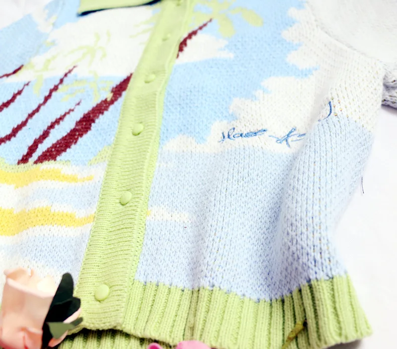 MQTIME  -  Cute Knitted Cardigan Women Autumn New Coconut Sky Cloud Parttern Short Sweater Seaside Holiday Style Slim Blue Green Cardigan