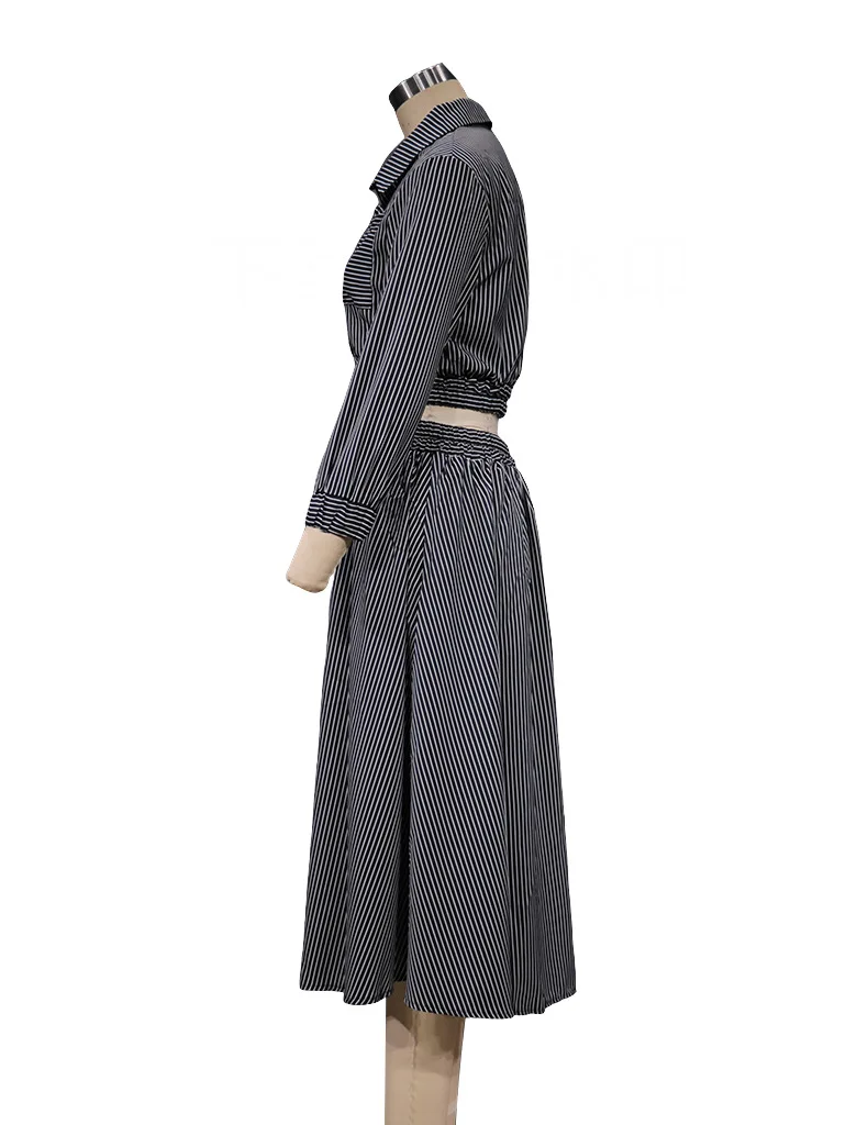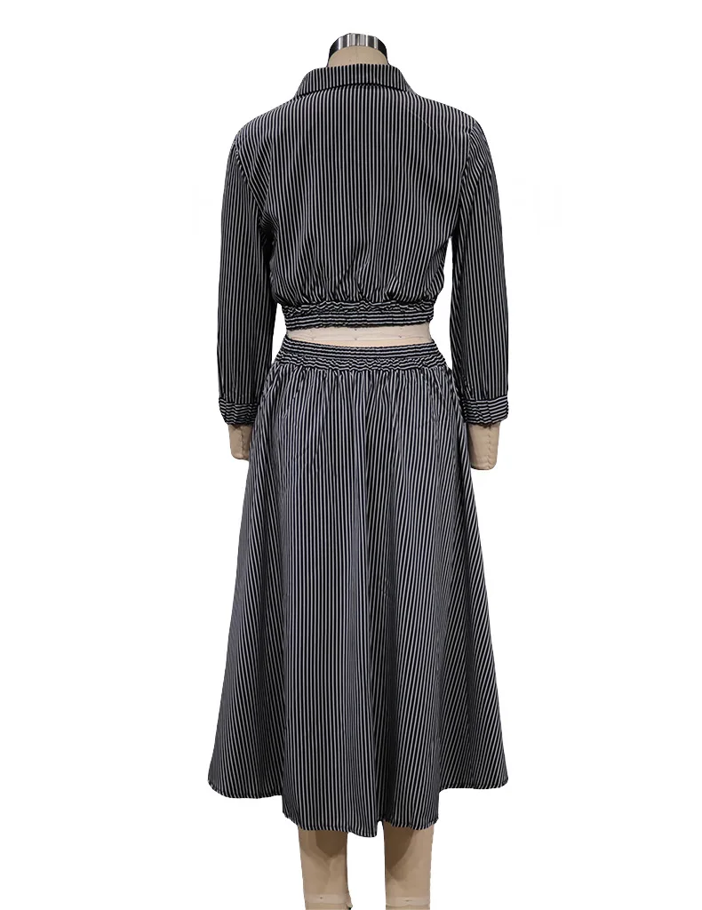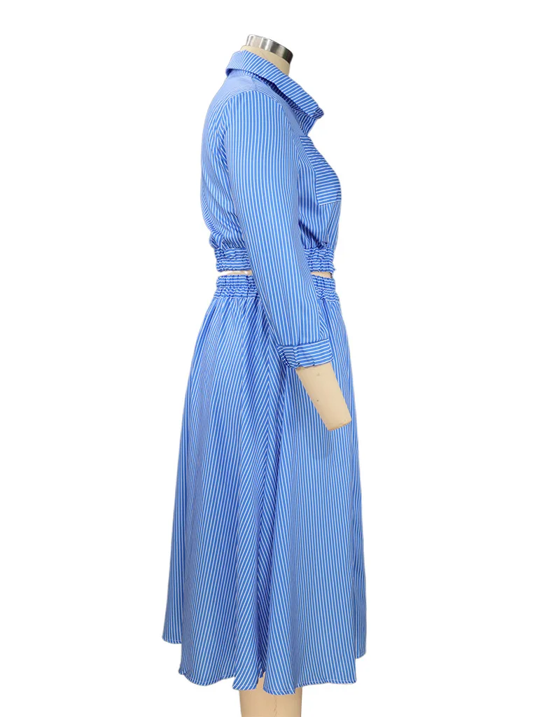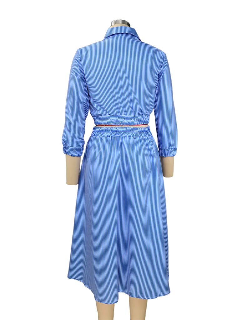 MQTIME - Elegant Blue Stripe Skirt Sets for Women 2 Pieces Fashion Long Sleeve Button Short Shirt and High Waist Pleated Skirts