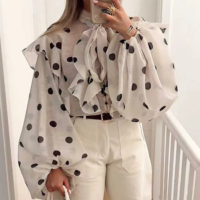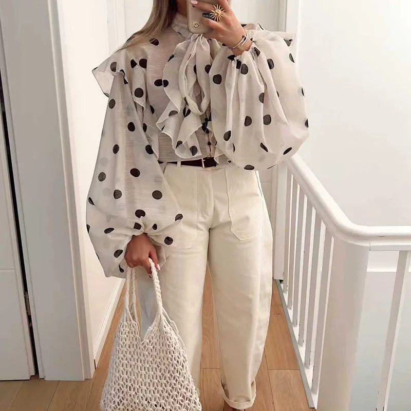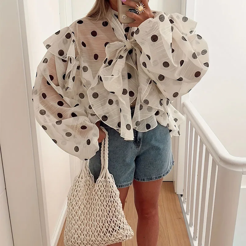 MQTIME - Elegant Classic Lace-Up Tops Female Clothing Fashion Loose Polka Dot Print Women's Blouse Casual Lapel Puff Sleeve Office Shirts
