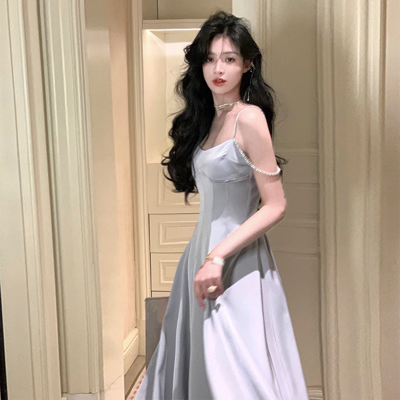 MQTIME - Elegant Diamond Chain Satin Dress Women Slim A-line Vintage Evening Party Dresses Ladies Summer Beach Long Robe