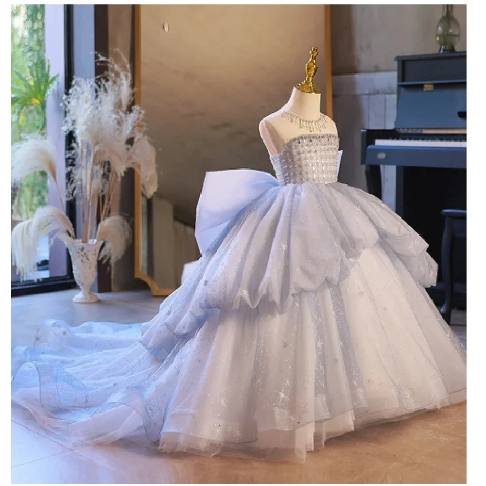 MQTIME - Elegant Flower Girl Dress For Wedding Sparkle Tulle Puffy Pearl Sleeveless Beaded Kids Birthday Party First Communion Ball Gowns
