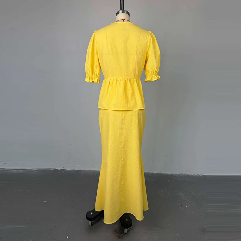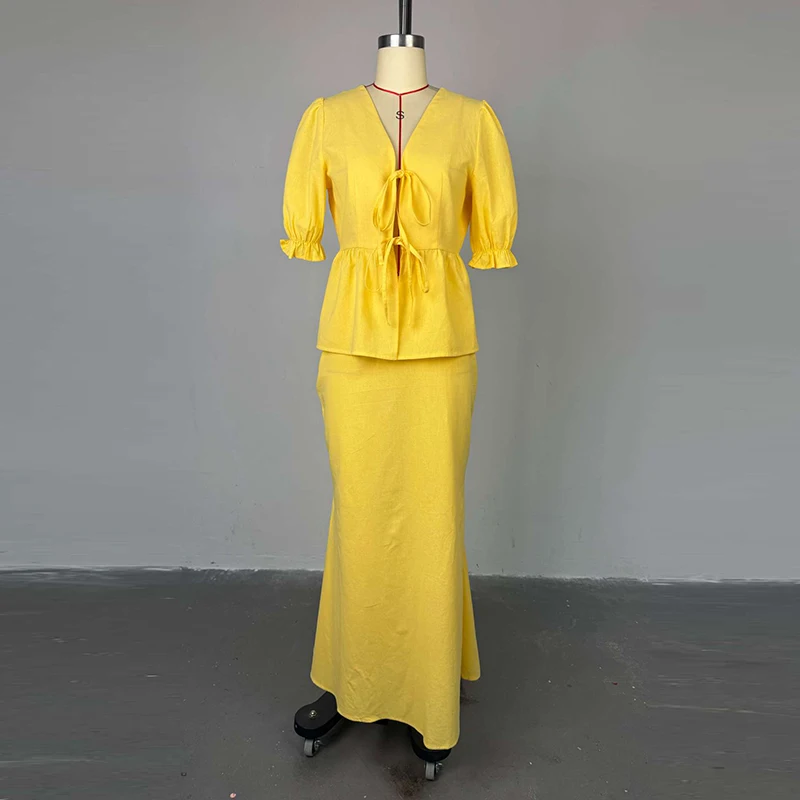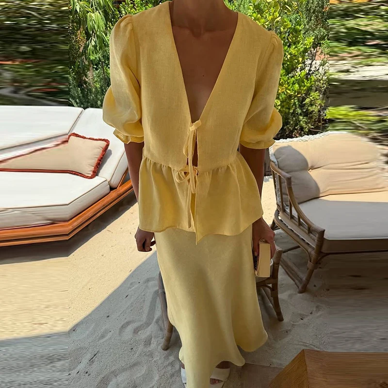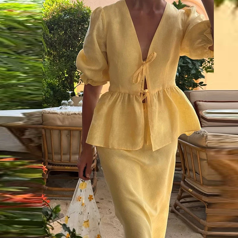 MQTIME - Elegant High Waist Holiday Outfit 2025 New Women's V Neck Lace Up Top + Long Skirt Suit Sweet Casual Puff Sleeves Two Piece Set