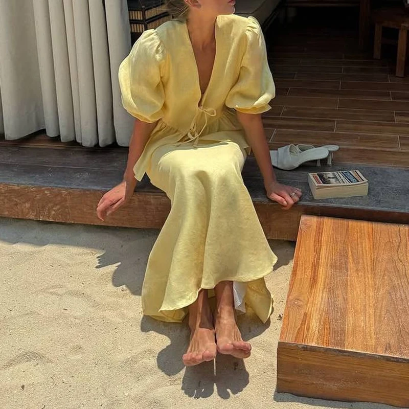 MQTIME  -  Elegant High Waist Holiday Outfit 2025 New Women's V Neck Lace Up Top + Long Skirt Suit Sweet Casual Puff Sleeves Two Piece Set