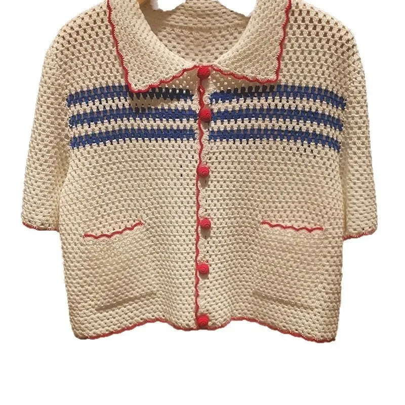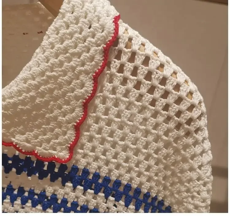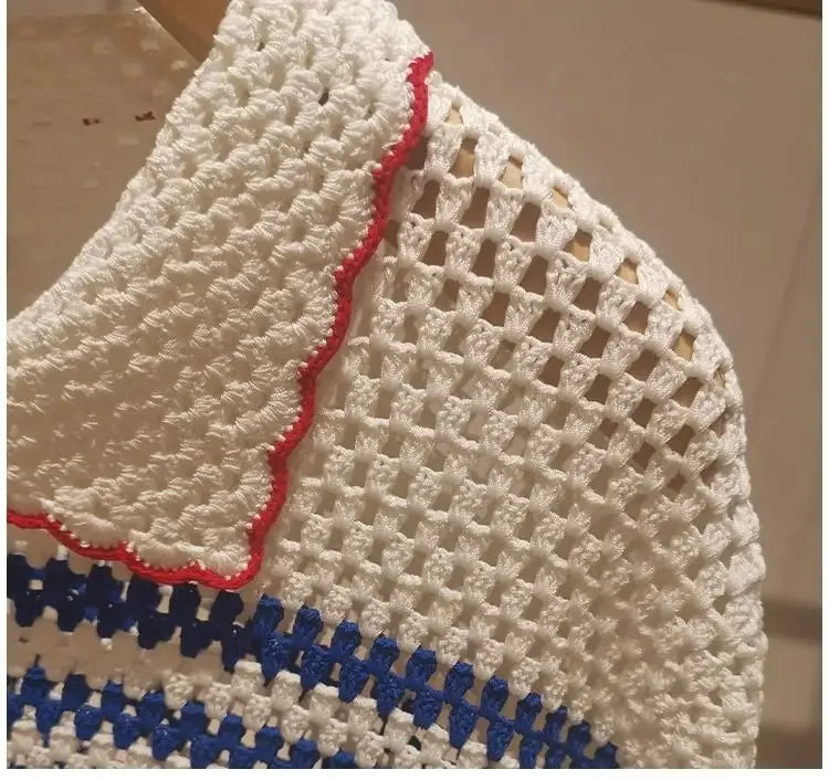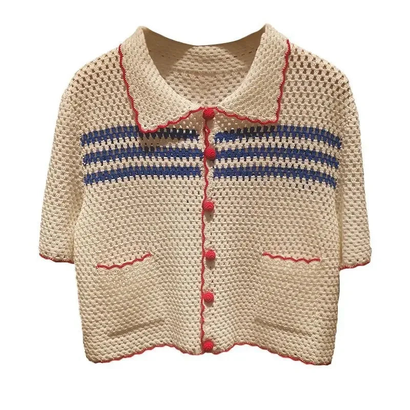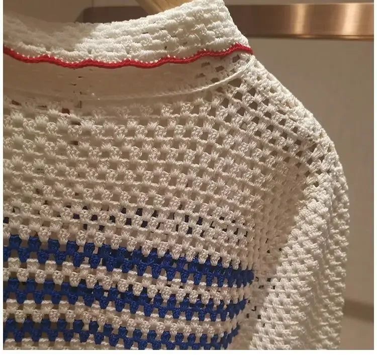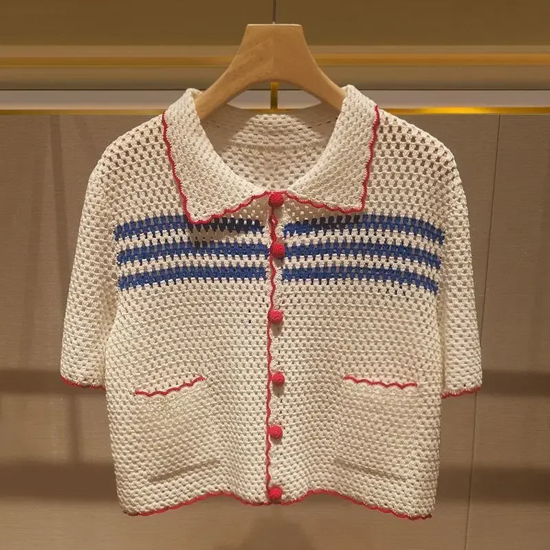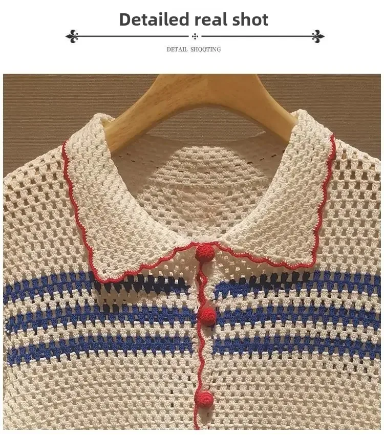 MQTIME - Elegant Hollow out Knitwear Polo Collar Short Style Summer New Arrival Women's Fashion Light Weight Polyester Fiber Top