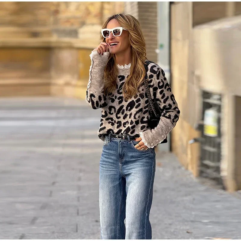 MQTIME - Elegant Lace Patchwork Leopard Women Sweater O-neck Long Sleeve Contrast Street Pullover 2025 Autumn New Lady Casual Knitwears