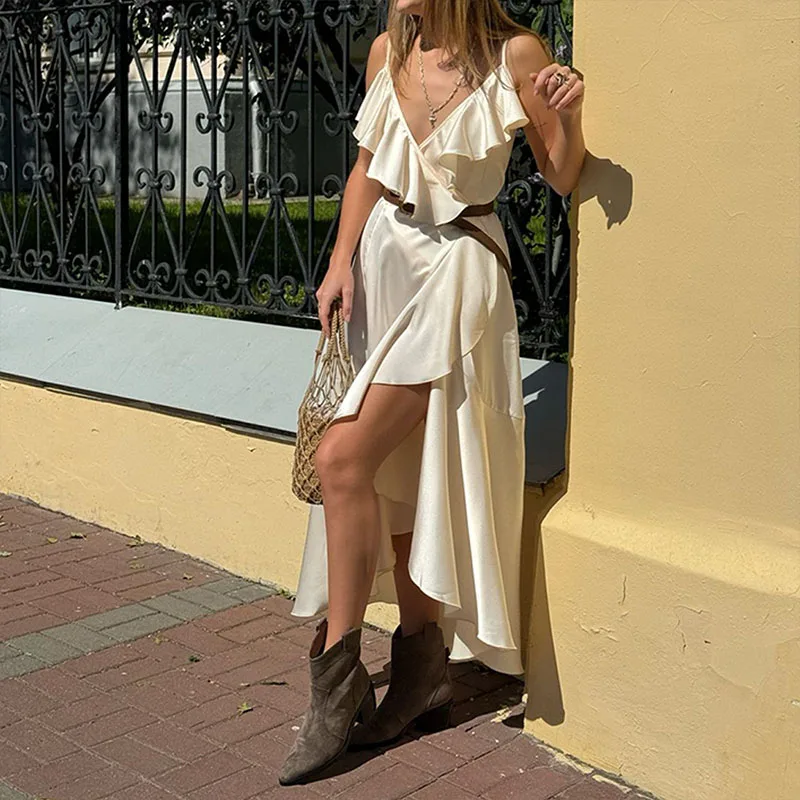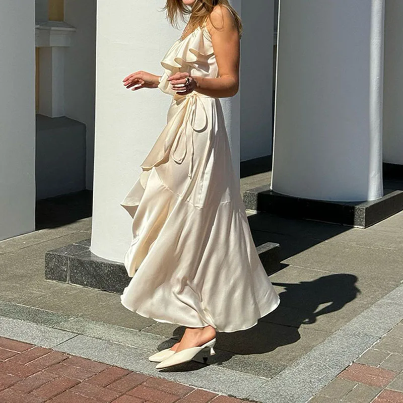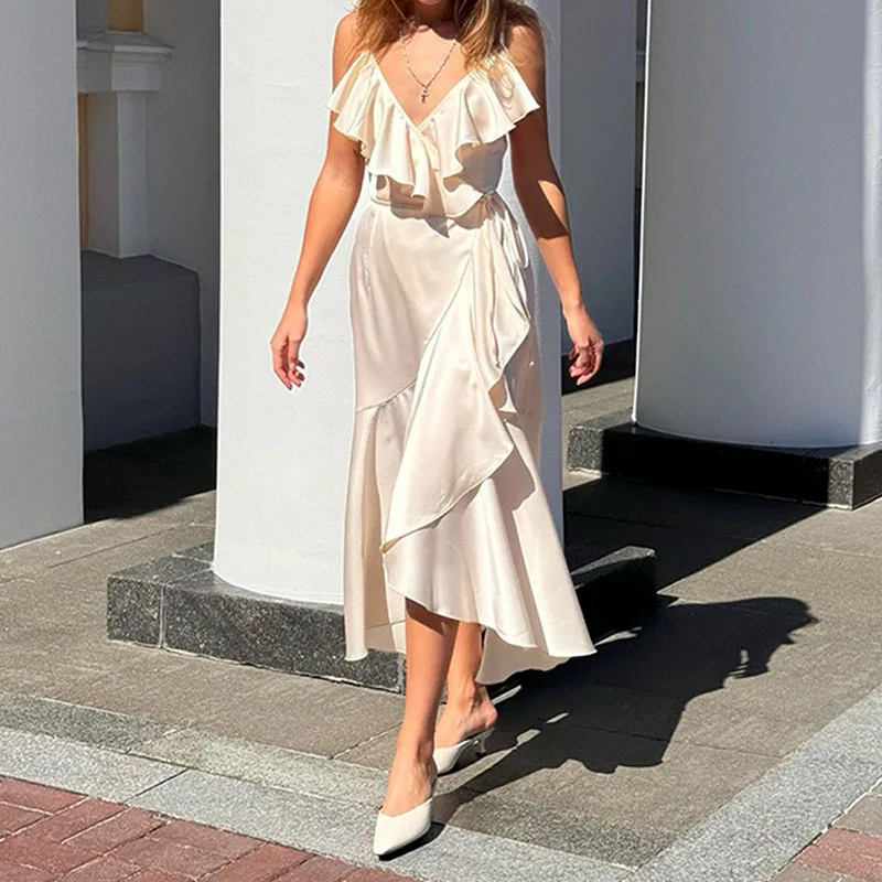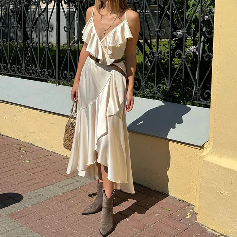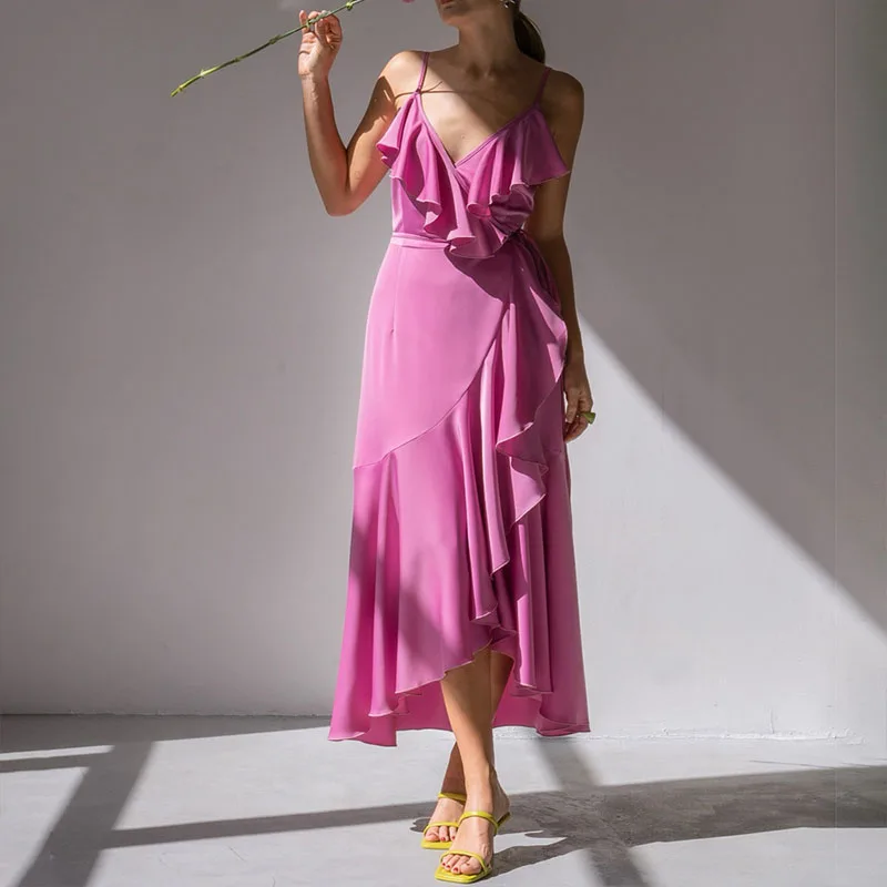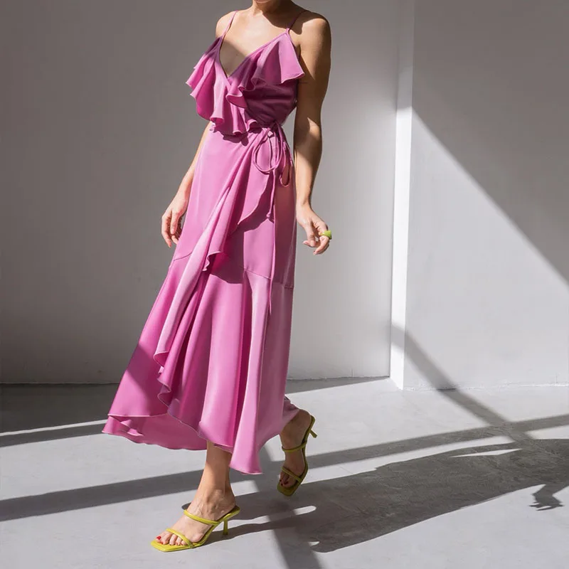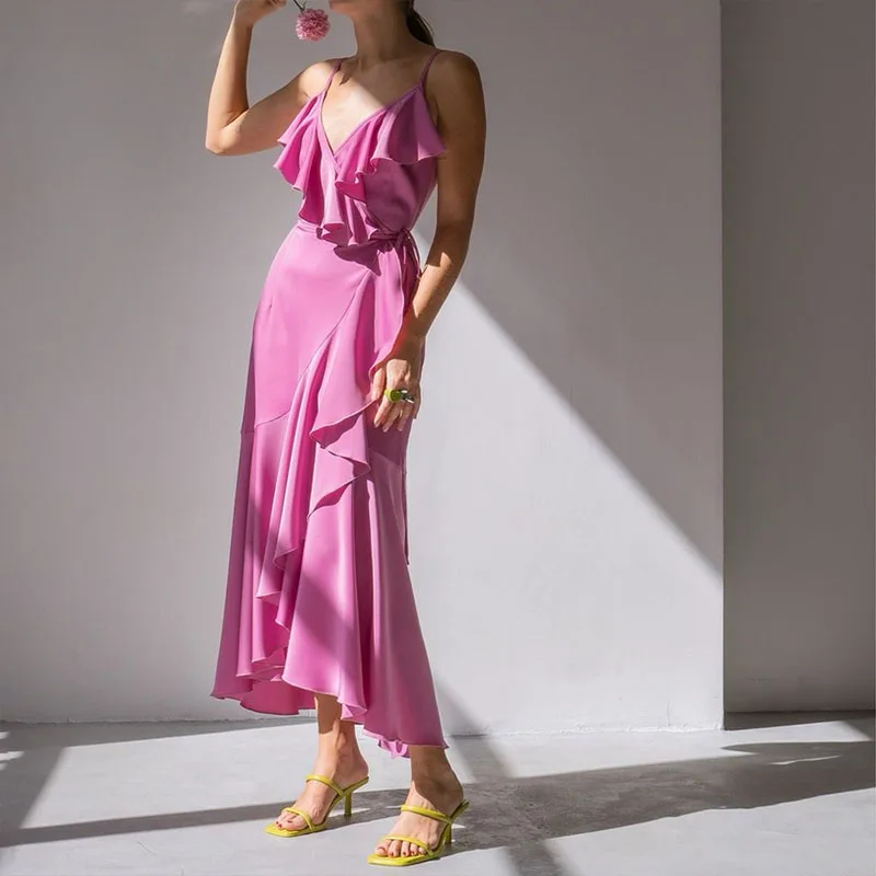 MQTIME  -  Elegant Lace Up Pleats Slim Party Dress Ladies Deep V Ruffle Solid Banquet Dress Summer Spaghetti Strap Waist Long Dress Vestido