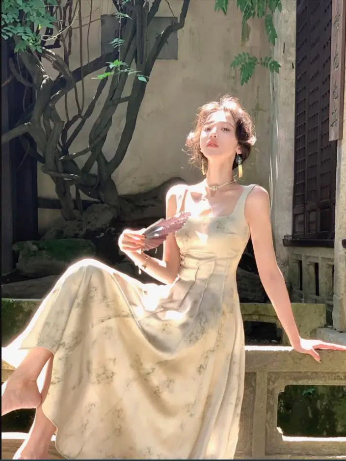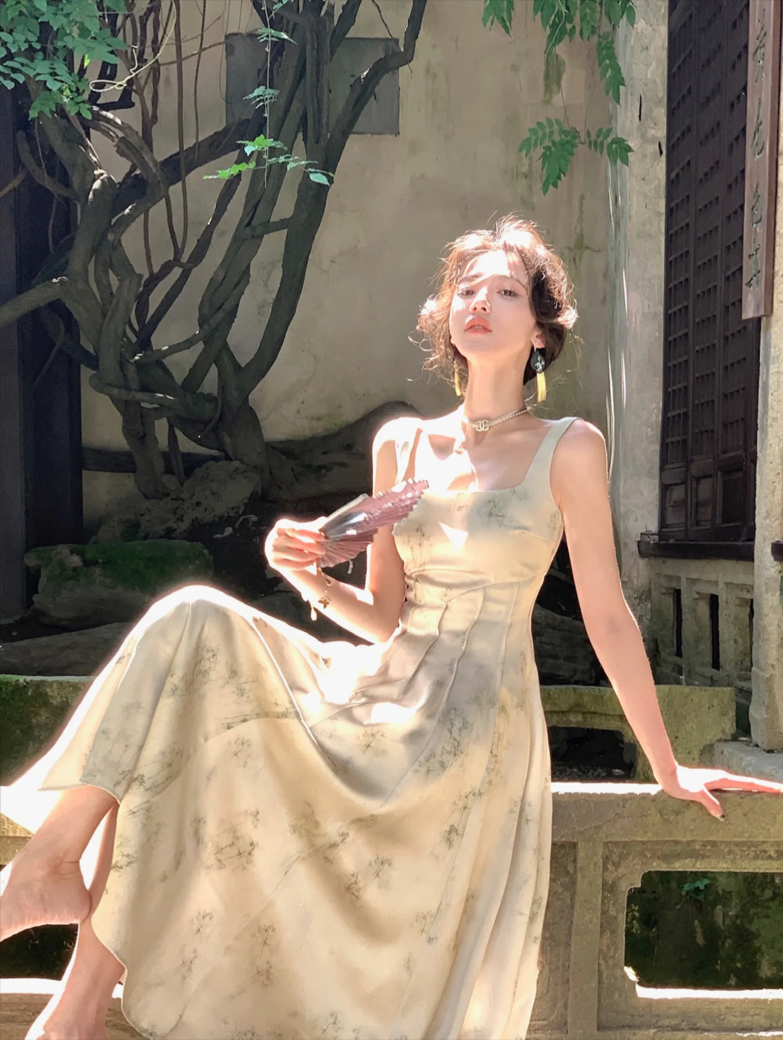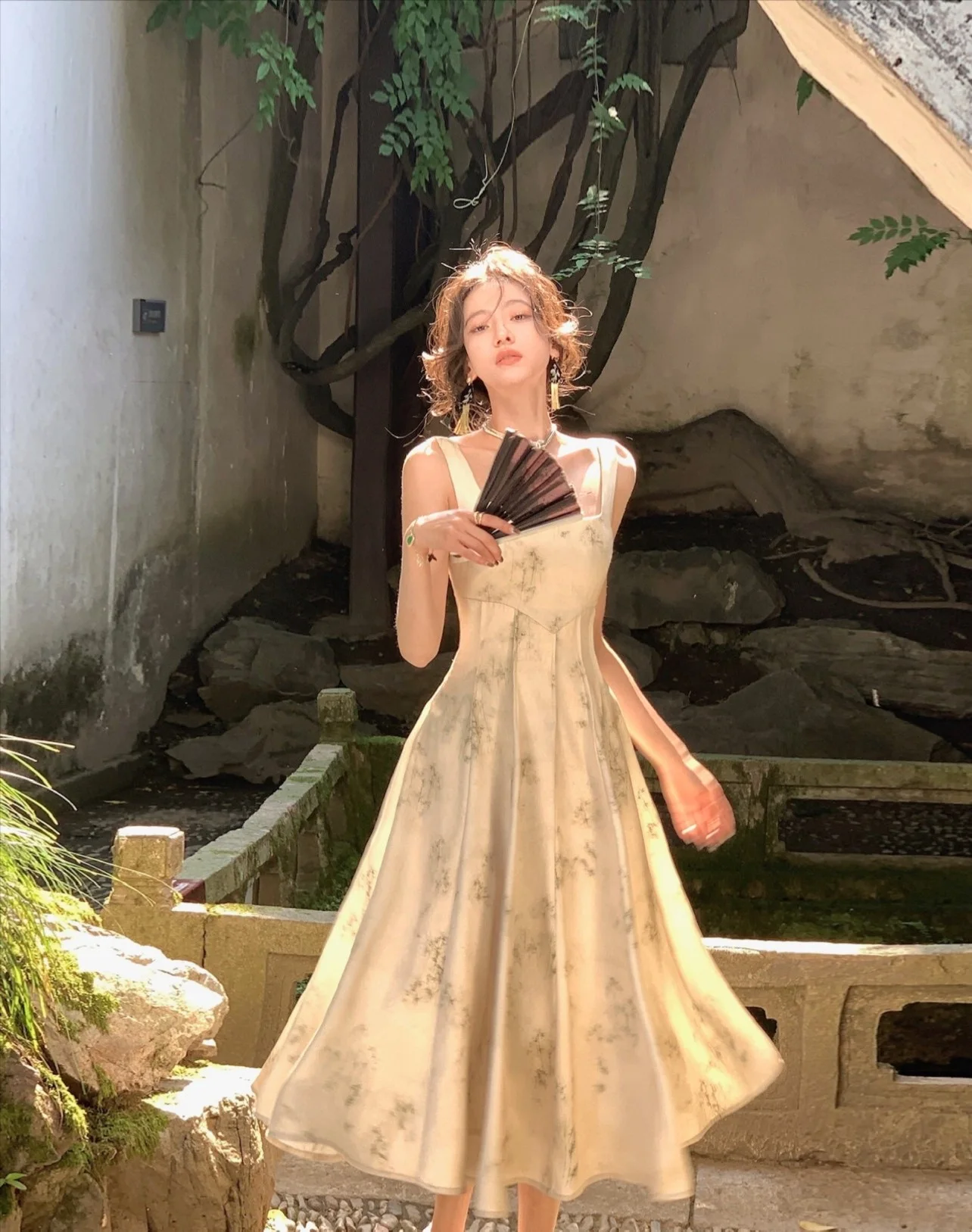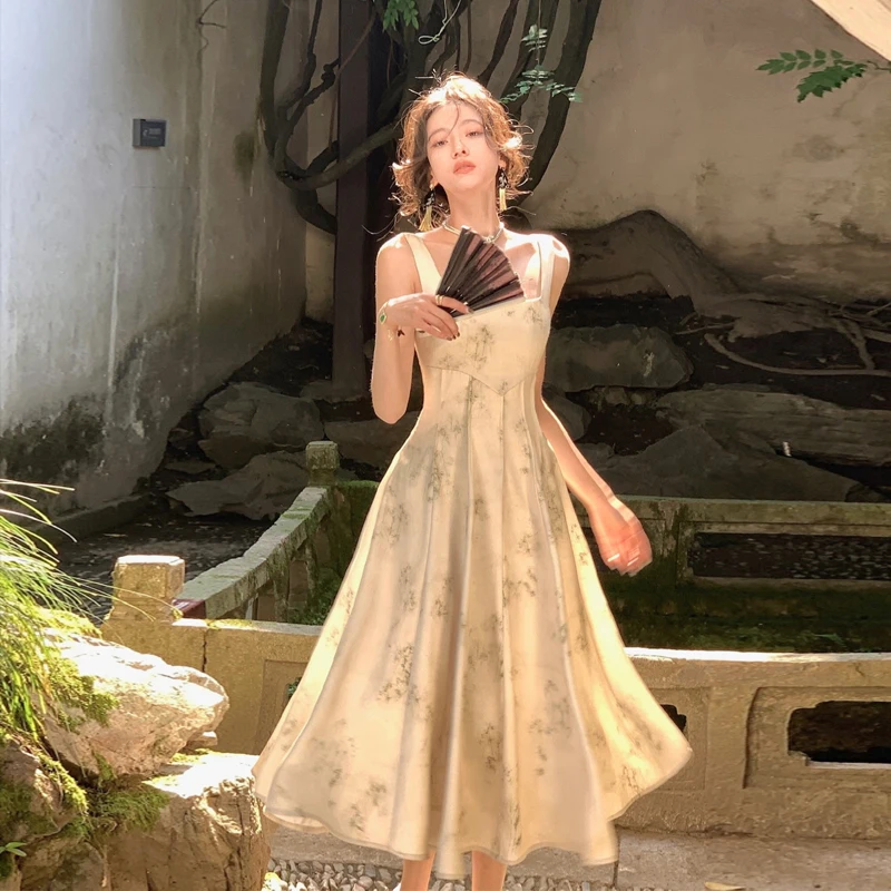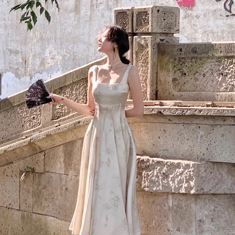 Mqtime Elegant Midi Printed Satin Dress Women Spaghetti Strap Square Collar Vintage A-Line Evening Prom Wedding Party Vestidos