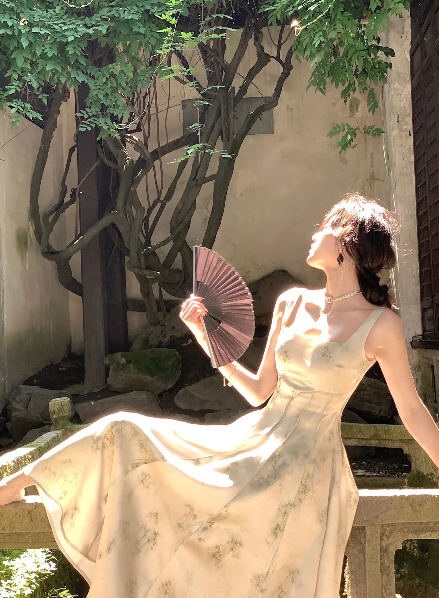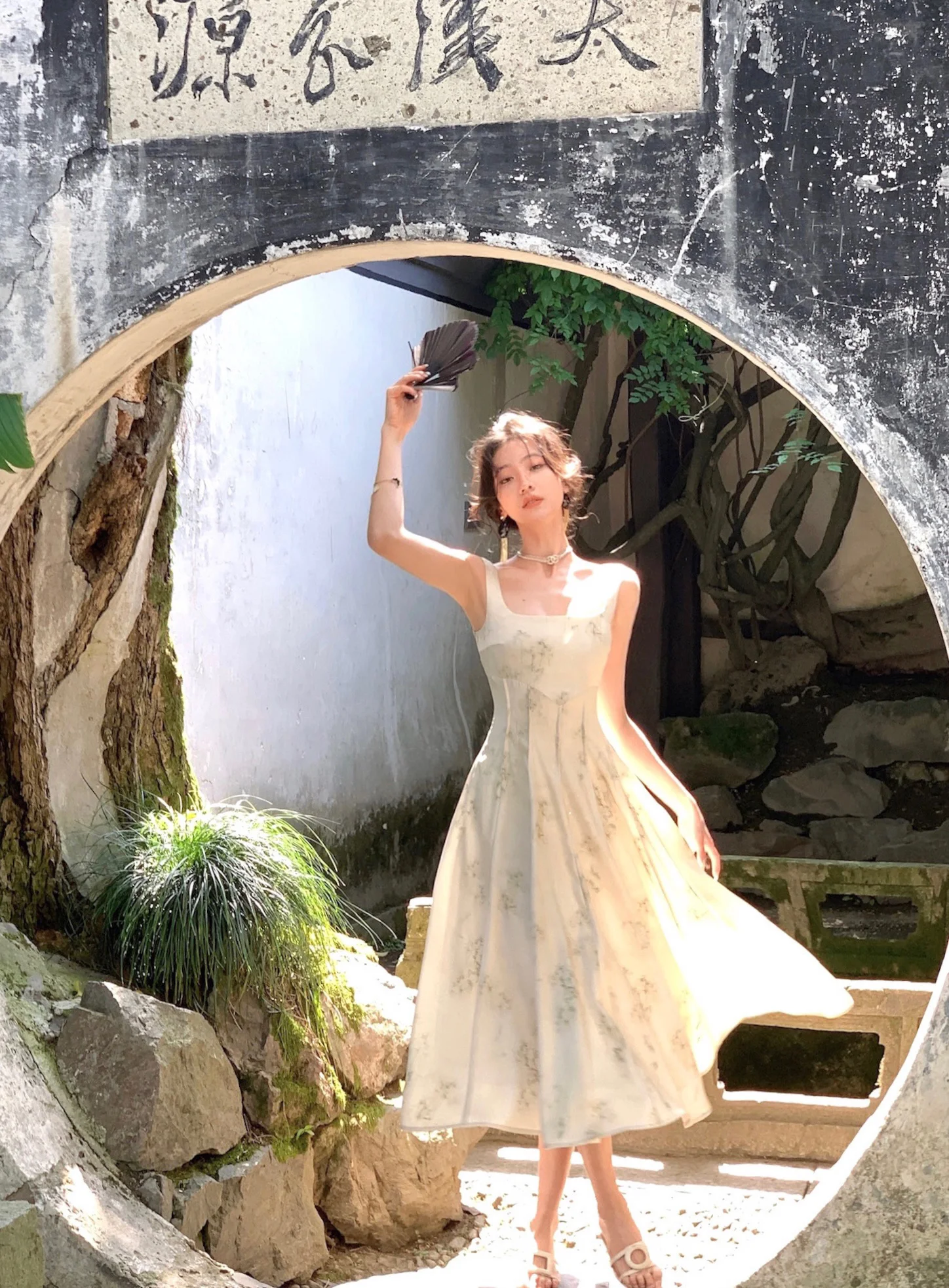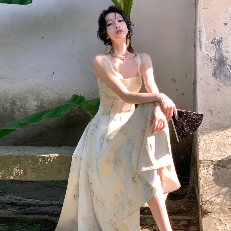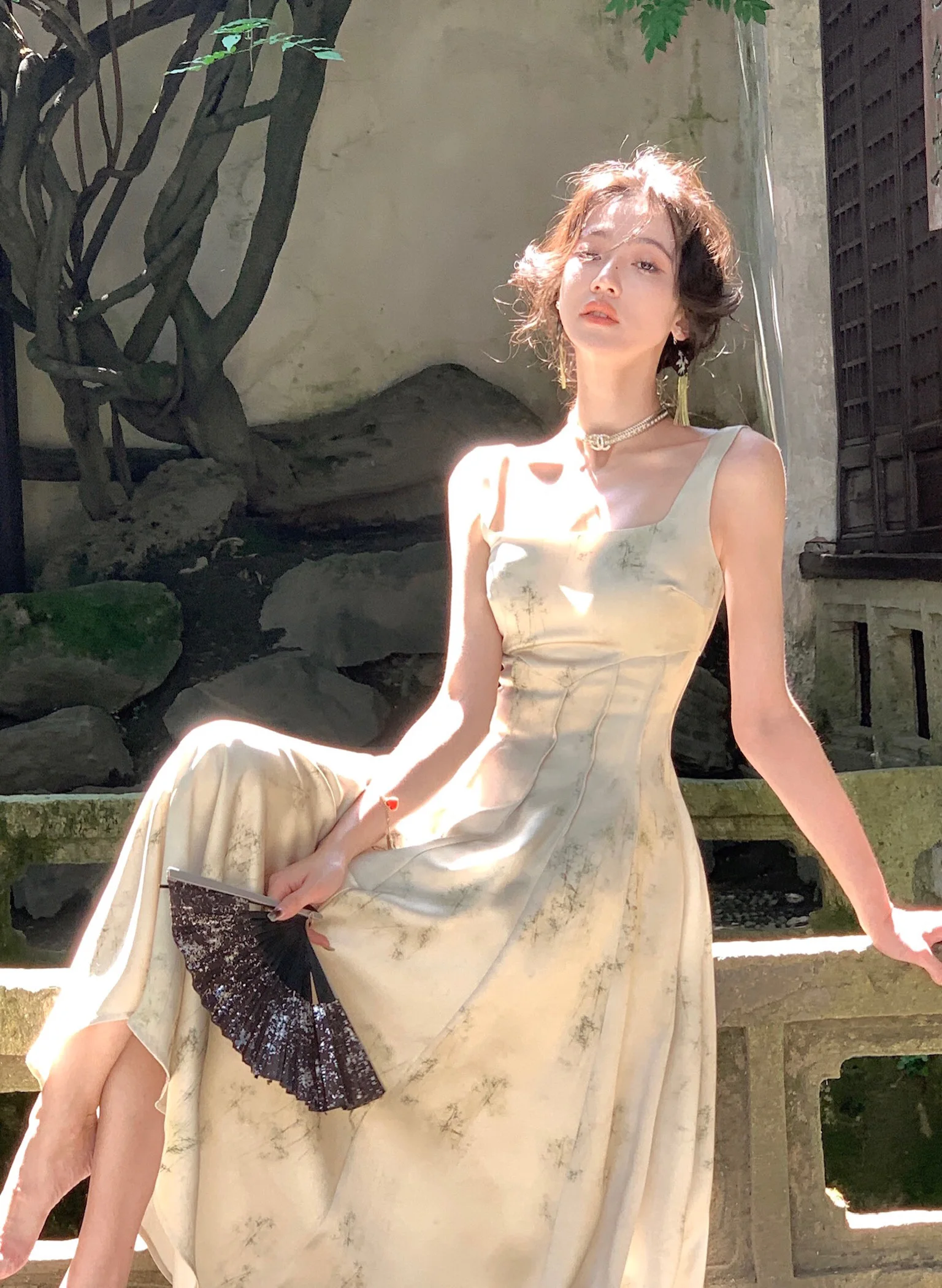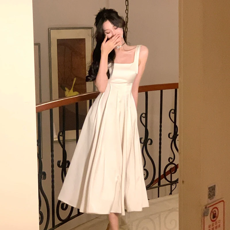Mqtime Elegant Midi Printed Satin Dress Women Spaghetti Strap Square Collar Vintage A-Line Evening Prom Wedding Party Vestidos