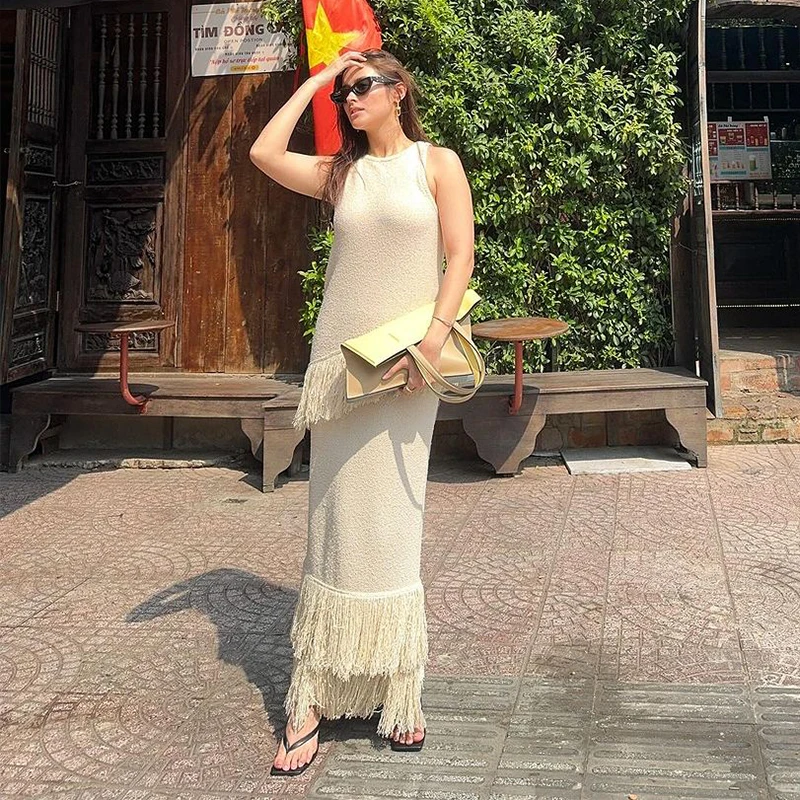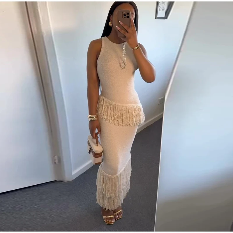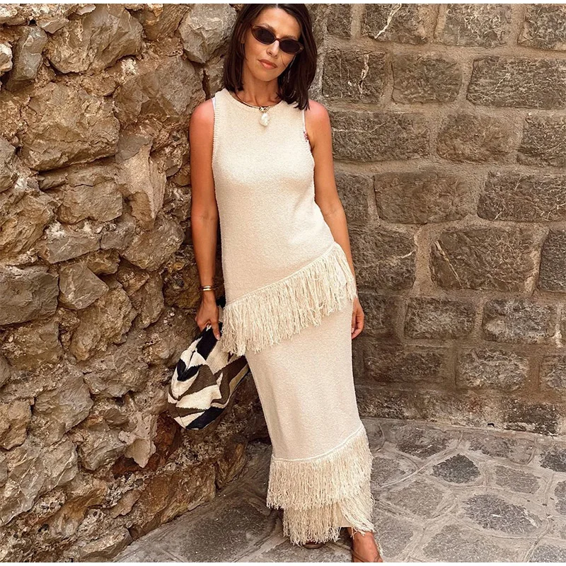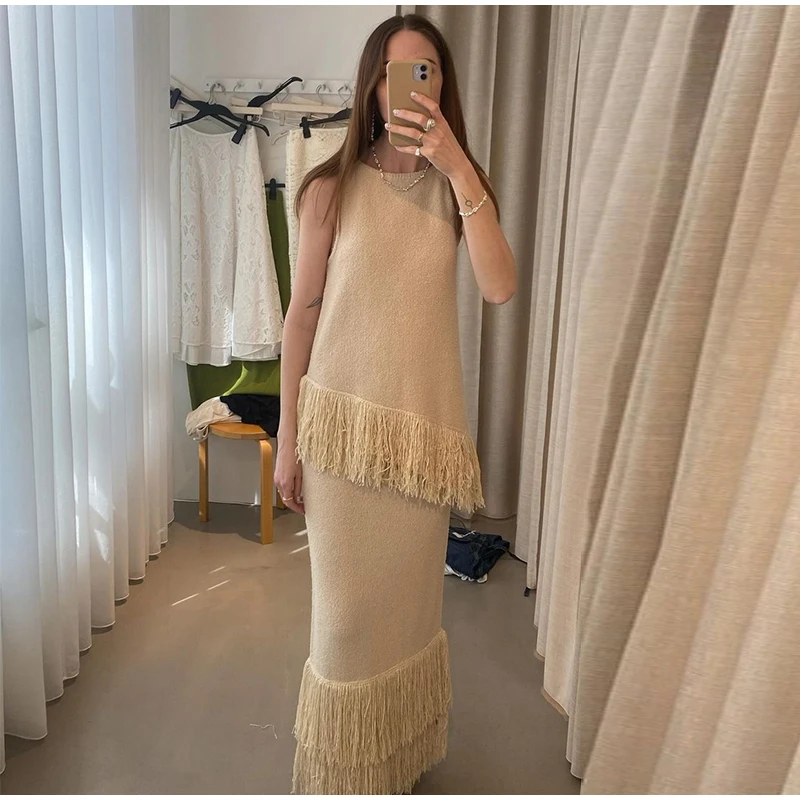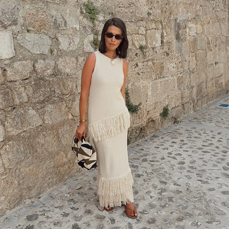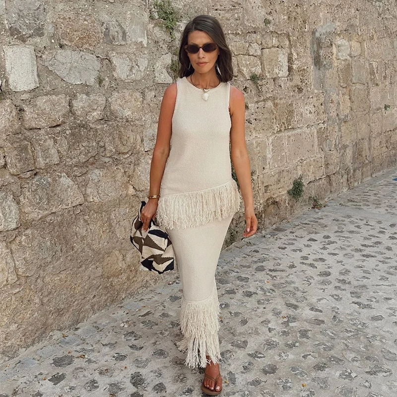 MQTIME  -  Elegant Solid Fringe Women Skirt Suits O-neck Sleeveless Vest High Waist Wrap Hip Skirts 2024 Summer New Fashion Female Sets