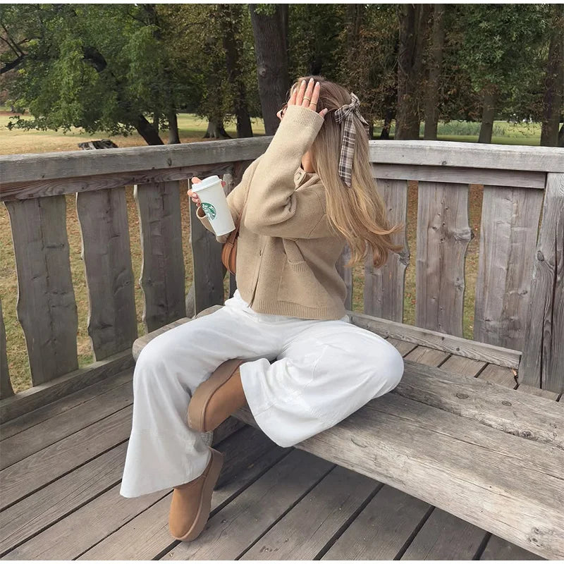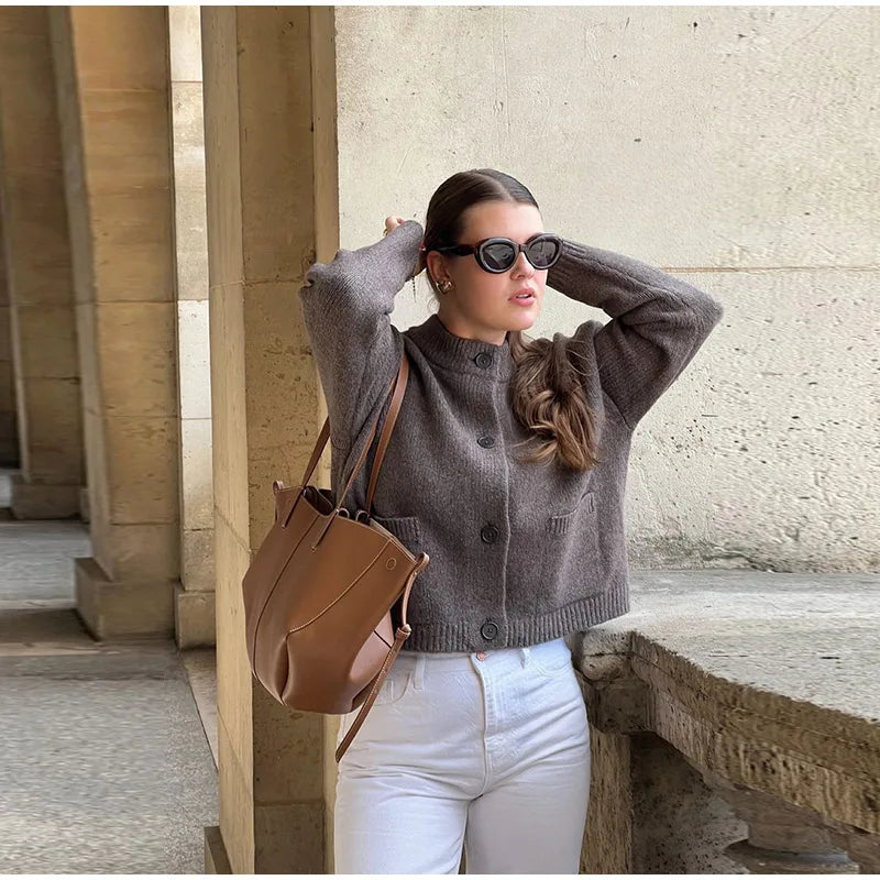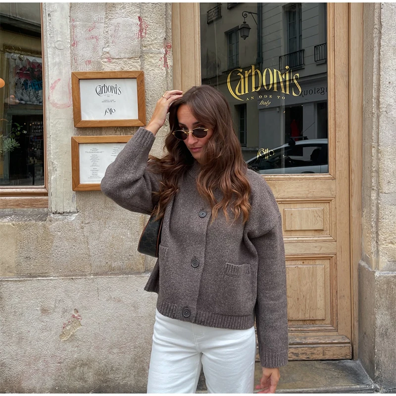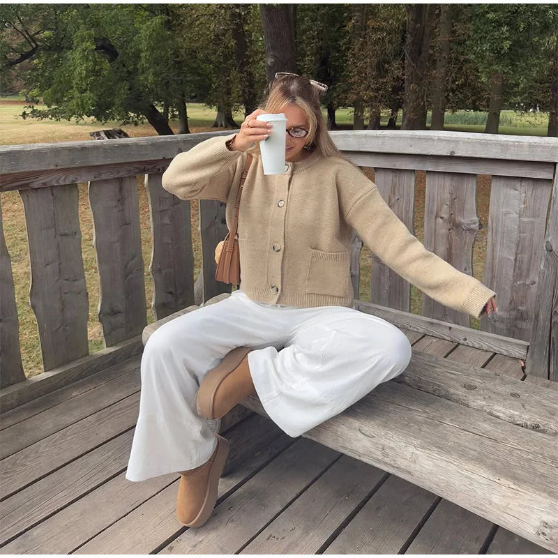 MQTIME - Elegant Women O Neck Cardigan Knitted Long Sleeve Button Pocket Slim Fitted Short Sweater 2025 Fashion New Pullover Knitwear Top
