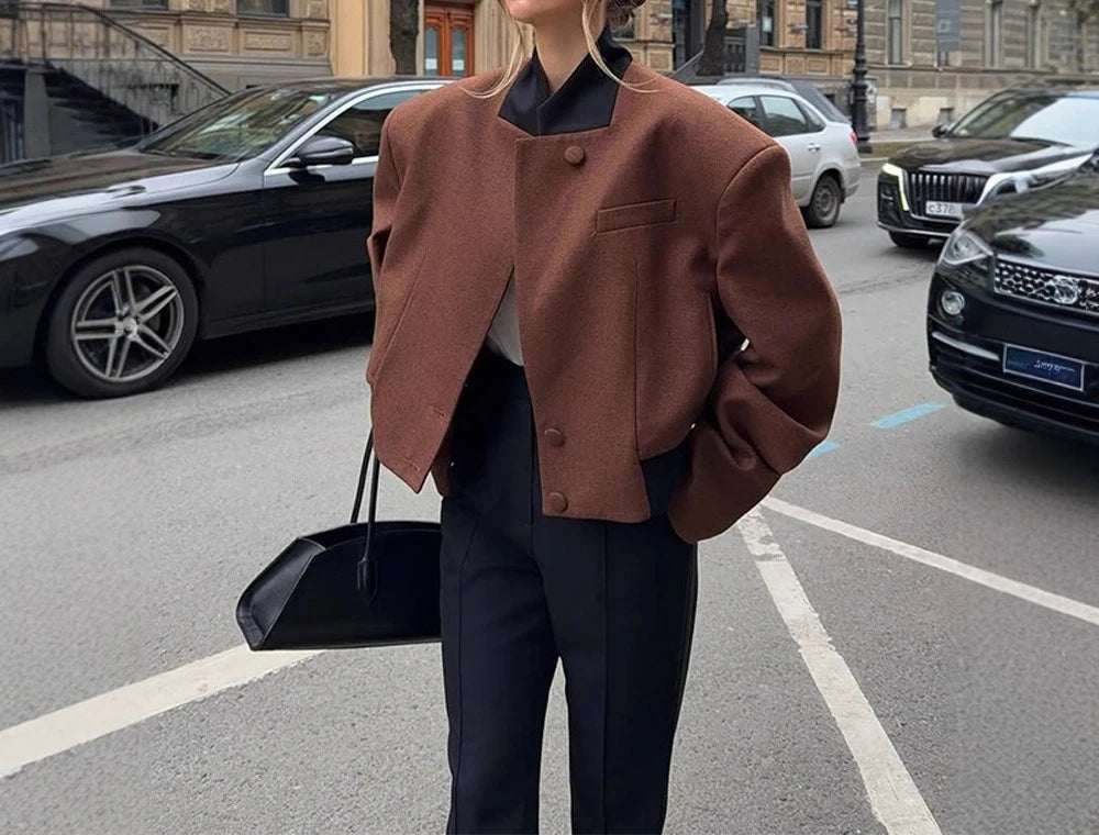 MQTIME - Elegant Woolen Patchwork V-neck Buttoned Jacket Short Coat 2025 New Women's Clothing