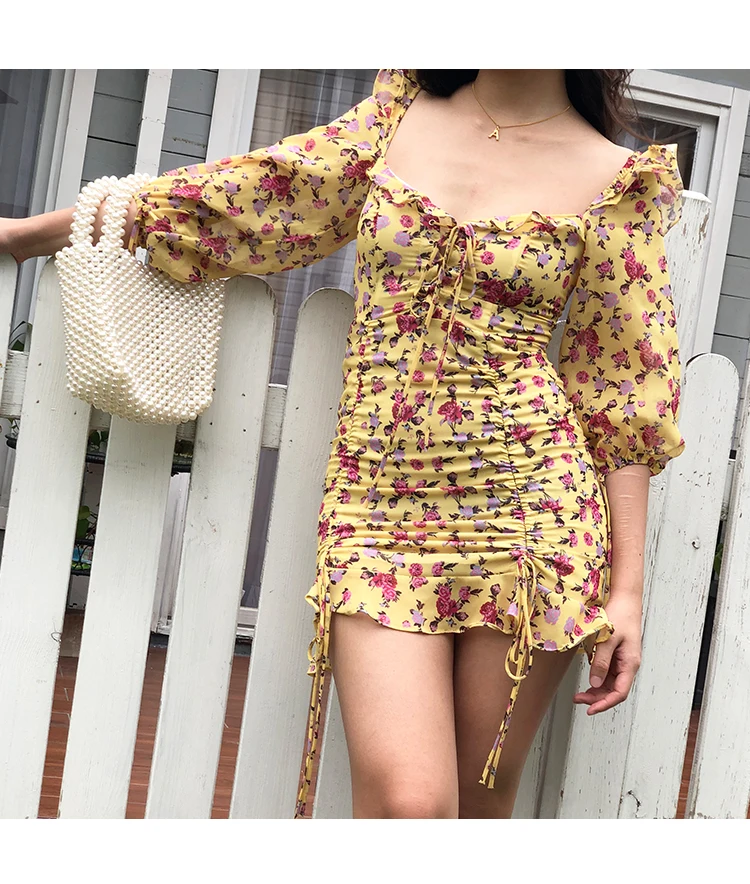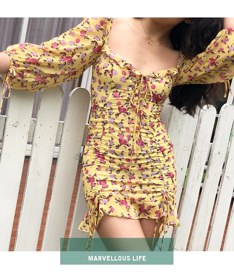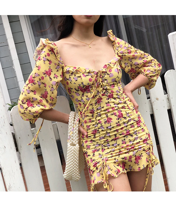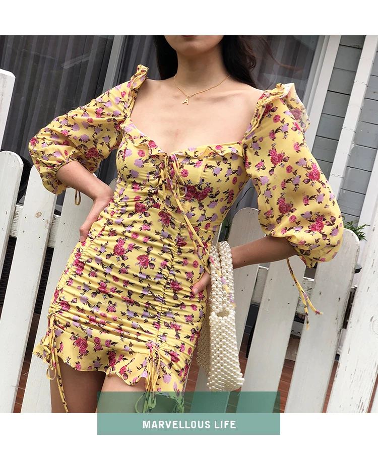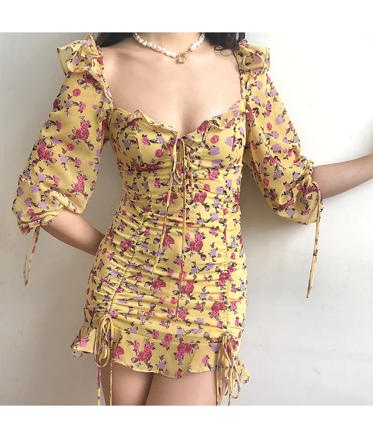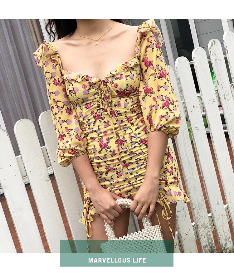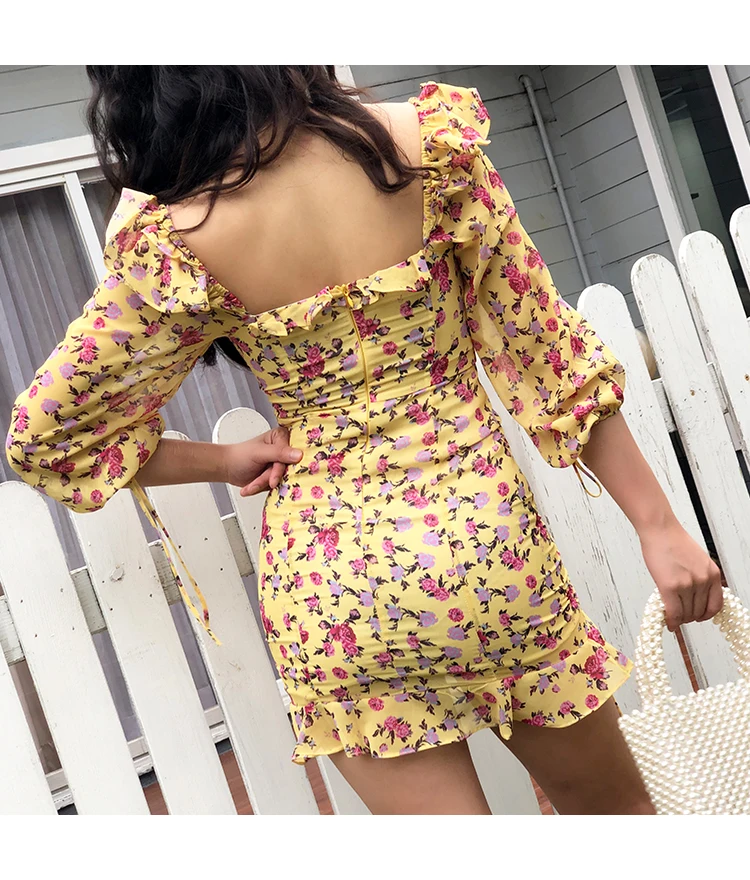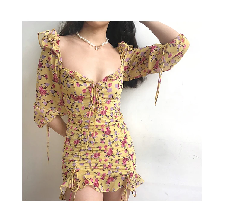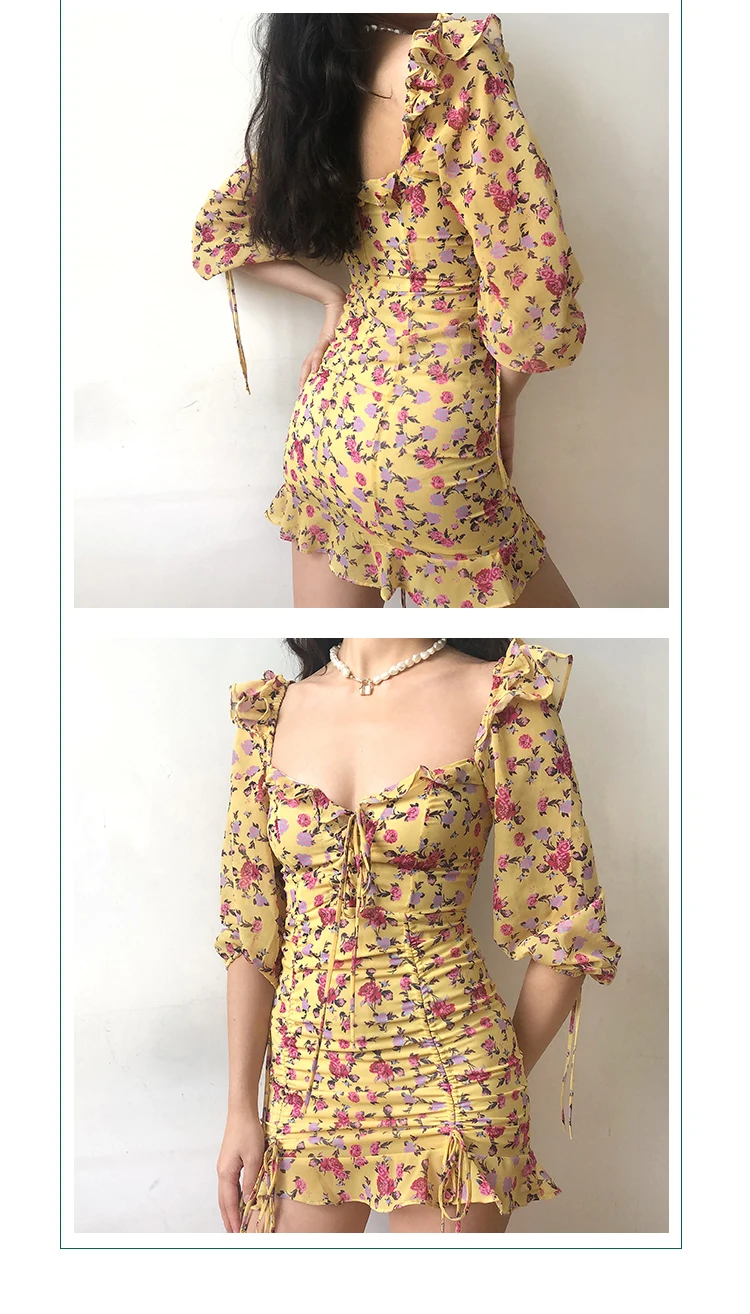 MQTIME - European and American Sexy Slim Fit Ruffle Strap Floral Medium Sleeve Chiffon Dress Skirt