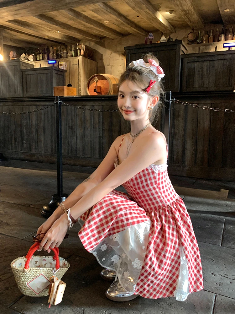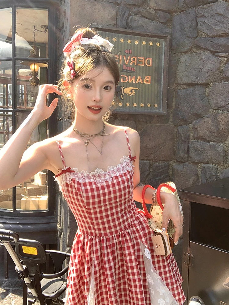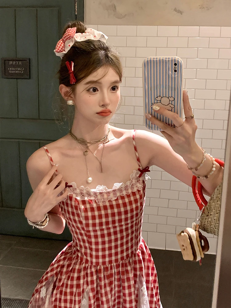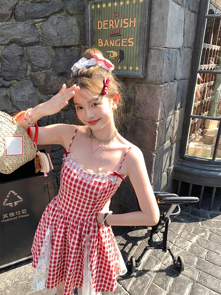 MQTIME - Evening Party Y2k Plaid Mini Dress Women Casual Sweet Lace japanese kawaii Strap Dresses Korean Fashion Elegant 2024 Summer