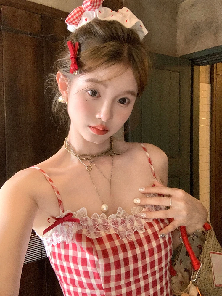 MQTIME  -  Evening Party Y2k Plaid Mini Dress Women Casual Sweet Lace japanese kawaii Strap Dresses Korean Fashion Elegant 2024 Summer