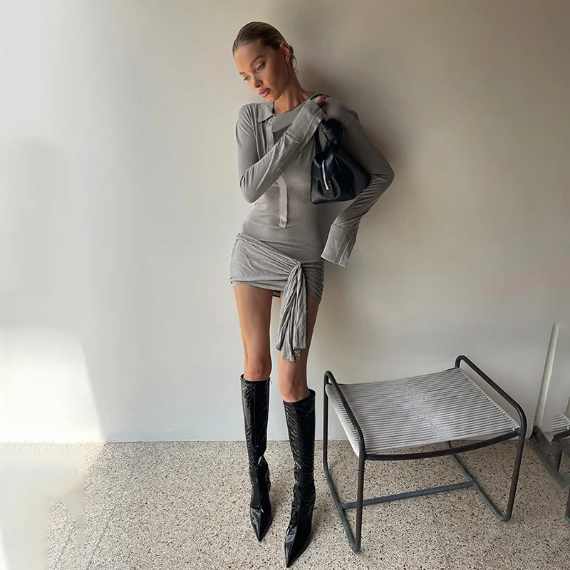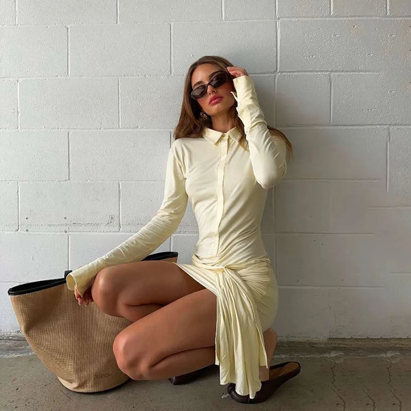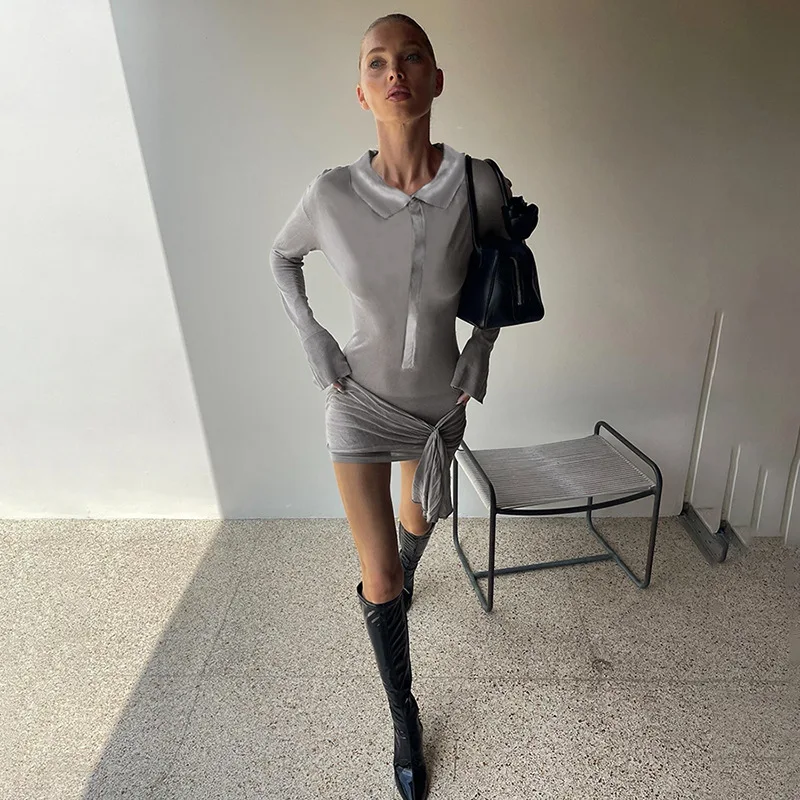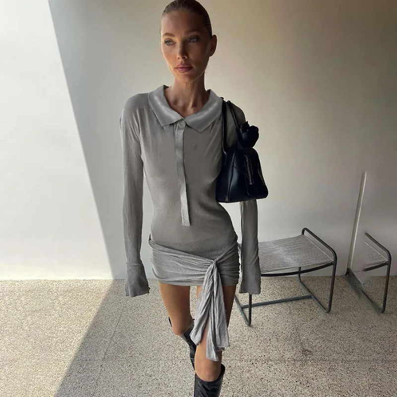 MQTIME - Fall Outfits 2024 Autumn Bandage Casual MIni Dress Women Pleated High Waist Long Sleeve Lapel Tassel Party Dress 2024 Female Lace-Up Dress