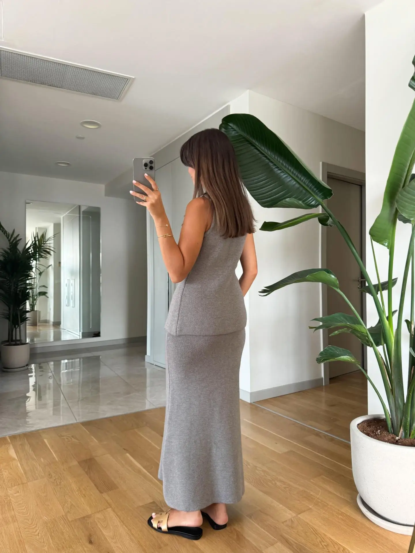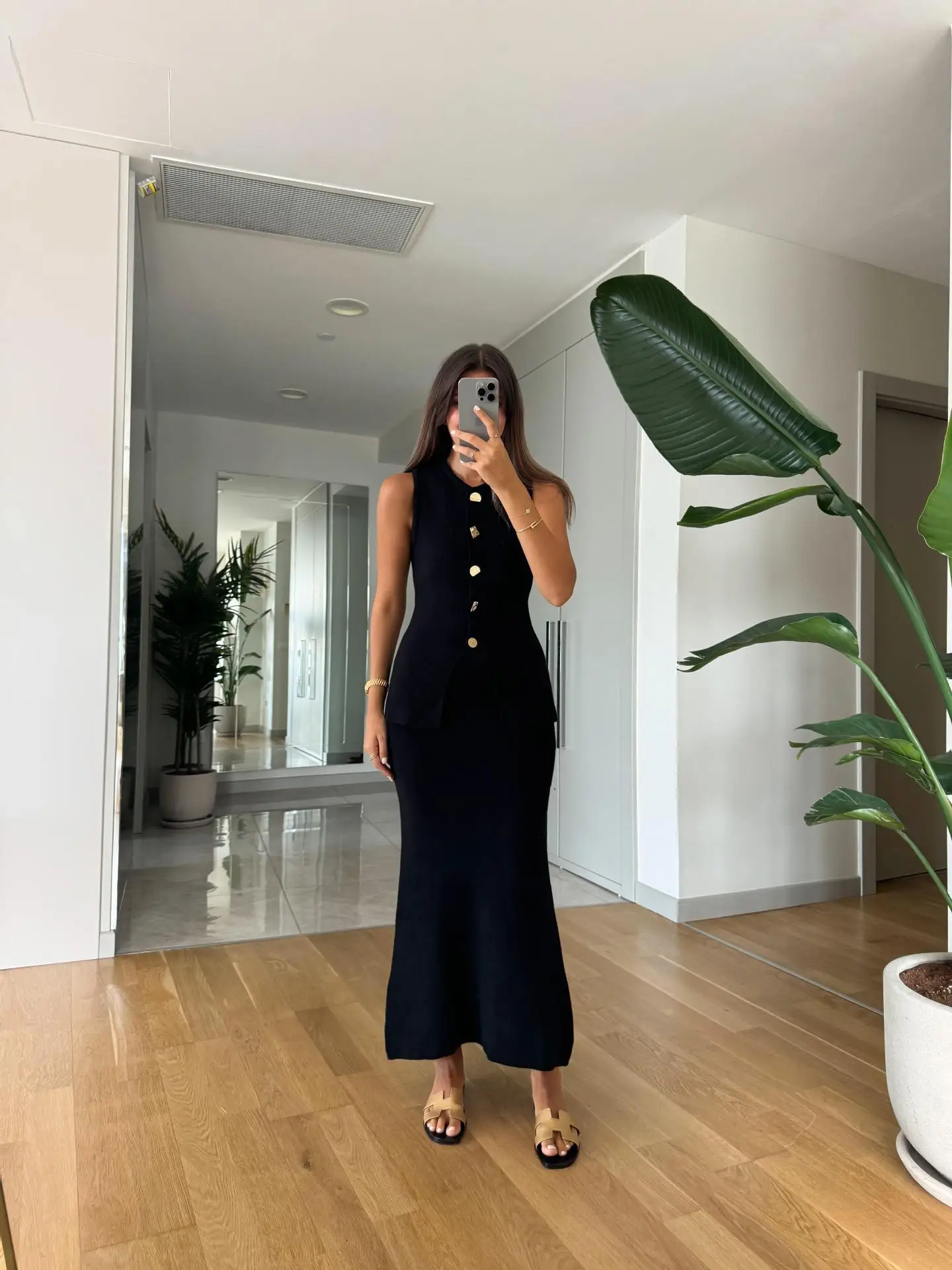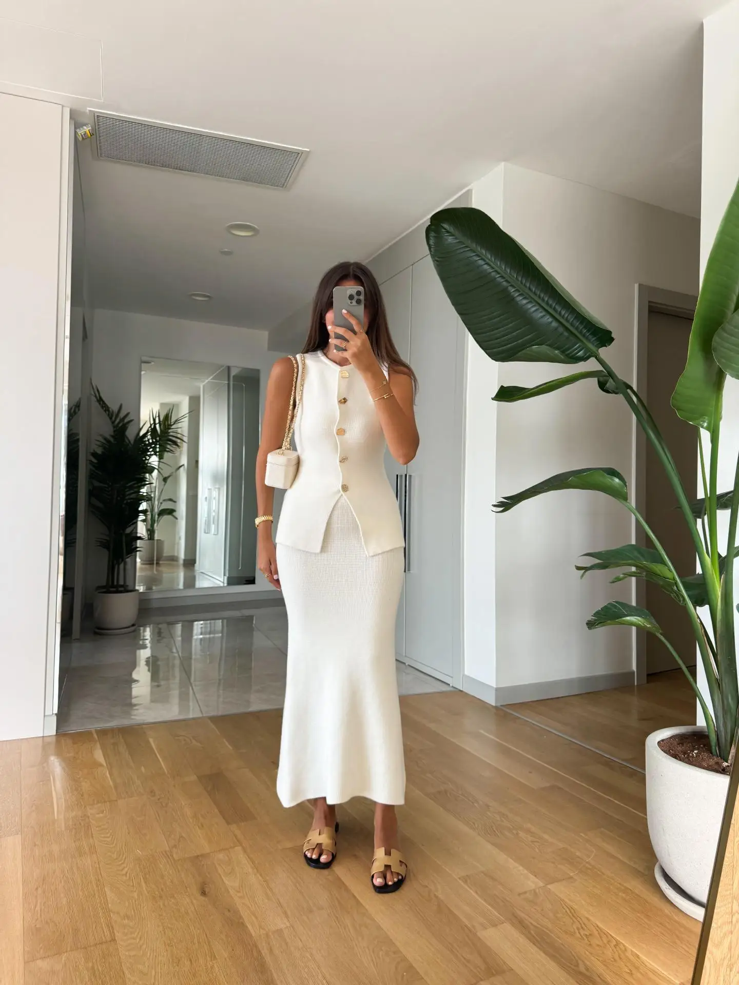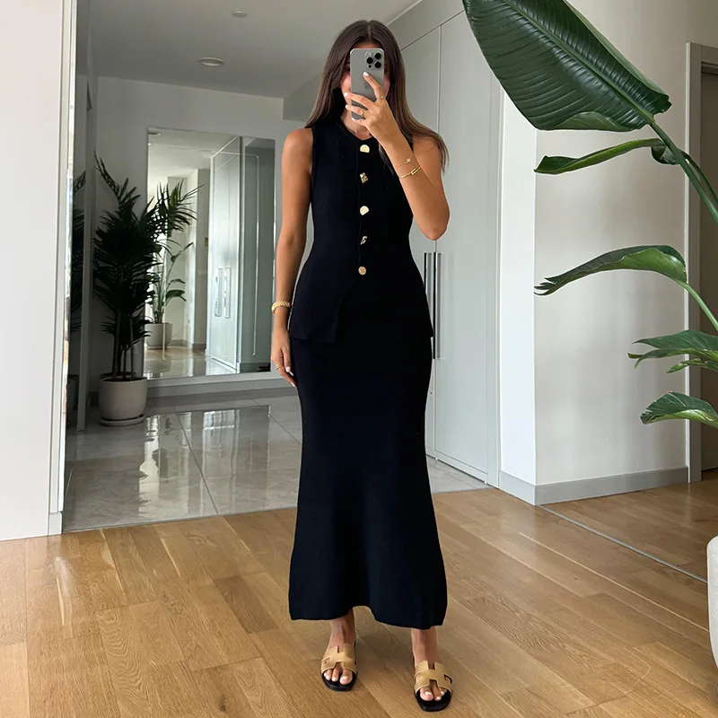 MQTIME - Fall Outfits 2024 Knitwear Fashion 2 Piece-Set Maxi Skirt Women's Sleeveless Patchwork Cardigan Top And High Waist Long Skirt Sets Female