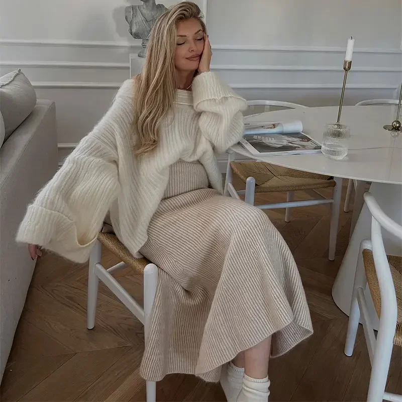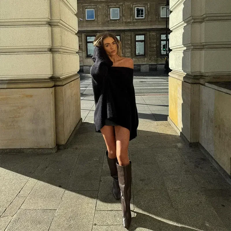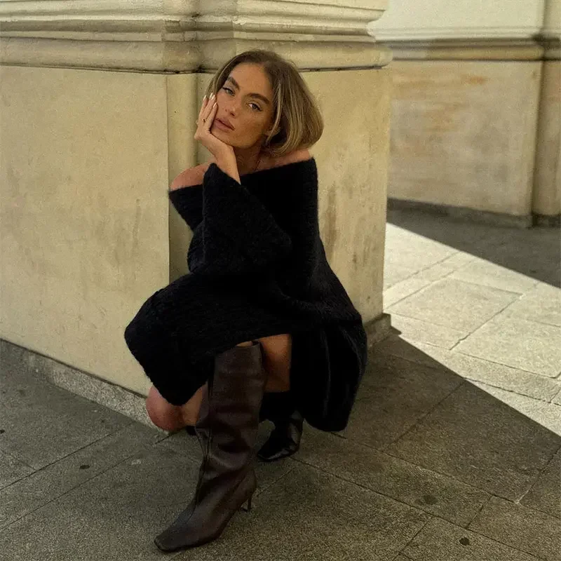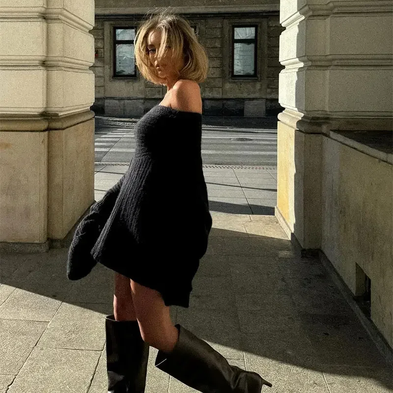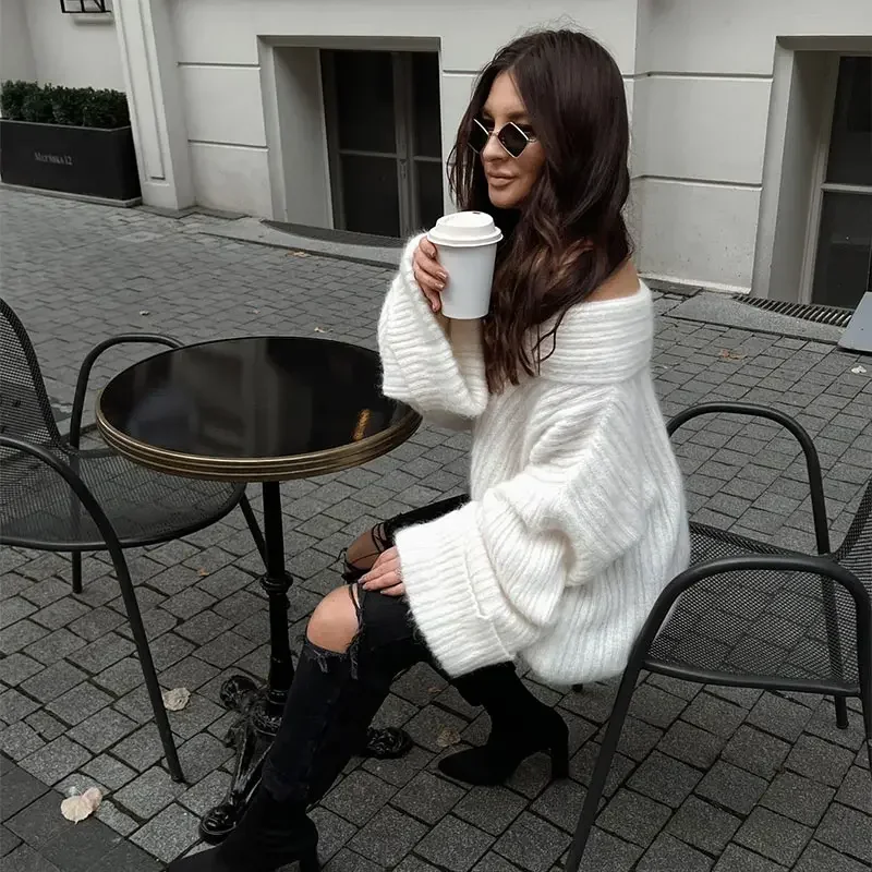 Mqtime Fashion Slash Neck Solid Knitted Sweater For Women Autumn Long Sleeve Loose Pullover Jumper Female Elegant High Street Knitwear