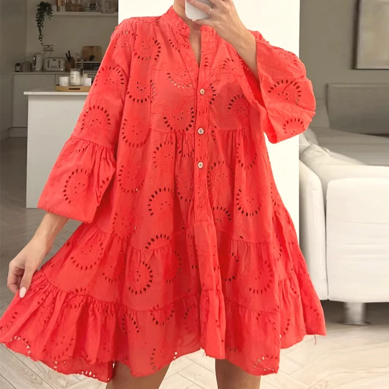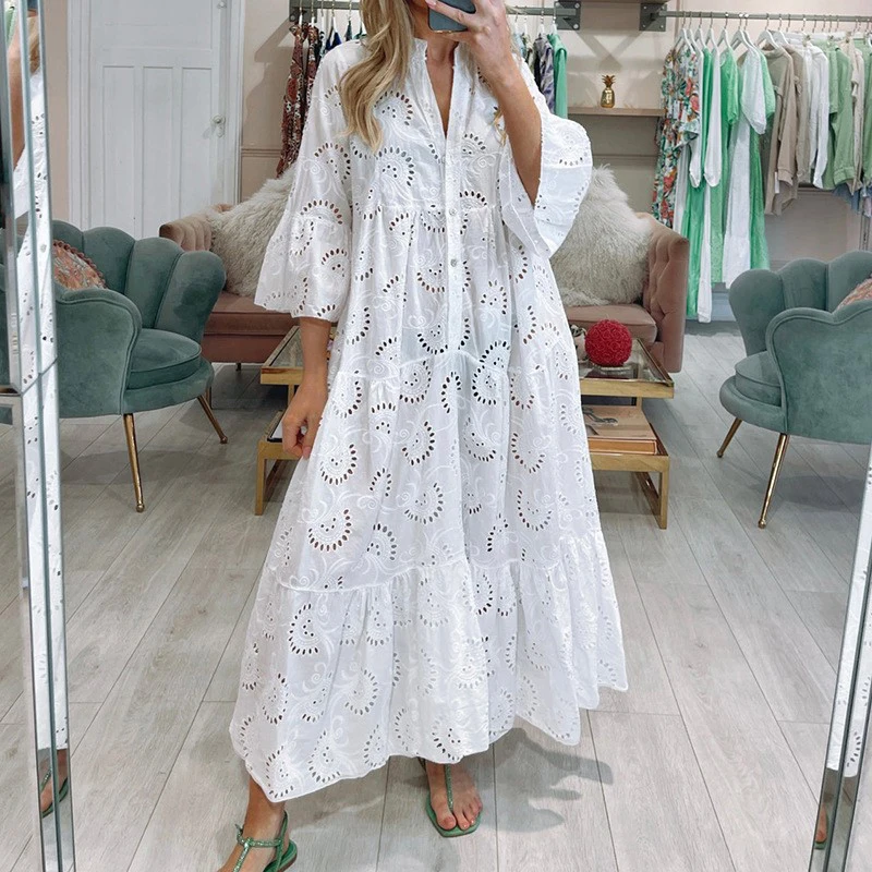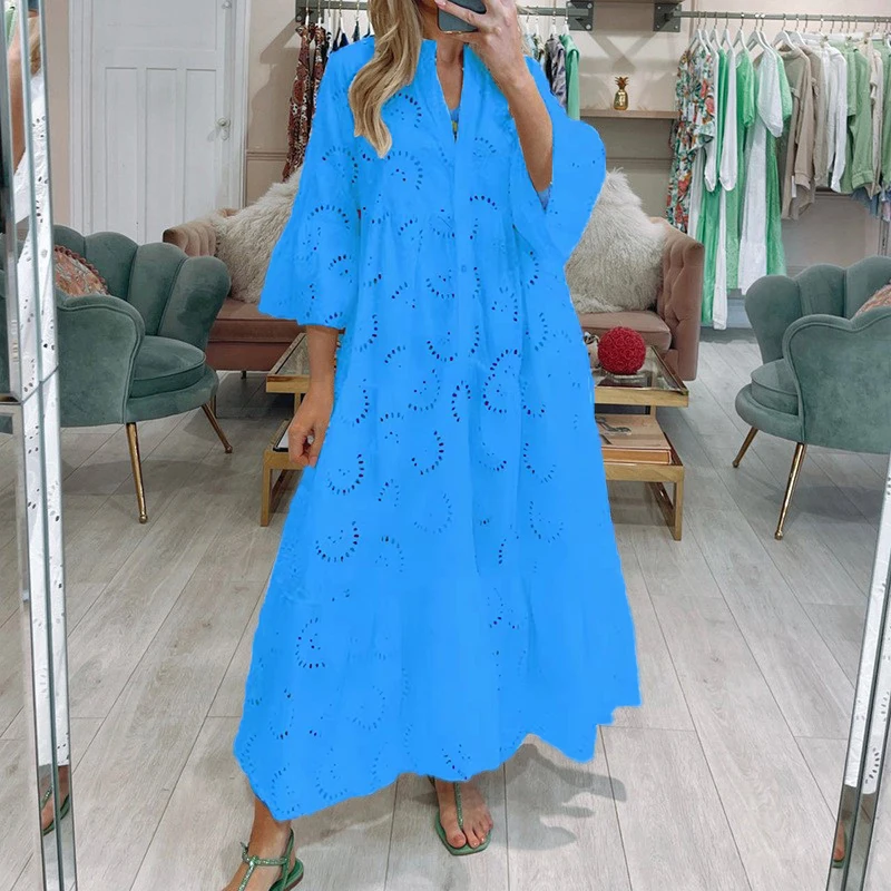 MQTIME - Fashion Solid Color Flare Sleeve Loose Dress Casual Ladies V Neck Button Long Dress Spring Summer Hollow Out A-line Dresses New