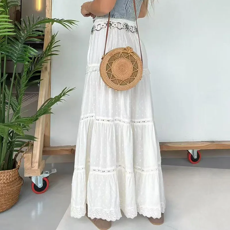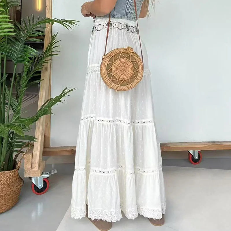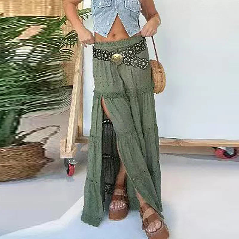MQTIME  -  Fashion Split Pleated Loose Long Skirts Sexy Lace Splicing Design Half-body Skirt Women Elegant Elastic Waist Solid Swing Skirt