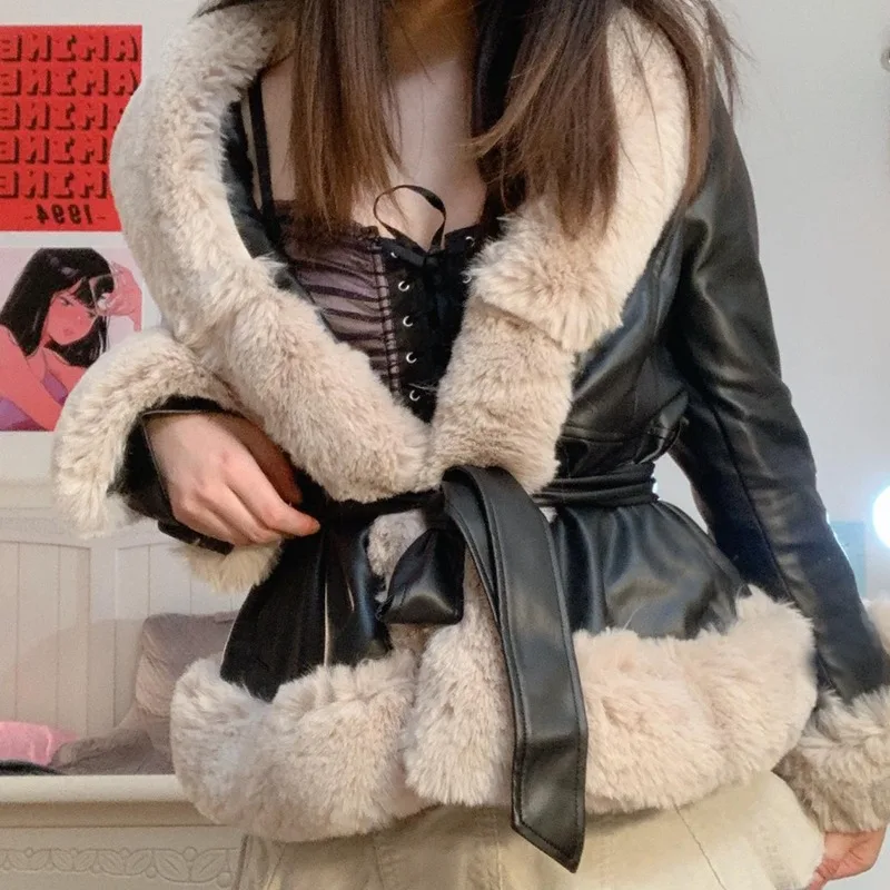MQTIME  - Faux Fur Spliced PU Leather Jackets with Belt Women Warm Winter Turn Down Collar Long Sleeve Slim Coats Streetwear Outwear