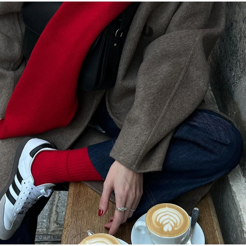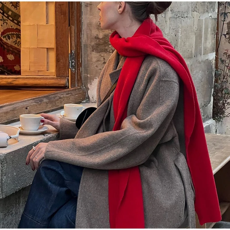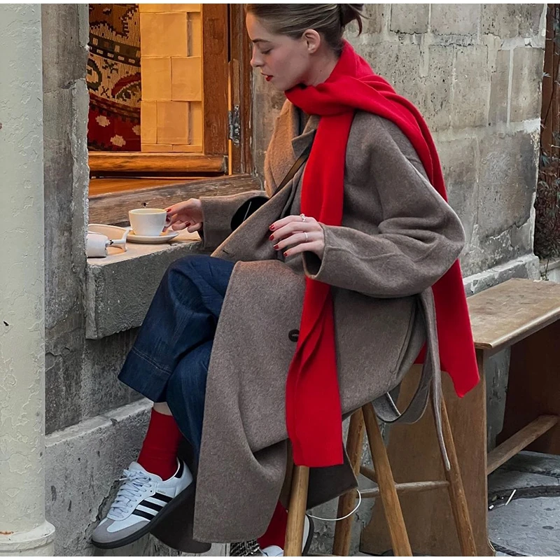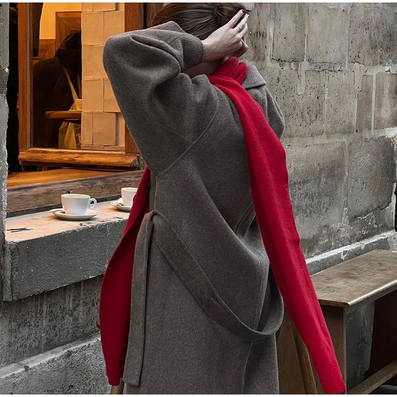 Mqtime Female Solid Retro Wool Blends Coats With Belt Autumn Winter Lapel Collar Pockets Long Jackets Fashion Lady High Street Overcoat