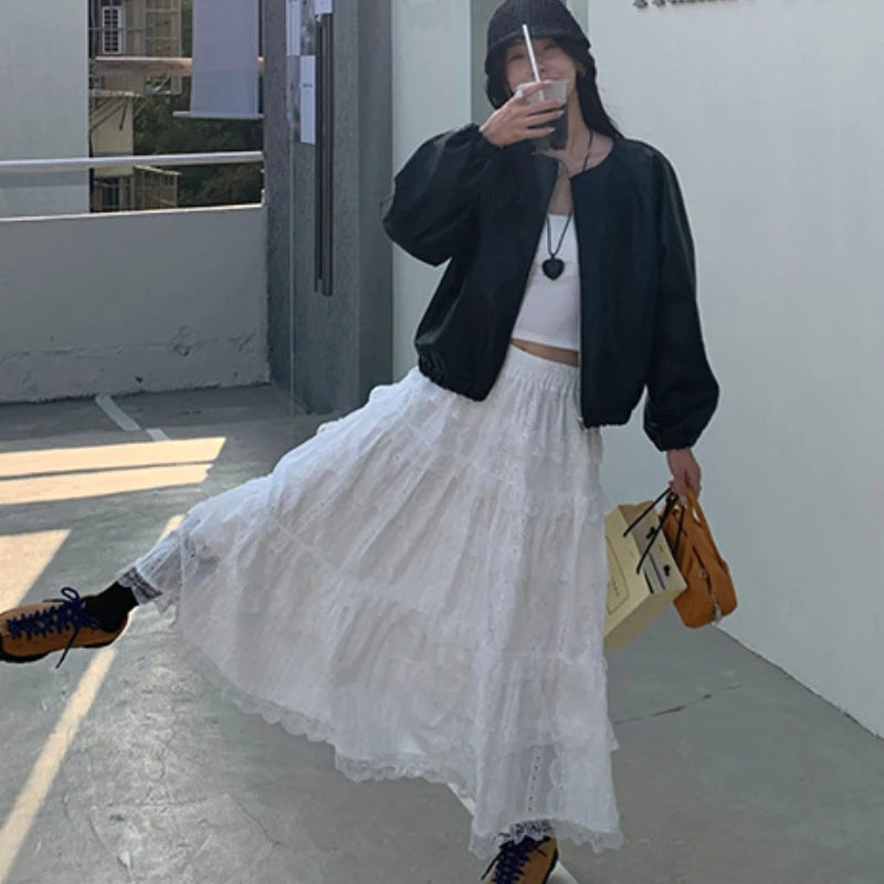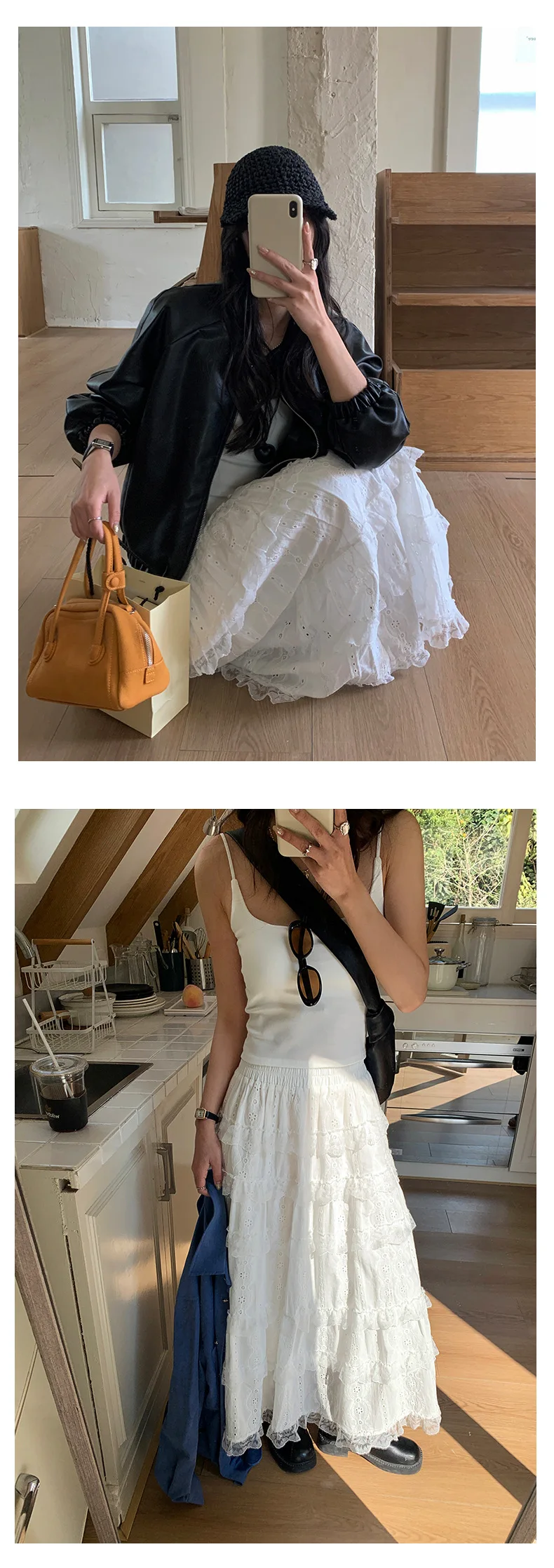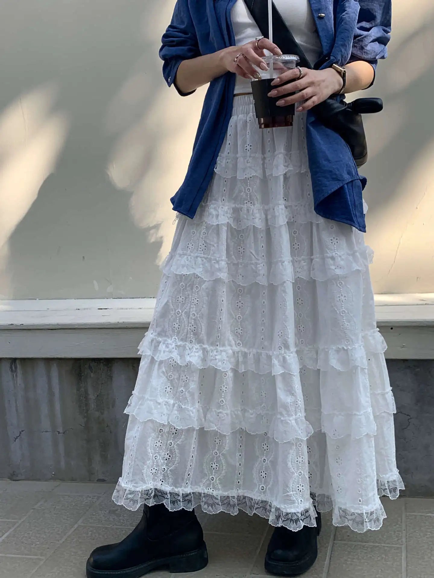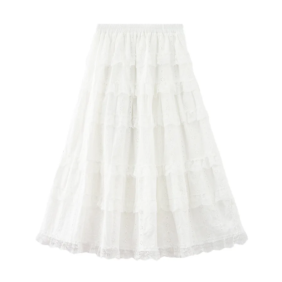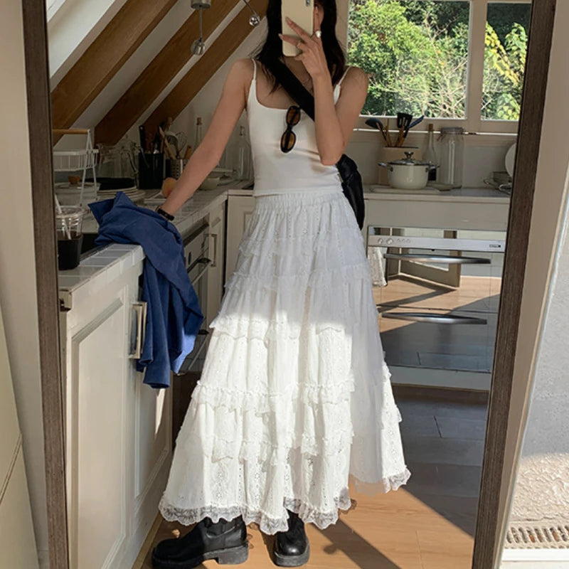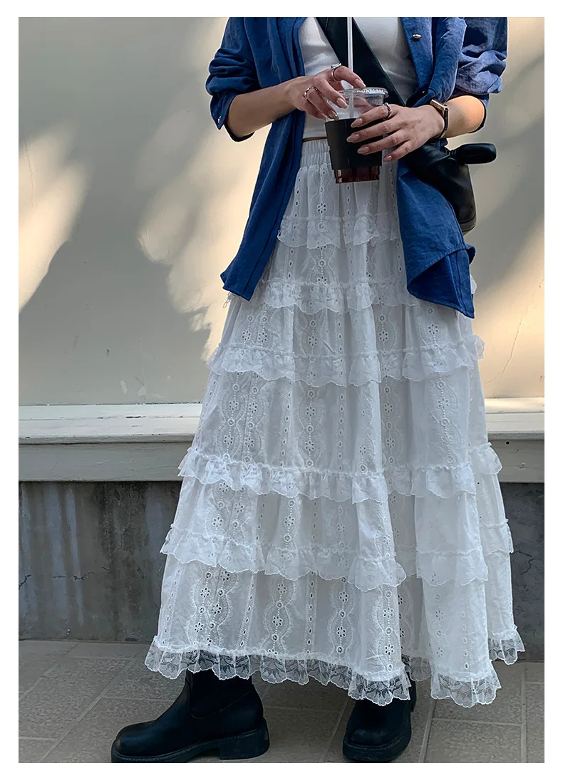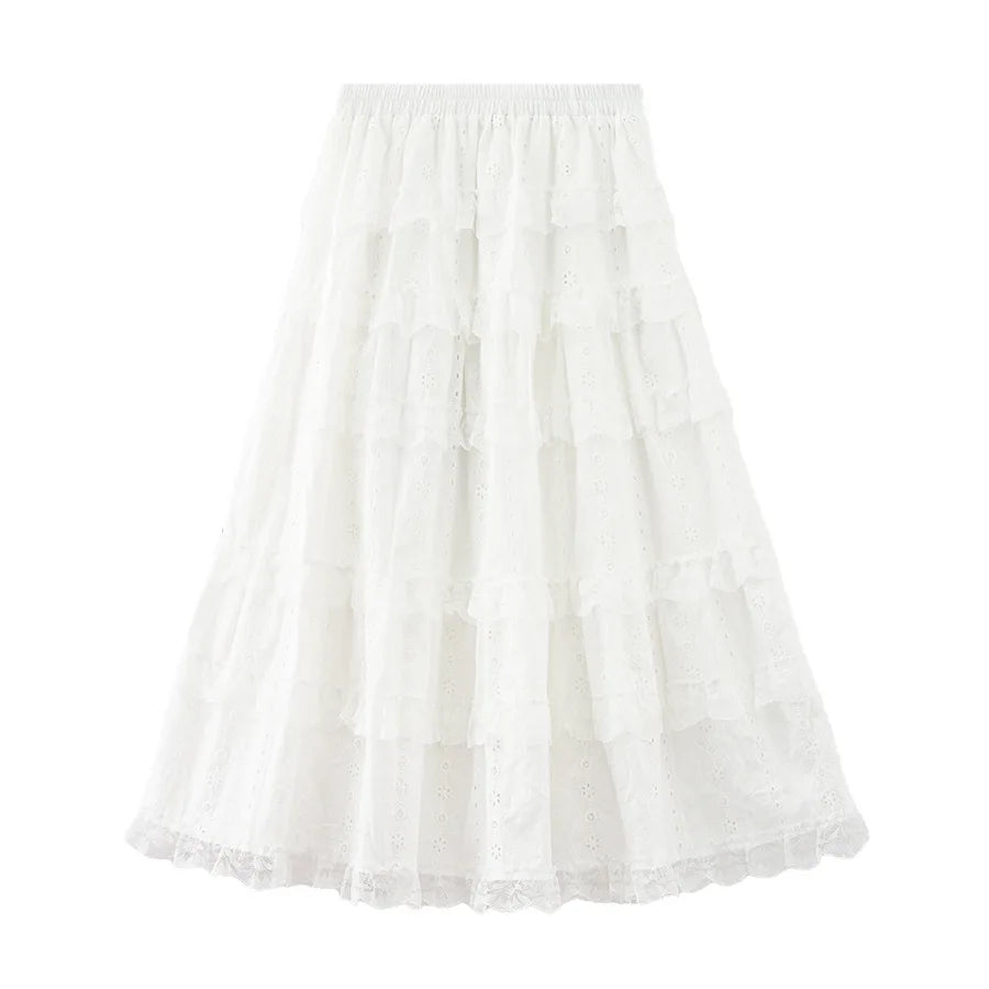 MQTIME - Femme Lace Skirts High Waist Layered Cake Skirts Korean Style Fashion Pleated Maxi Skirts Cotton Sweet White Vestidos