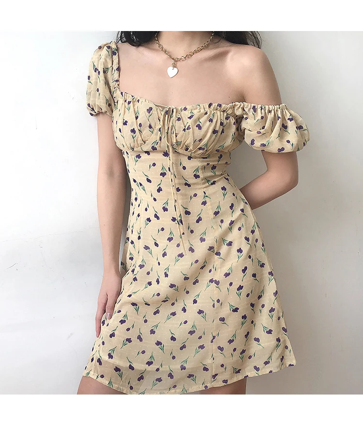 MQTIME - French Drawstring Bandage Chiffon Tulip Print Bubble Sleeve Waist Down Dress