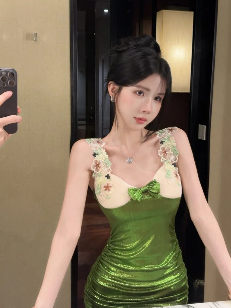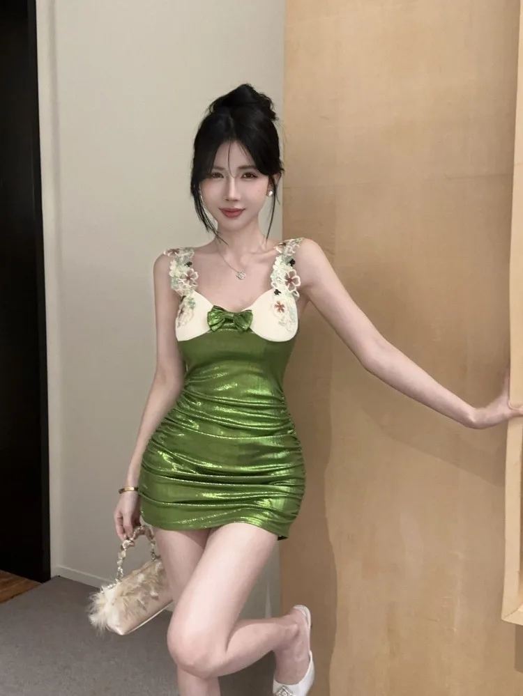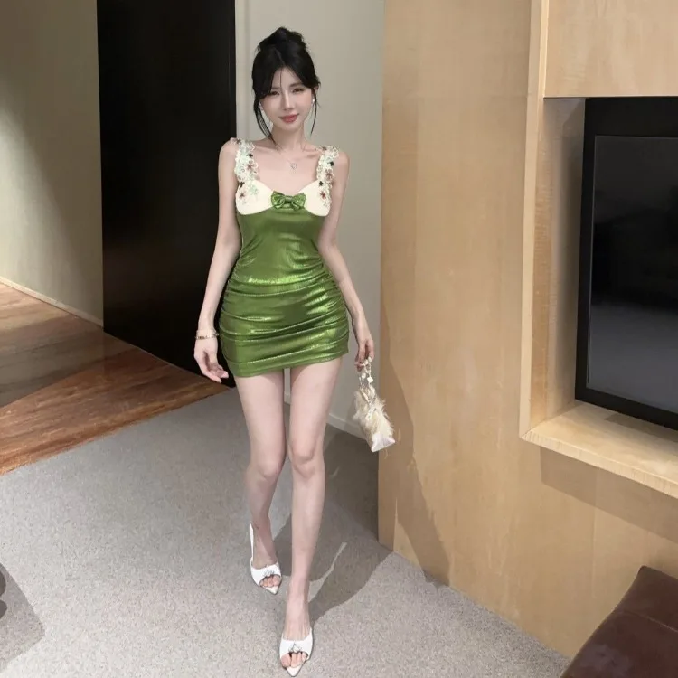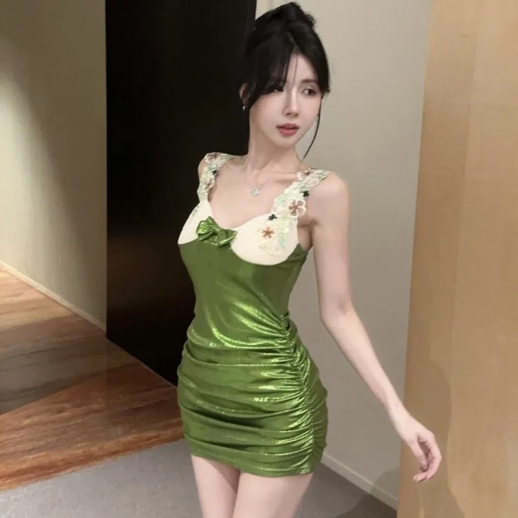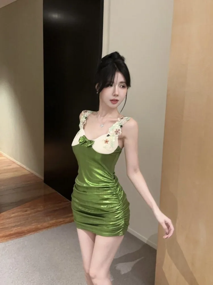 MQTIME - French Girl Dresses Slim Pleated Glossy Suspender Hip Skirt Women Thin Lace Edge Splicing Contrasting Color Vestido
