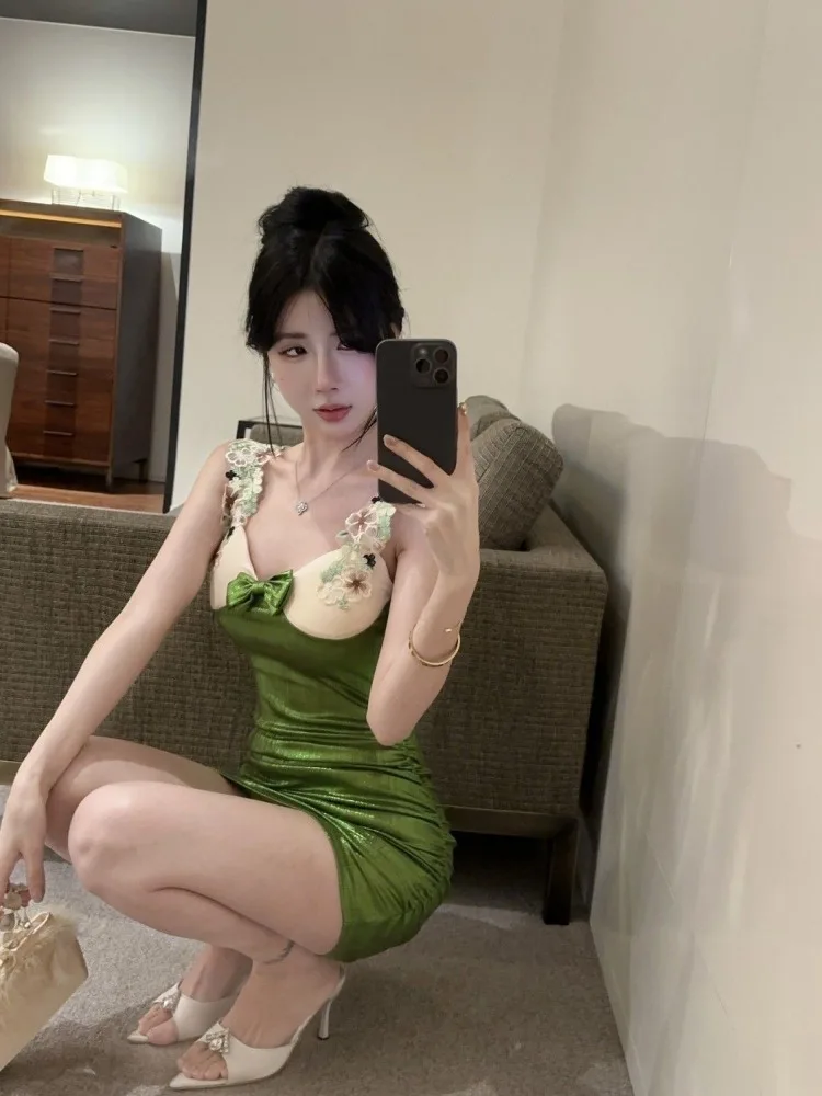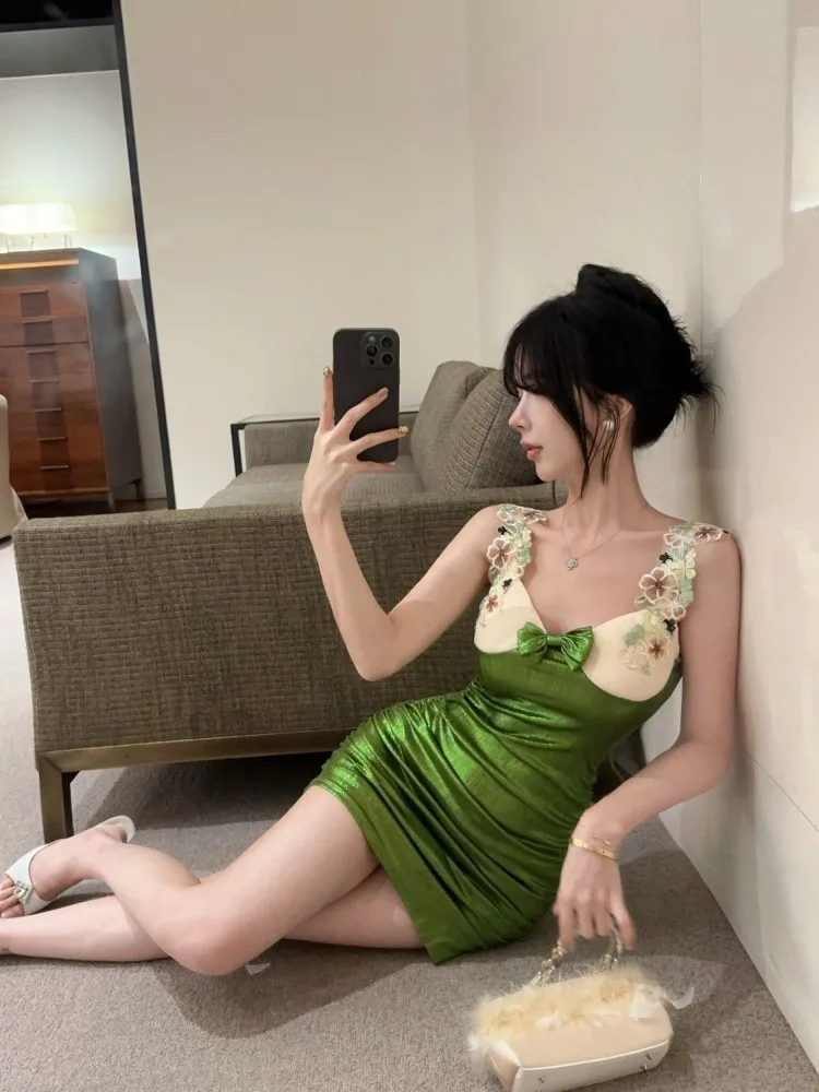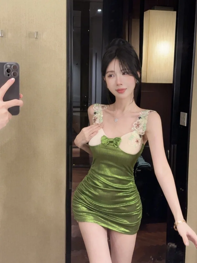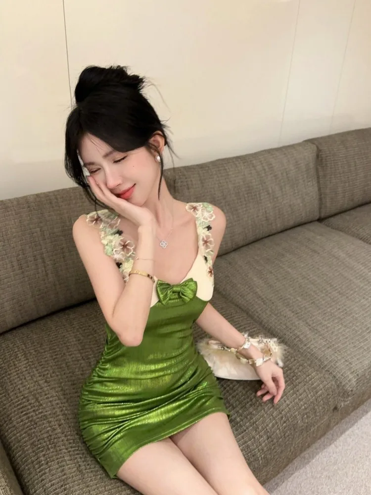 MQTIME - French Girl Dresses Slim Pleated Glossy Suspender Hip Skirt Women Thin Lace Edge Splicing Contrasting Color Vestido