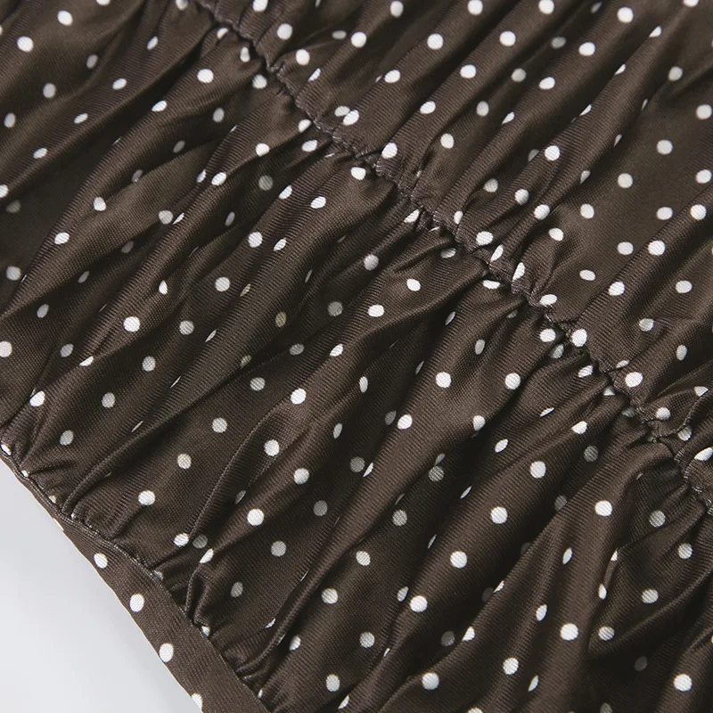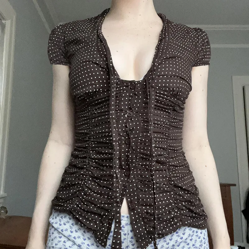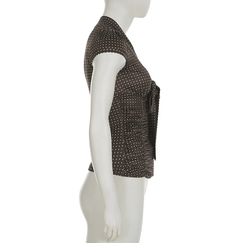 MQTIME - French lace up bow polka dot breasted short top with retro style, pleated waist, slimming effect, versatile short sleeved shirt