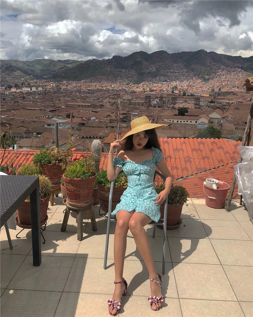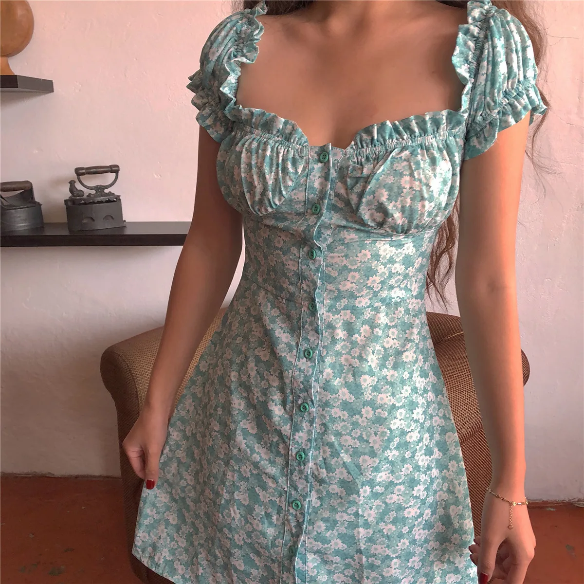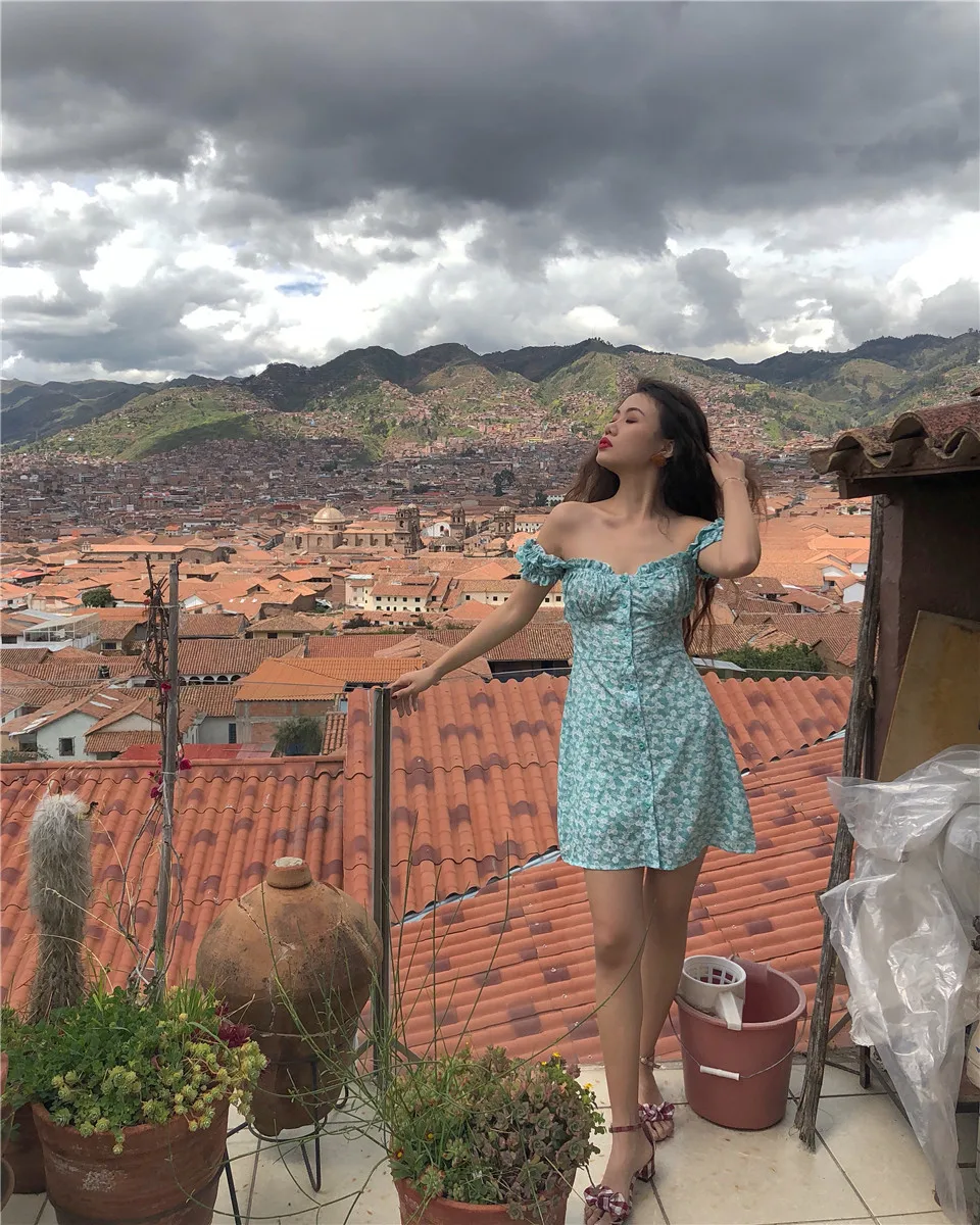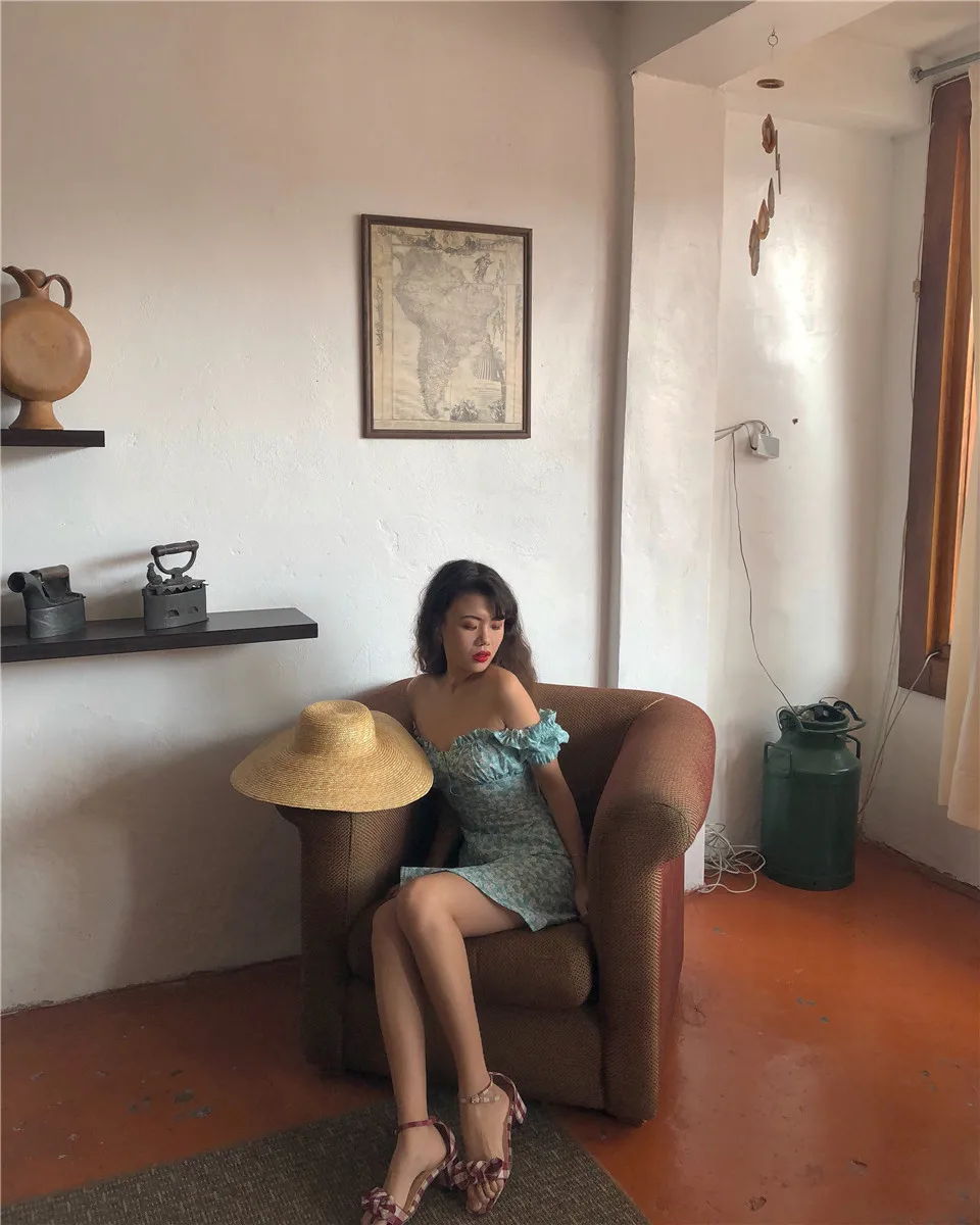 MQTIME - French Niche, One Line Collar, Two Wear Holiday Style Green Floral Dress, Summer 2024
