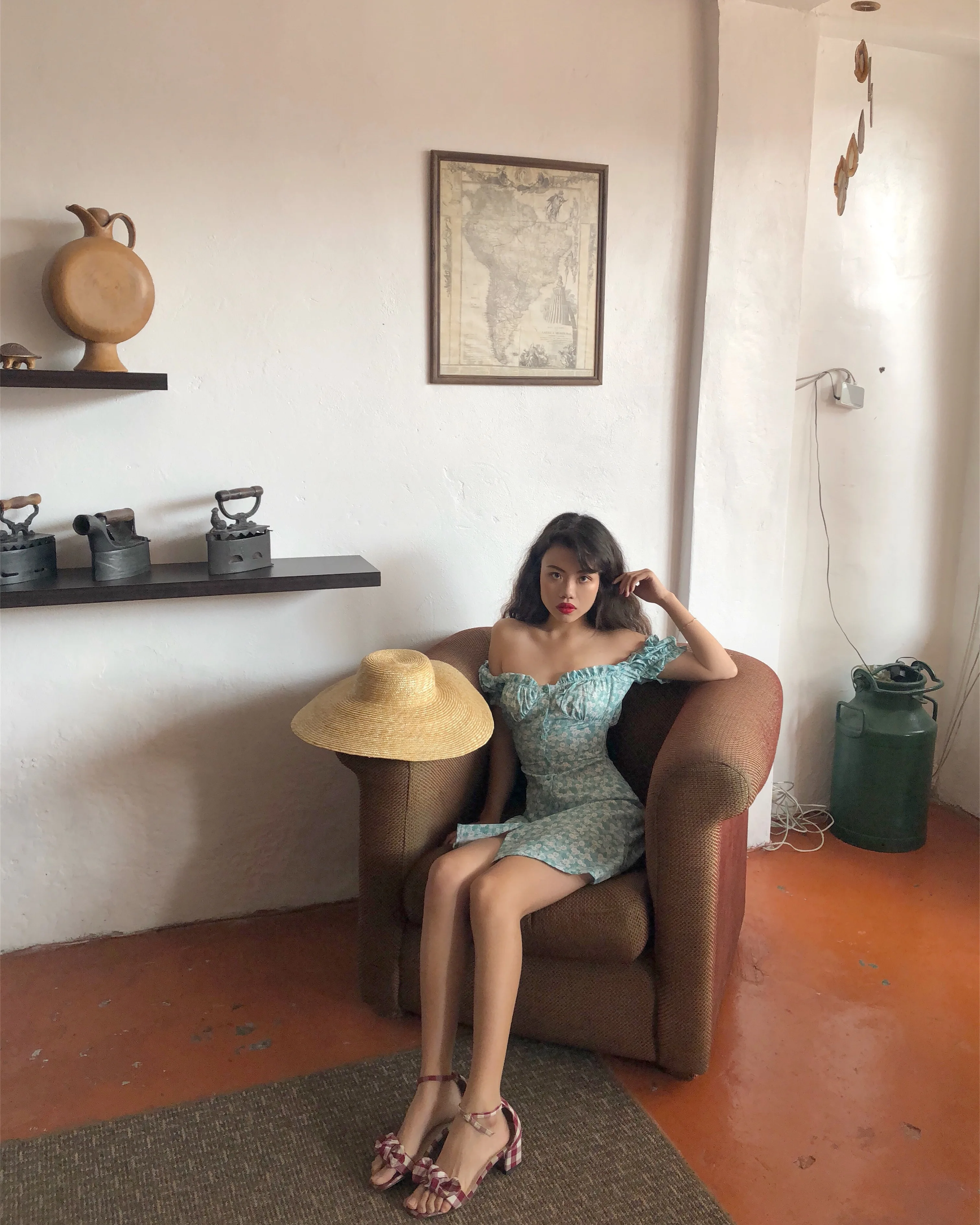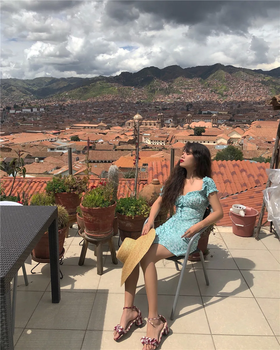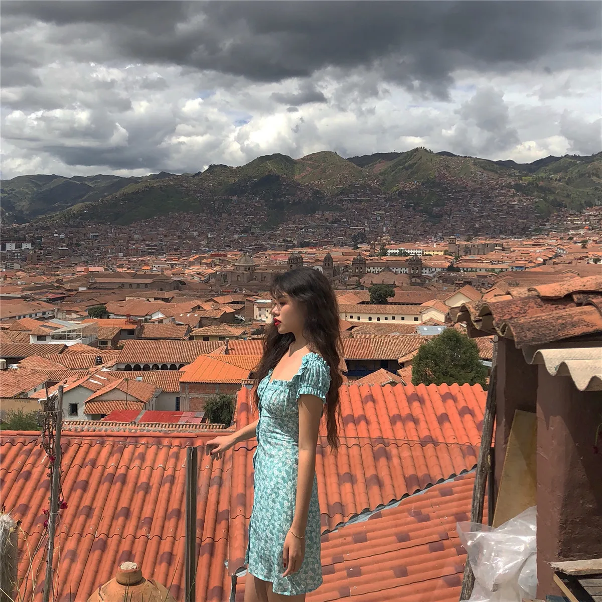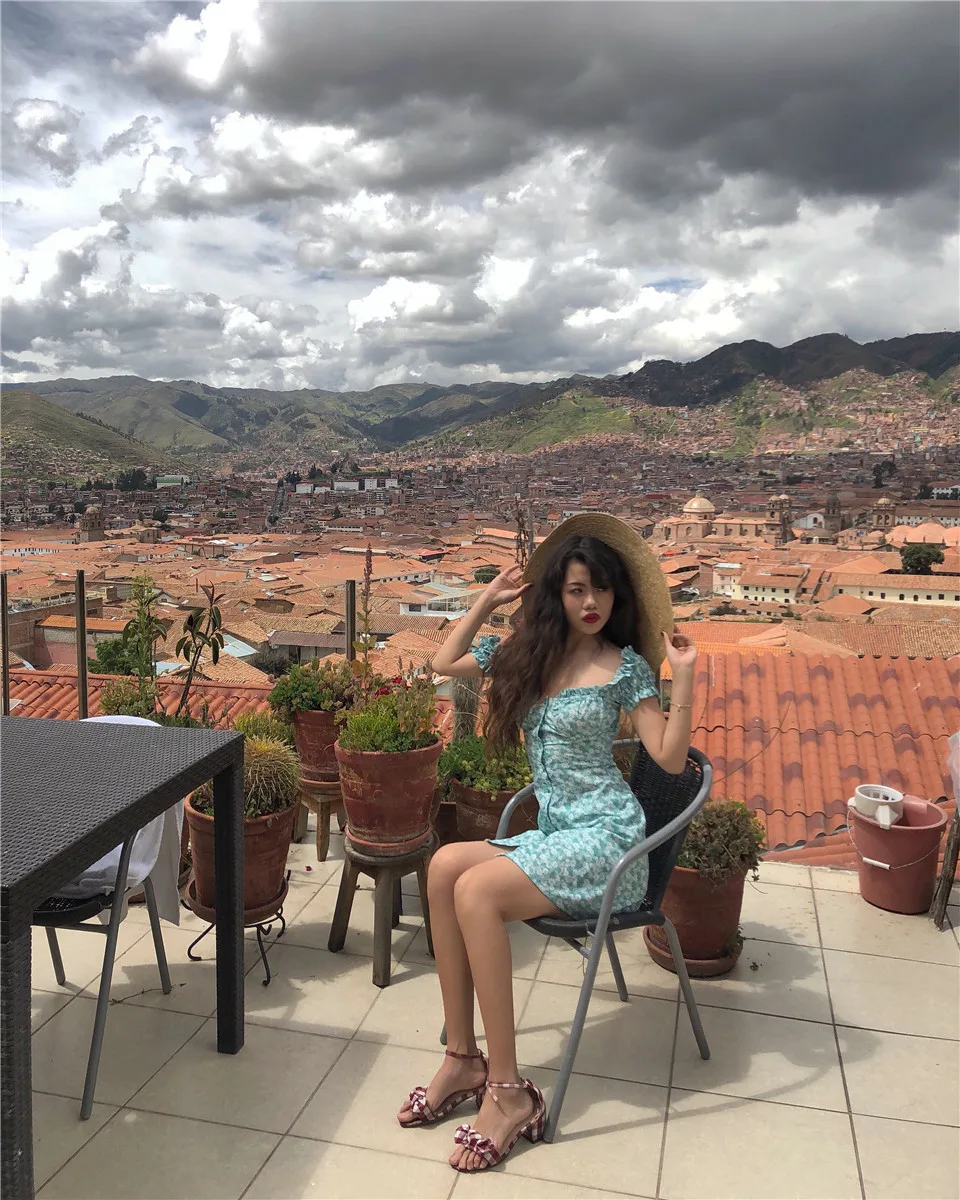 MQTIME - French Niche, One Line Collar, Two Wear Holiday Style Green Floral Dress, Summer 2024