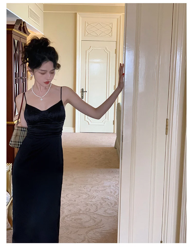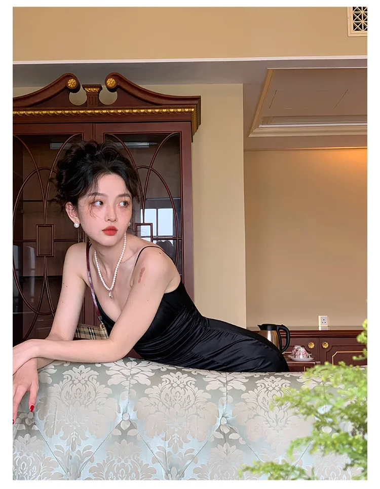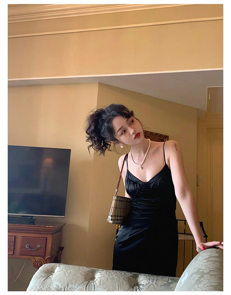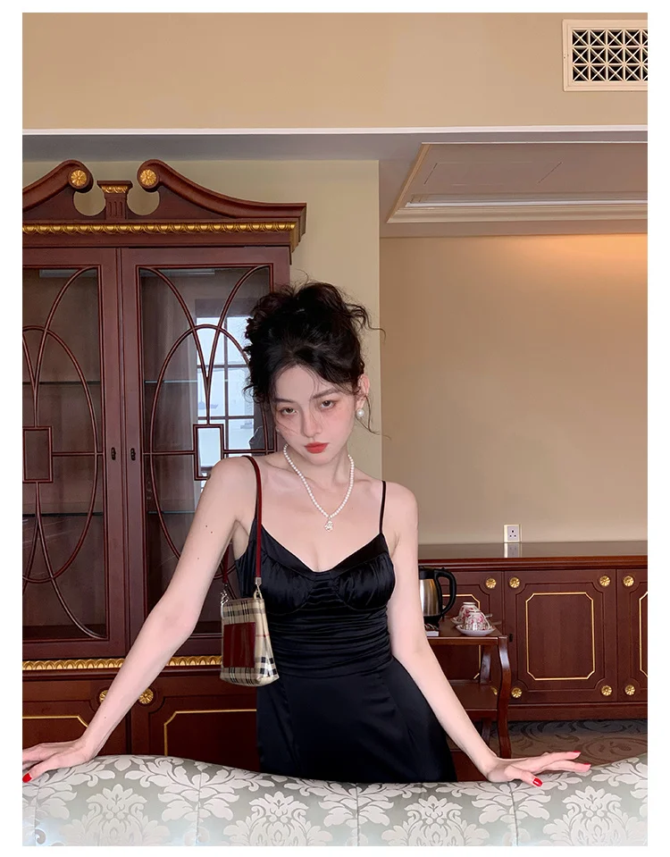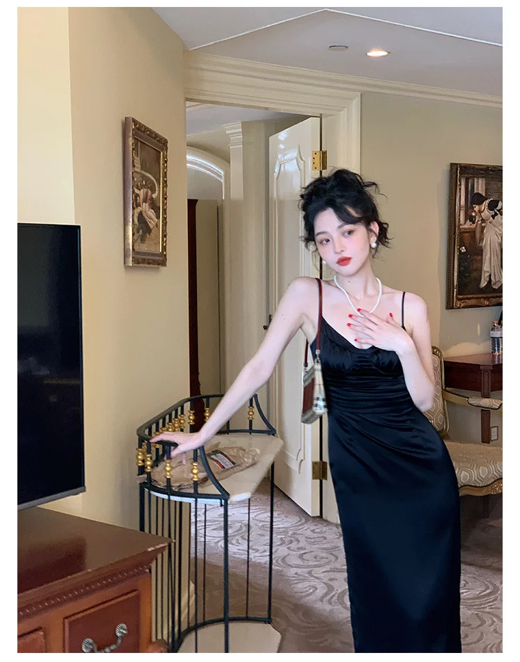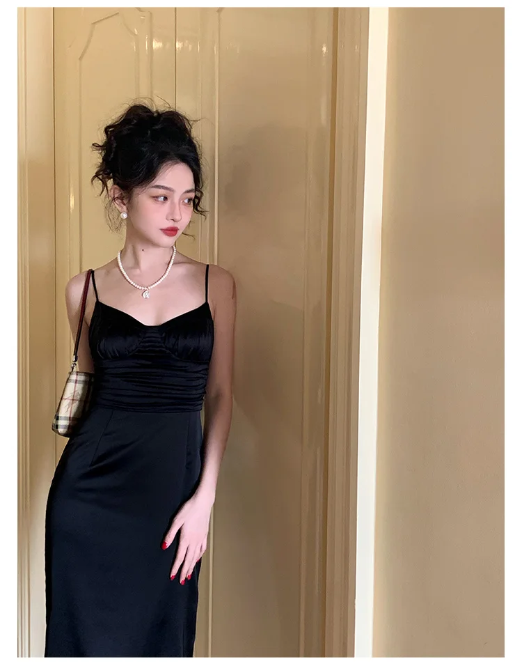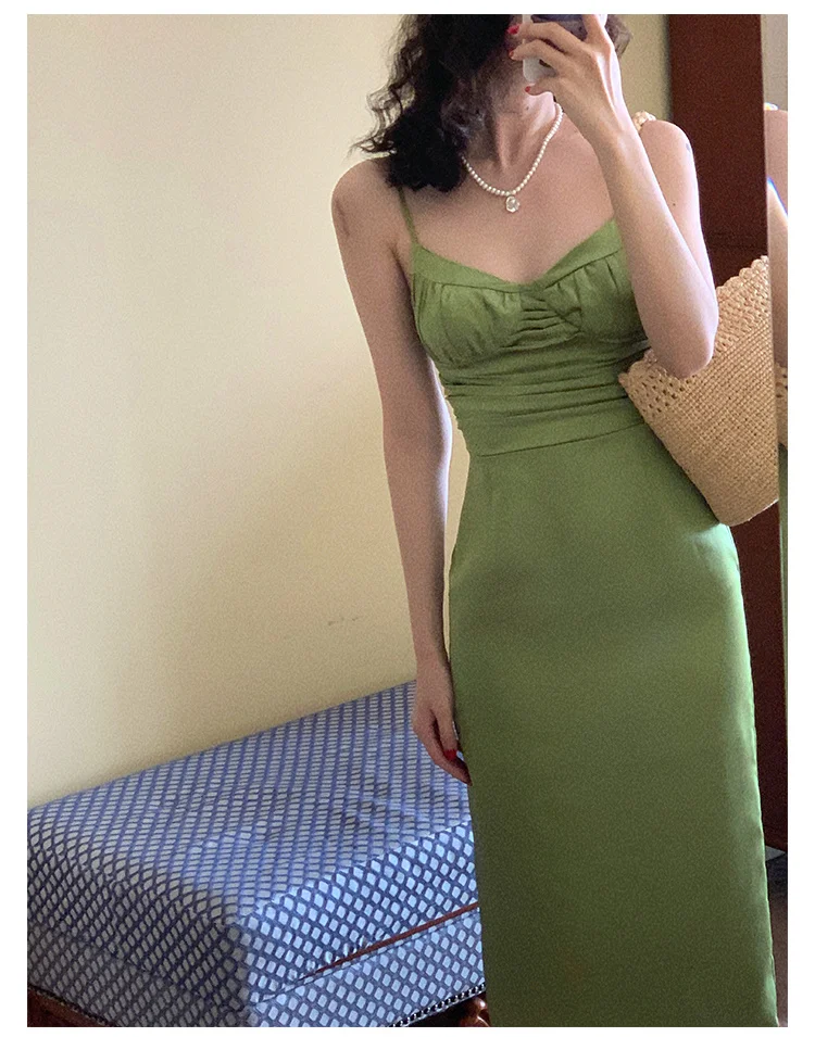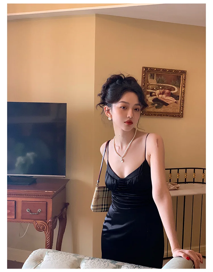MQTIME - French Sexy V-neck Suspended Dress 2024 Spring/Summer New High Waist Slim Pleated Slim Fit Dress