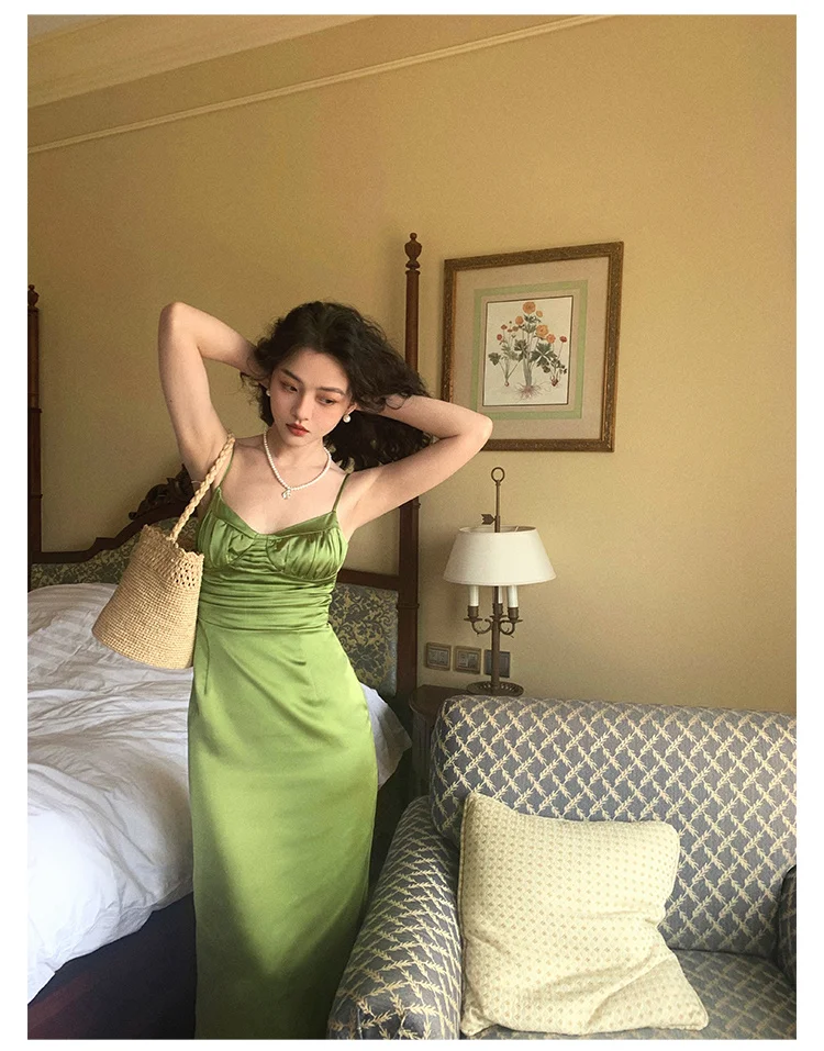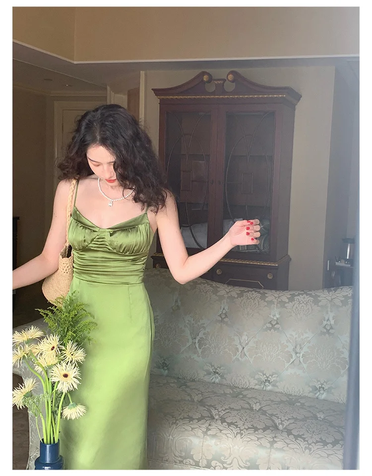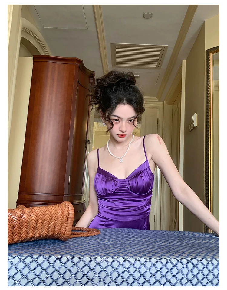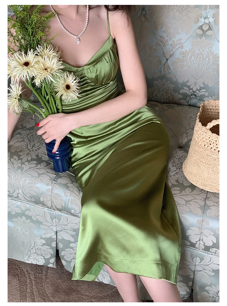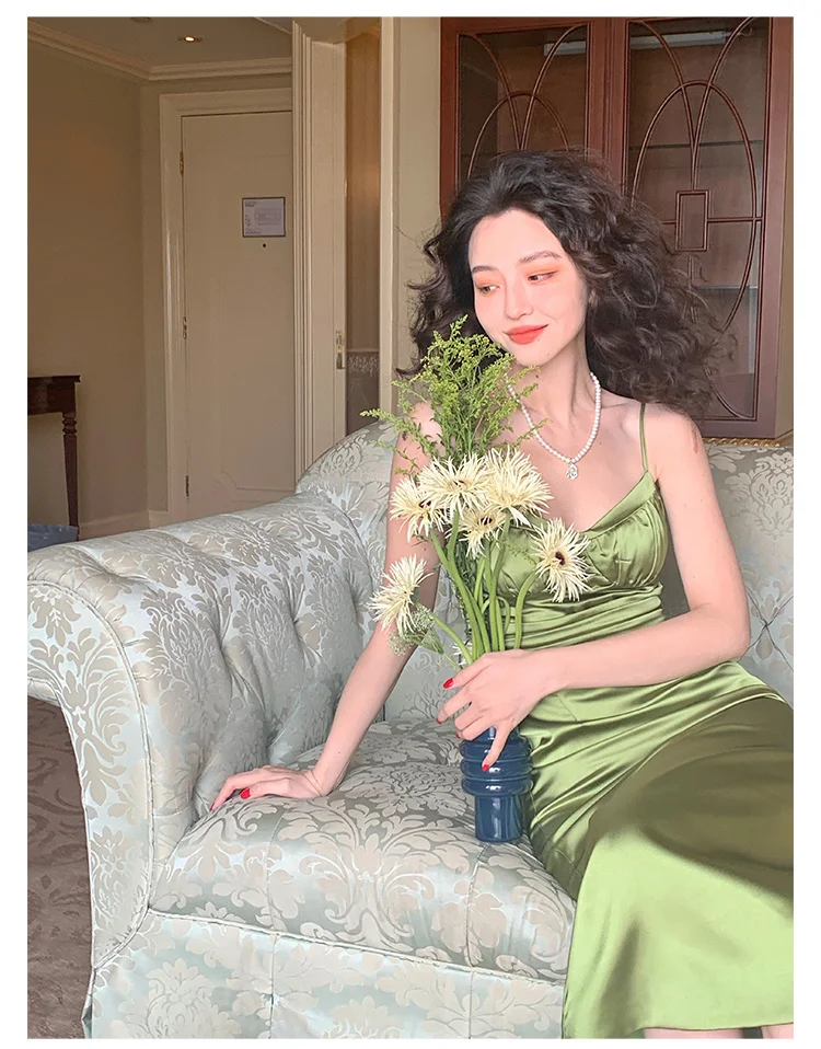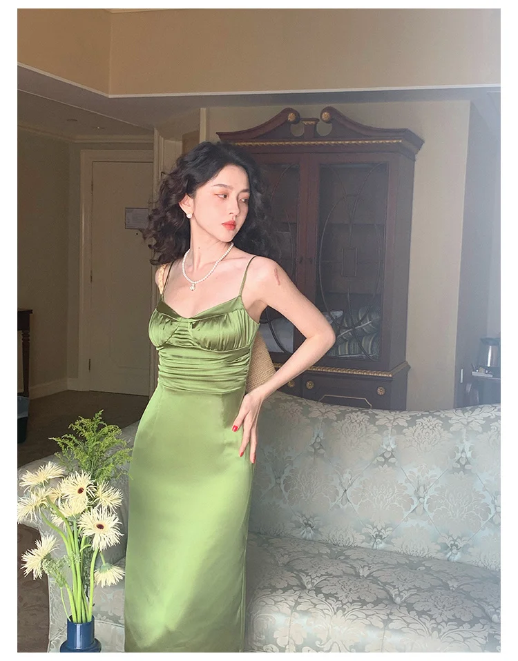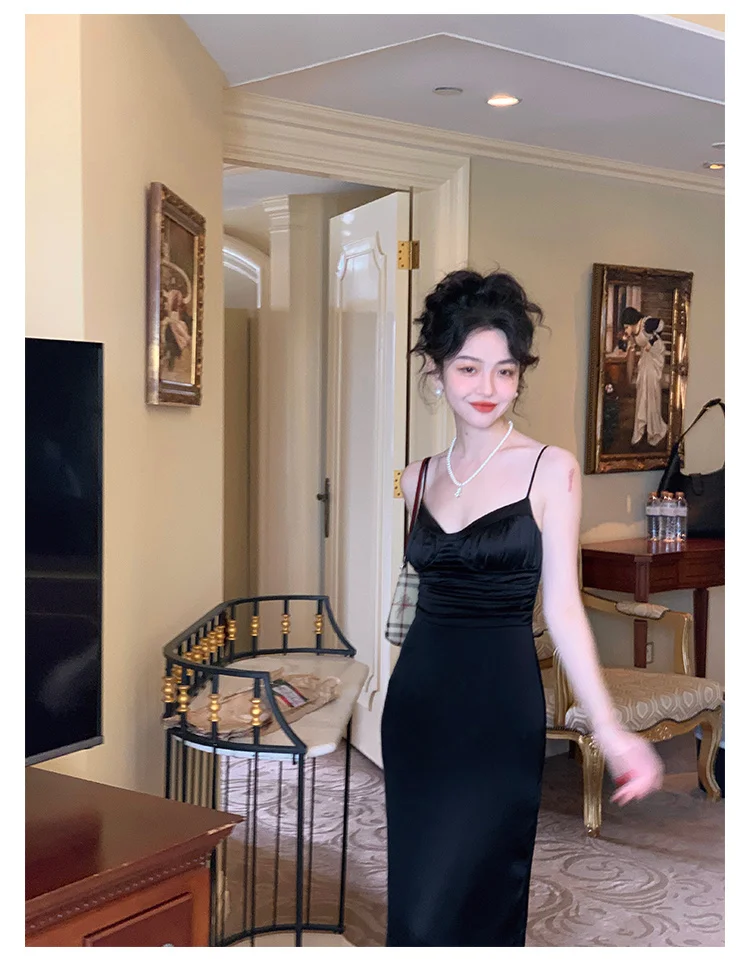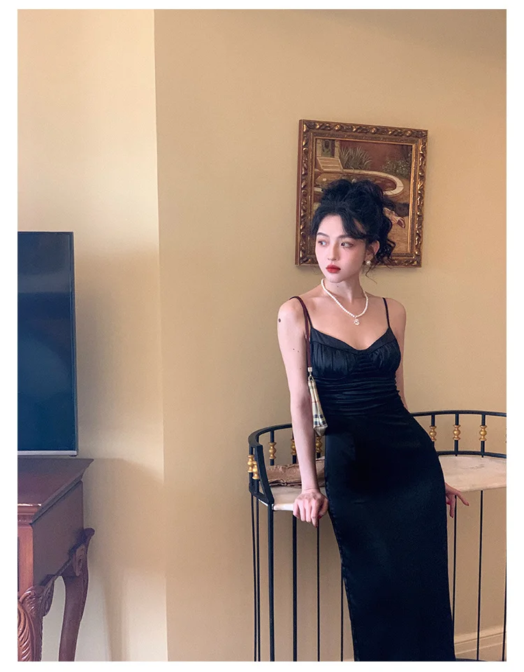 MQTIME - French Sexy V-neck Suspended Dress 2024 Spring/Summer New High Waist Slim Pleated Slim Fit Dress