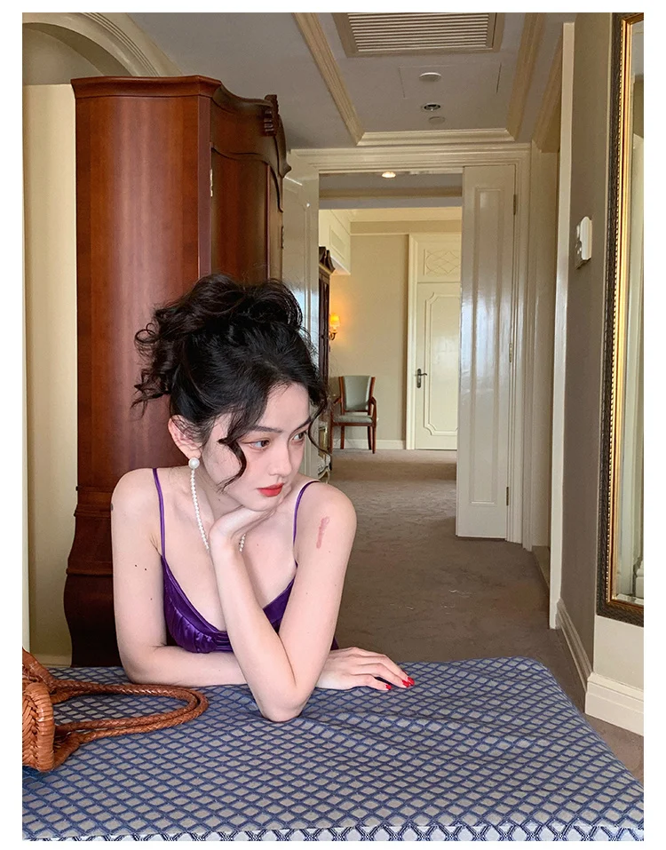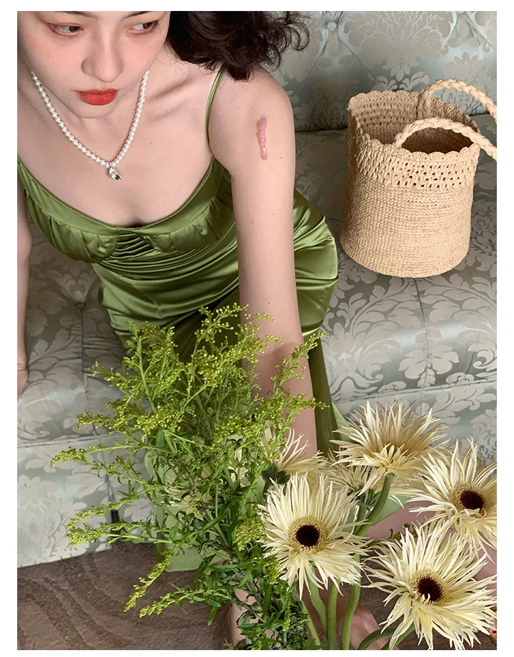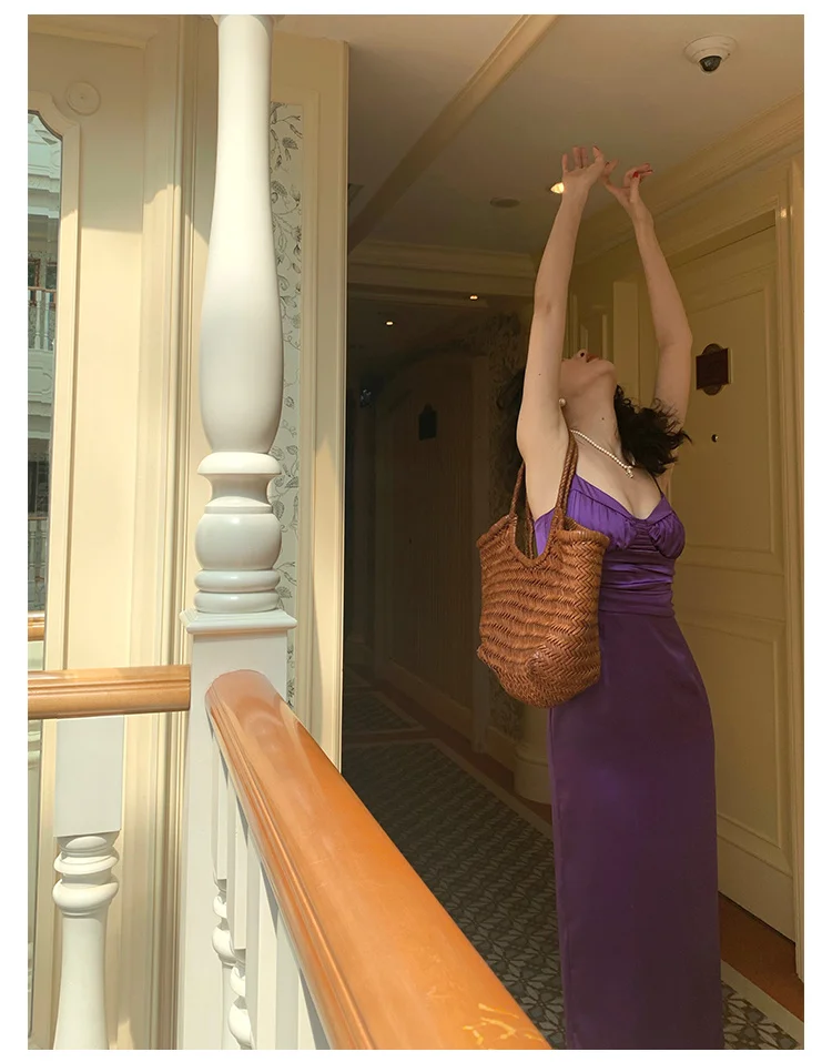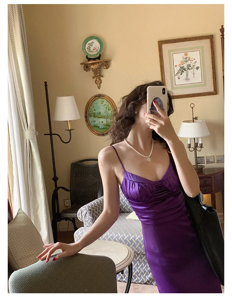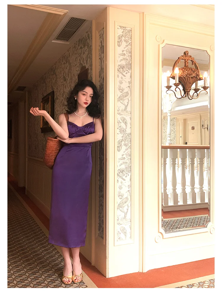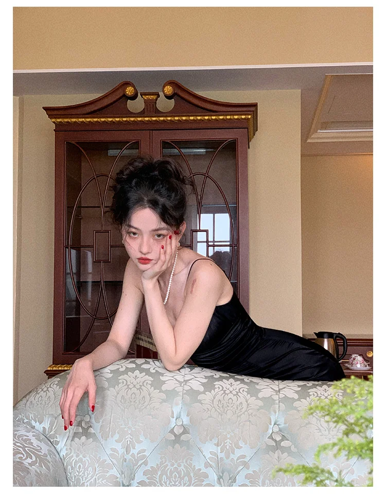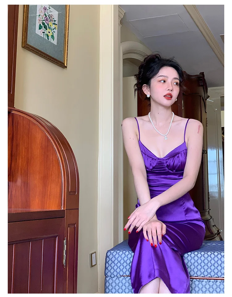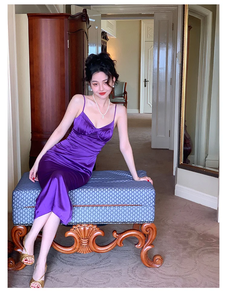 MQTIME - French Sexy V-neck Suspended Dress 2024 Spring/Summer New High Waist Slim Pleated Slim Fit Dress
