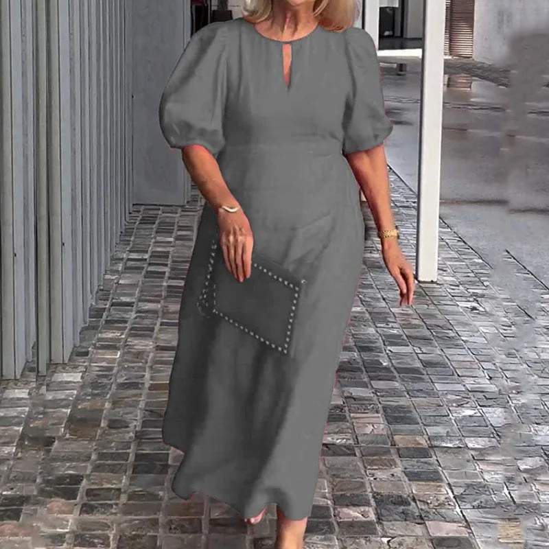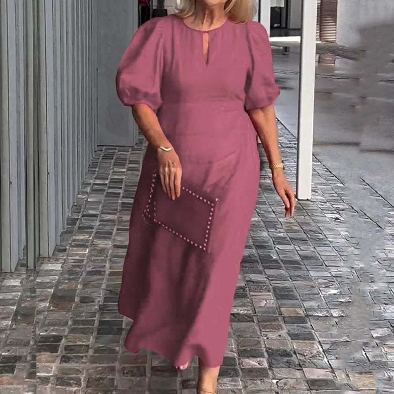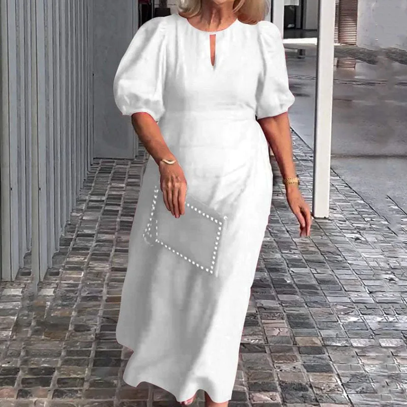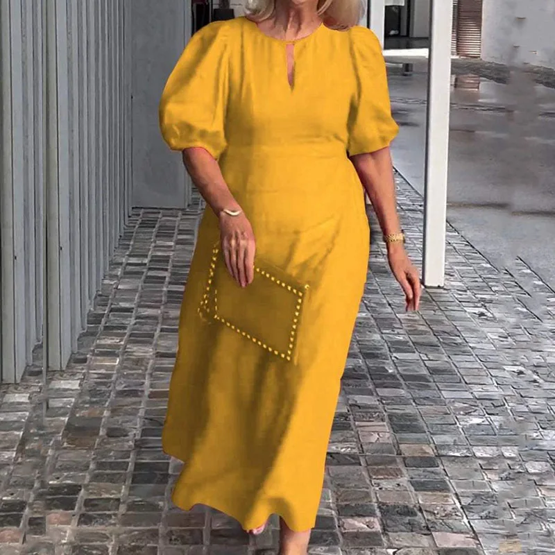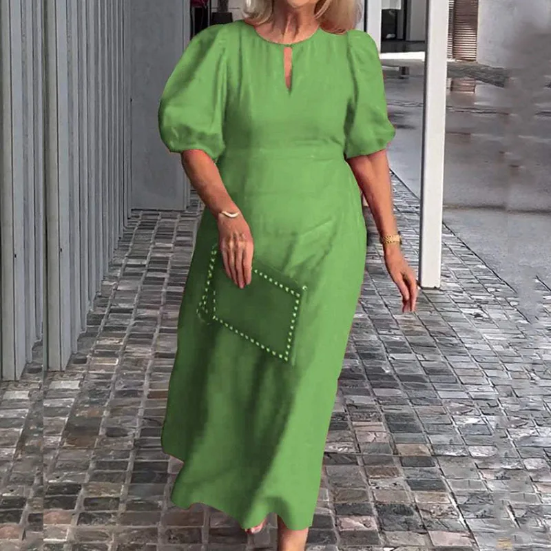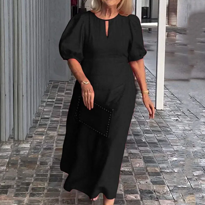 MQTIME - French Solid Hollow Out Crew Neck Long Dress Summer 2024 Puff Sleeve High Waist Dresses Women Elegant Draped Solid Party Dress