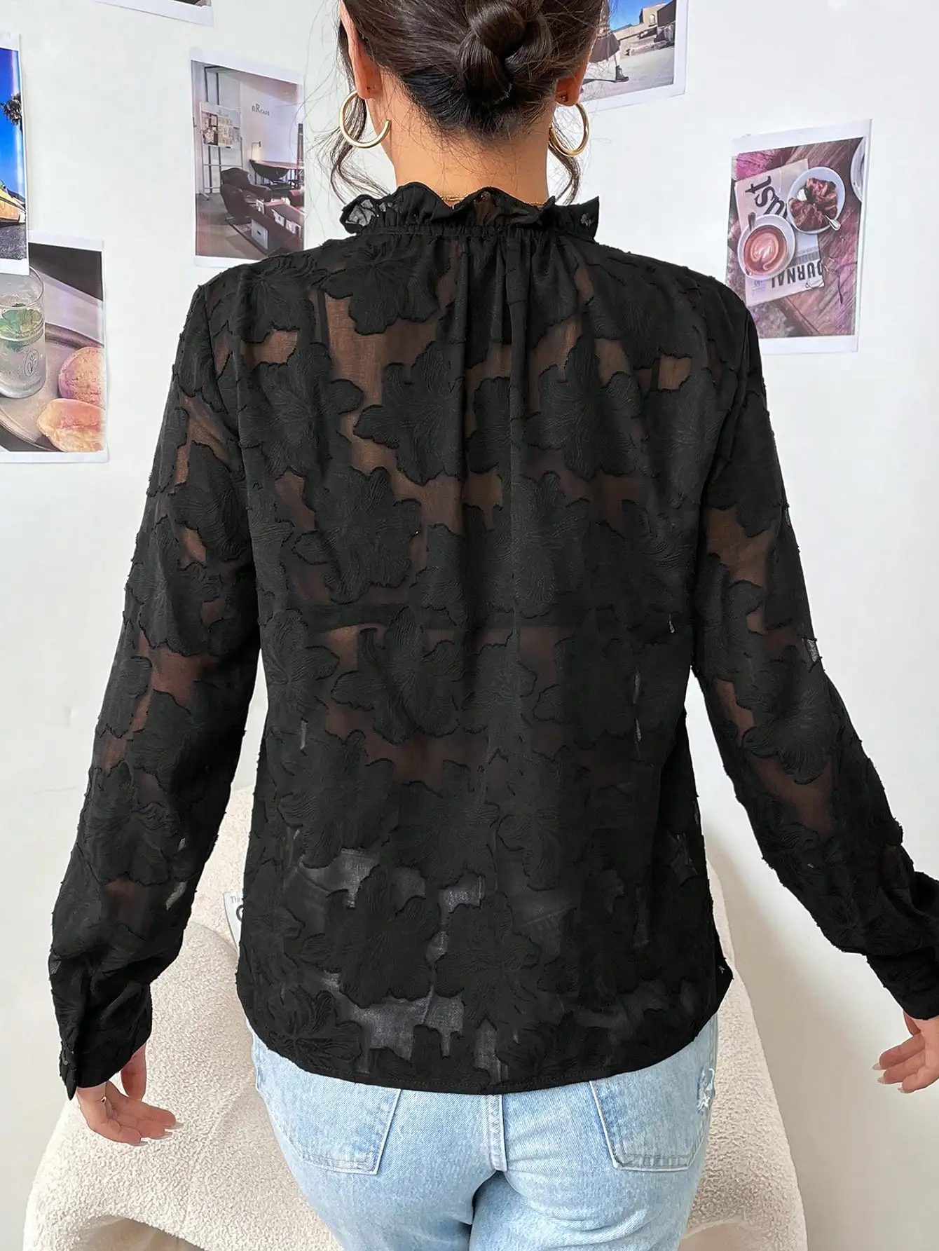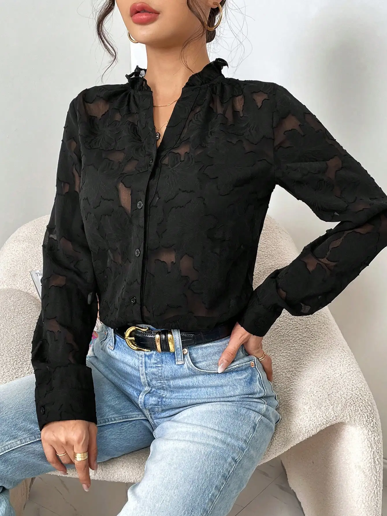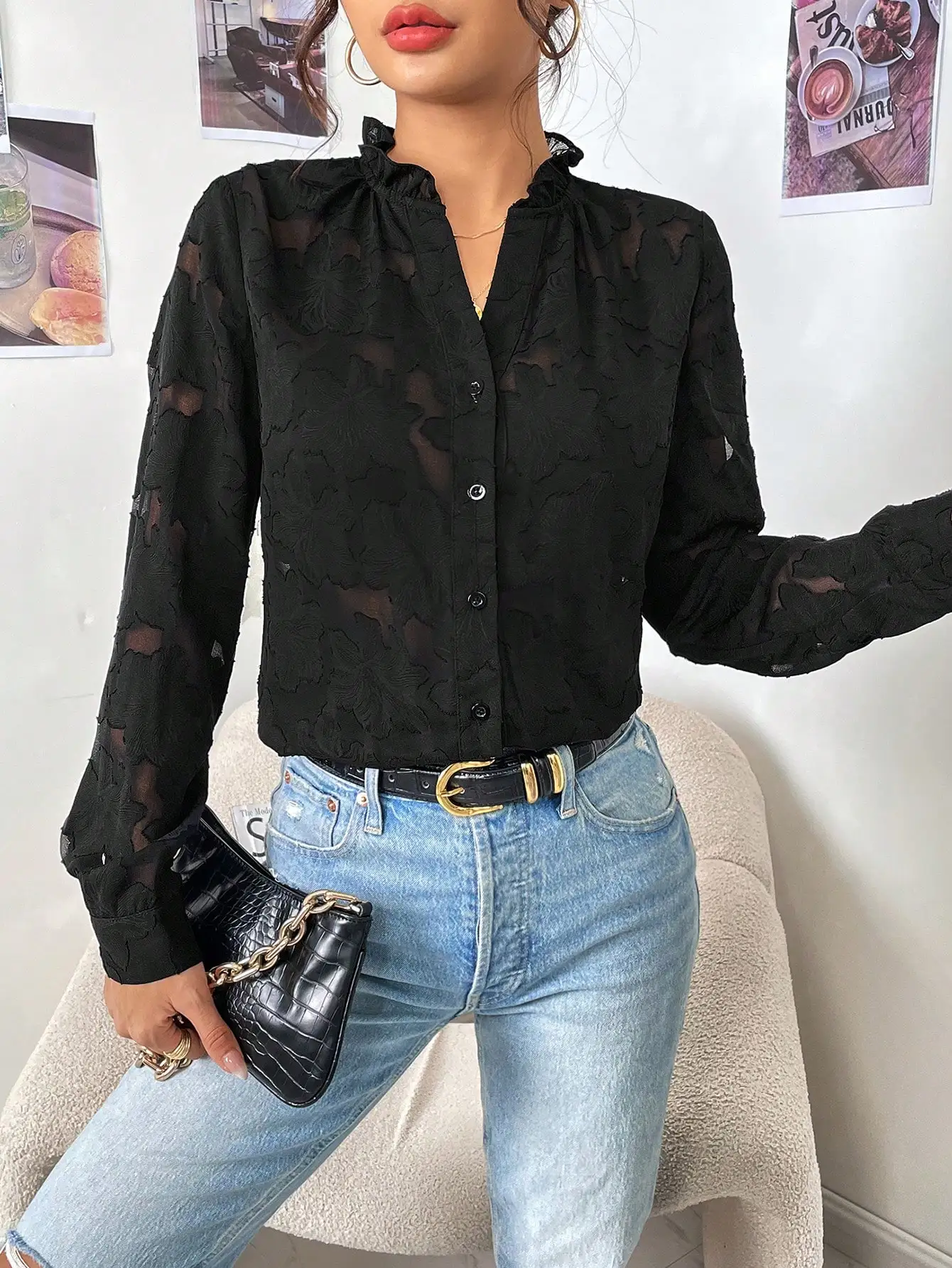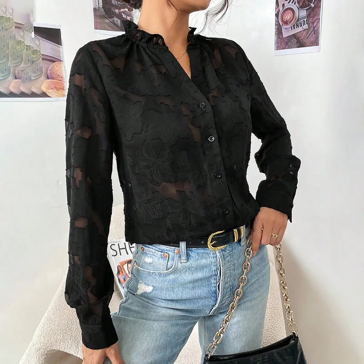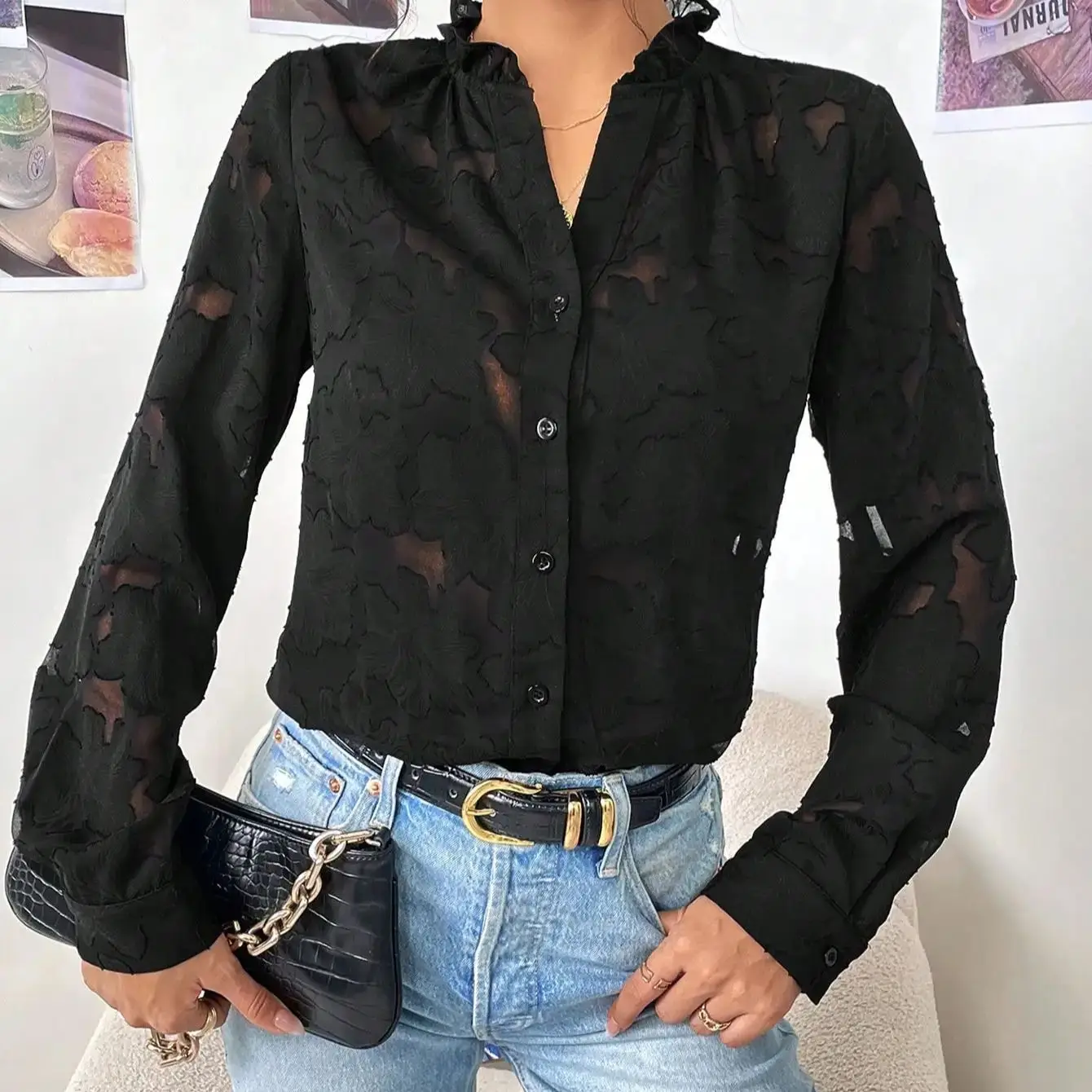 Mqtime French Temperament Black V-neck Jacquard Shirt Female Spring and Autumn New Style Pure Wind Sexy Lace Cutout Top