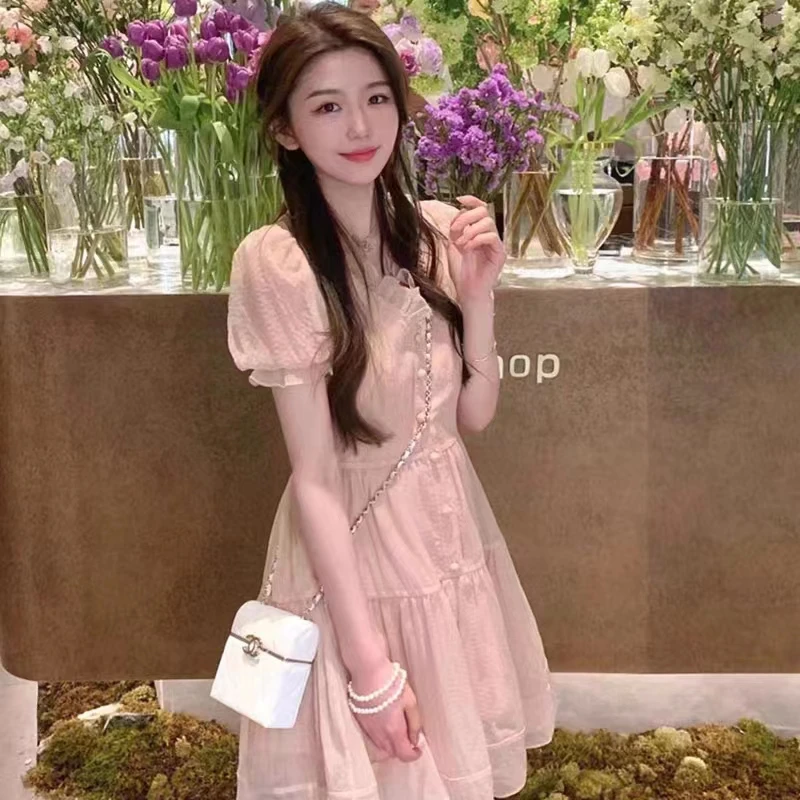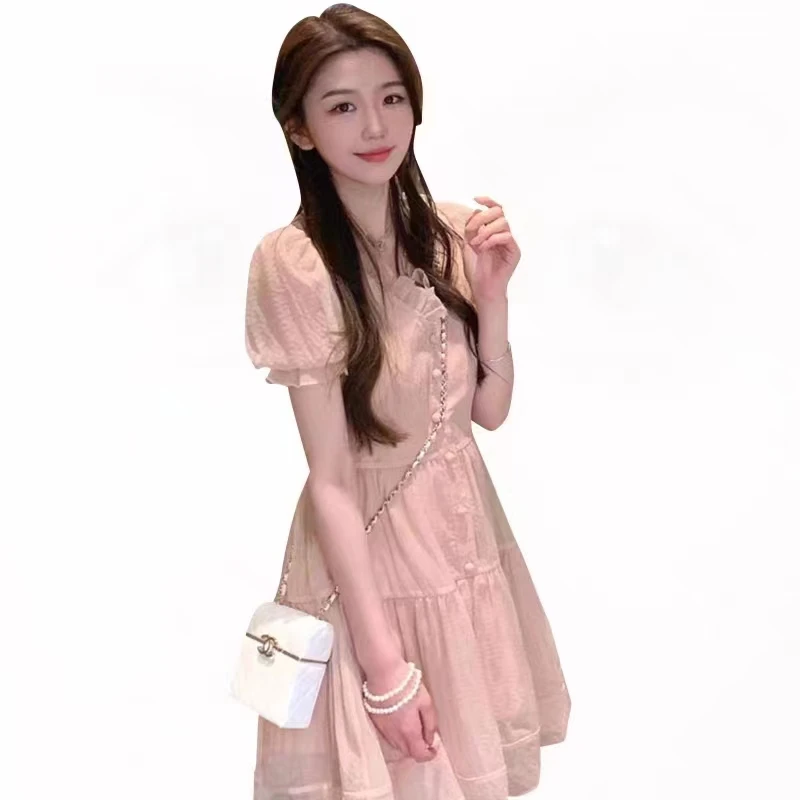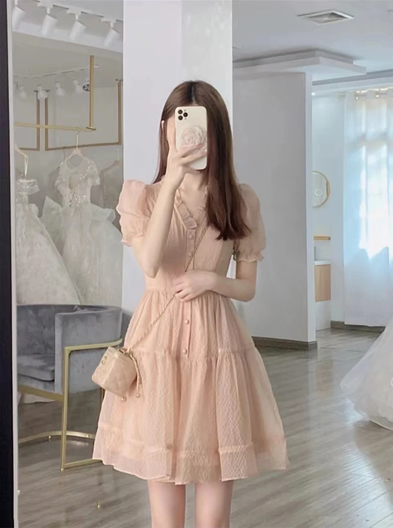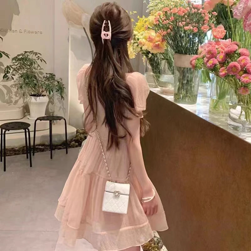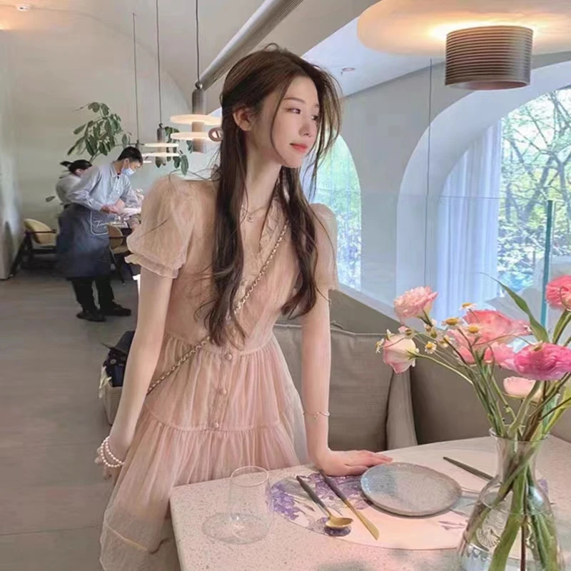 MQTIME - French V-neck Pink Sweet Women's Dress Summer Dress Fairy Dress Pure Desire ins Yarn Dress Women's Dress Short Dress