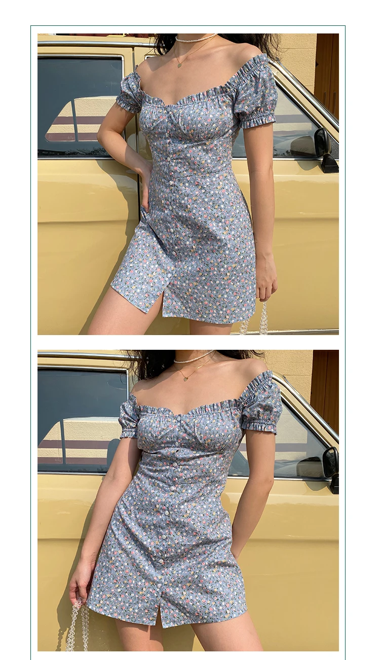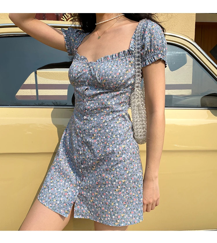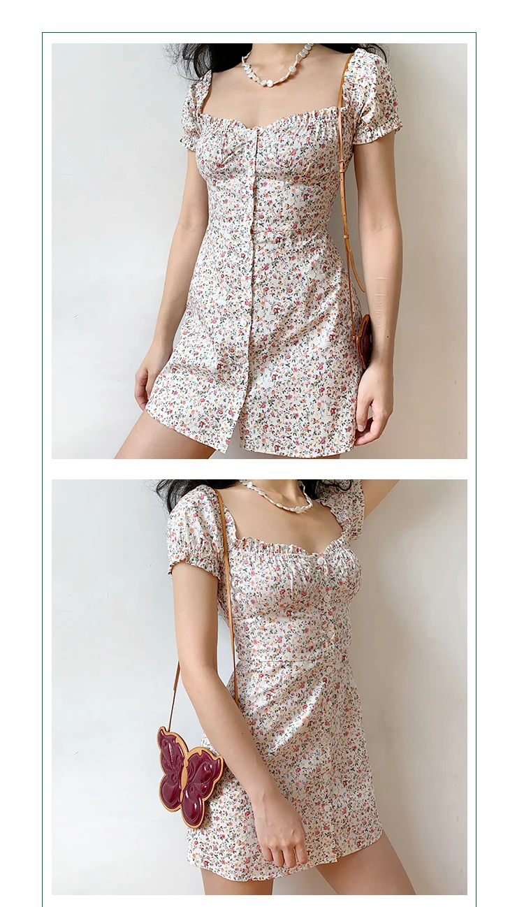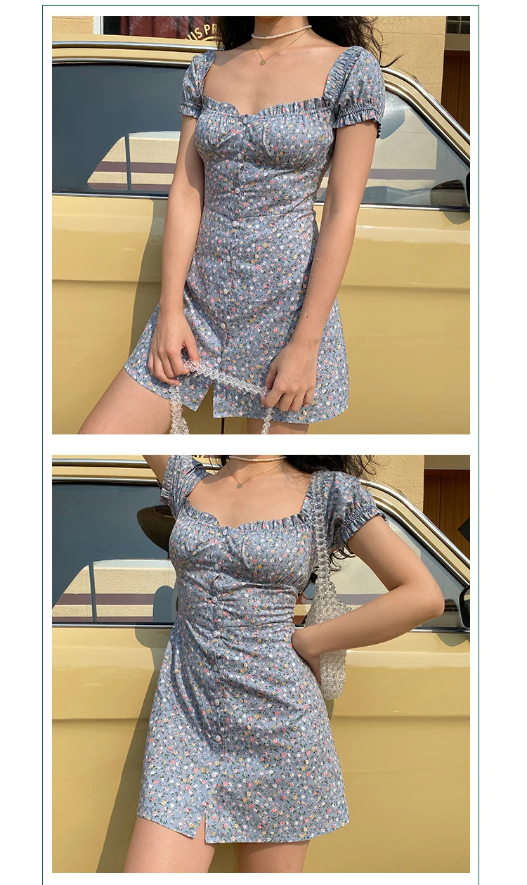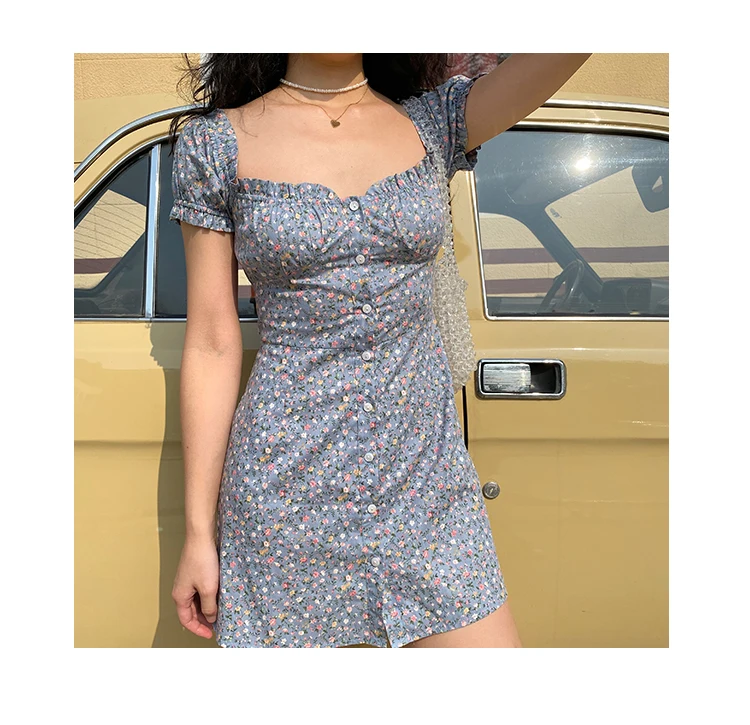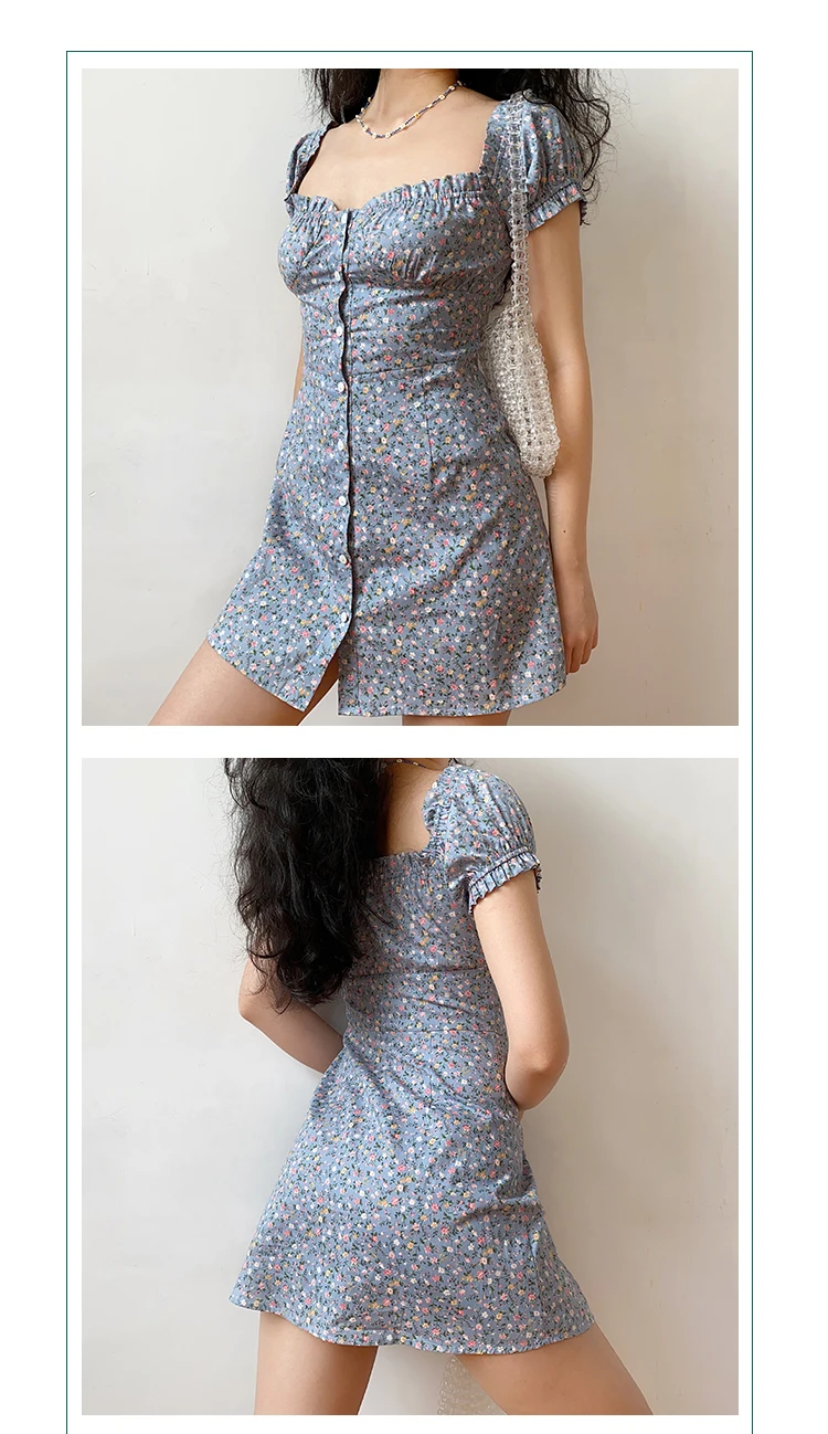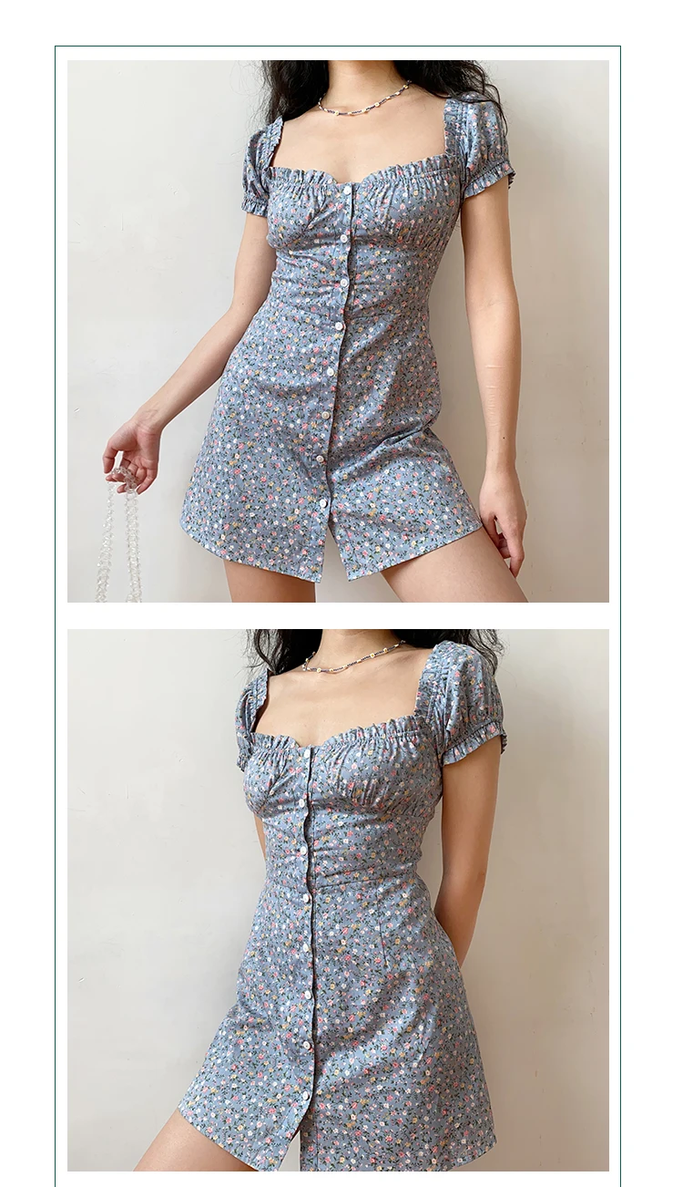 MQTIME - Fresh Floral Single-breasted Puff Sleeve Slim Dress A-line Skirt Female