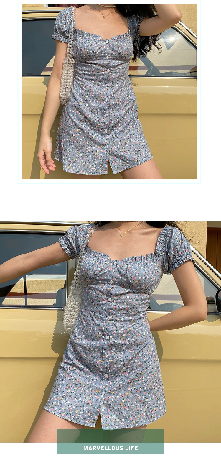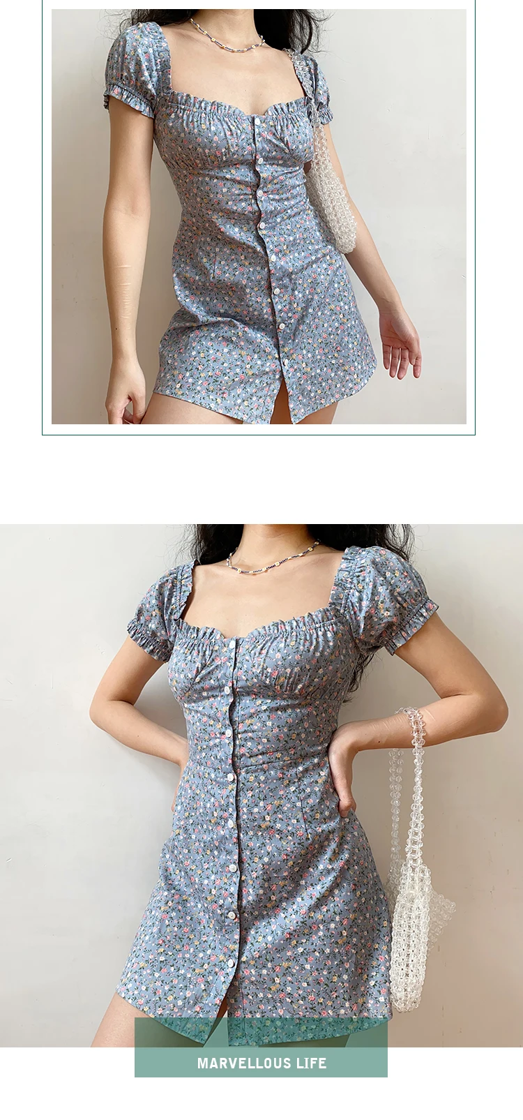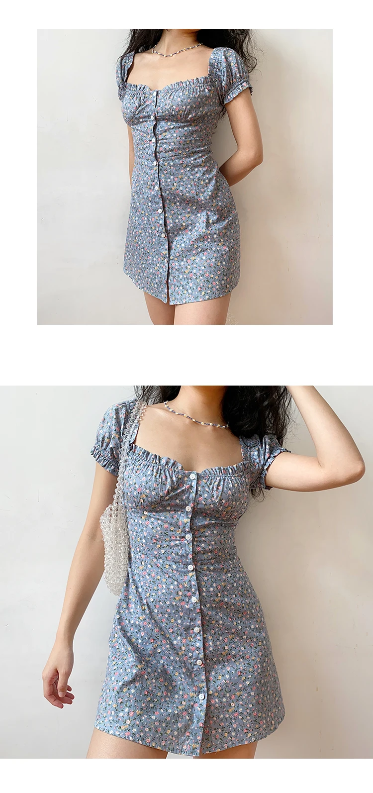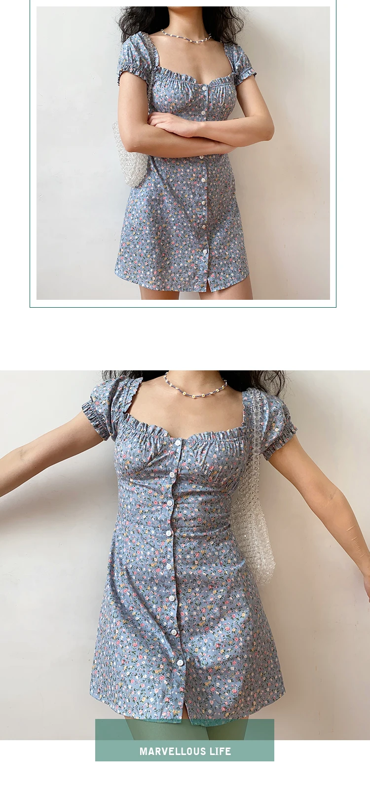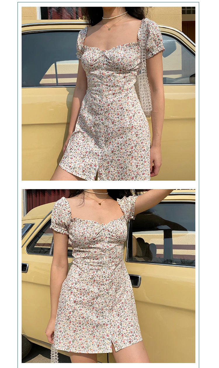 MQTIME - Fresh Floral Single-breasted Puff Sleeve Slim Dress A-line Skirt Female